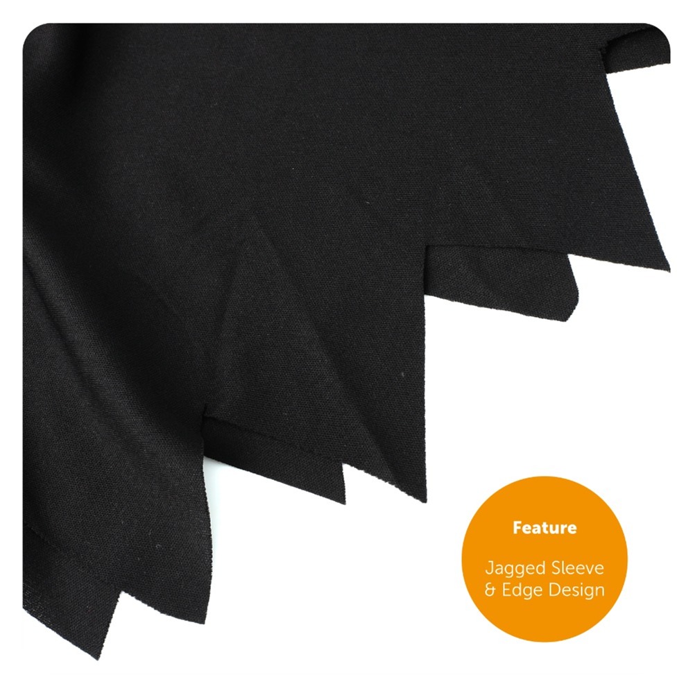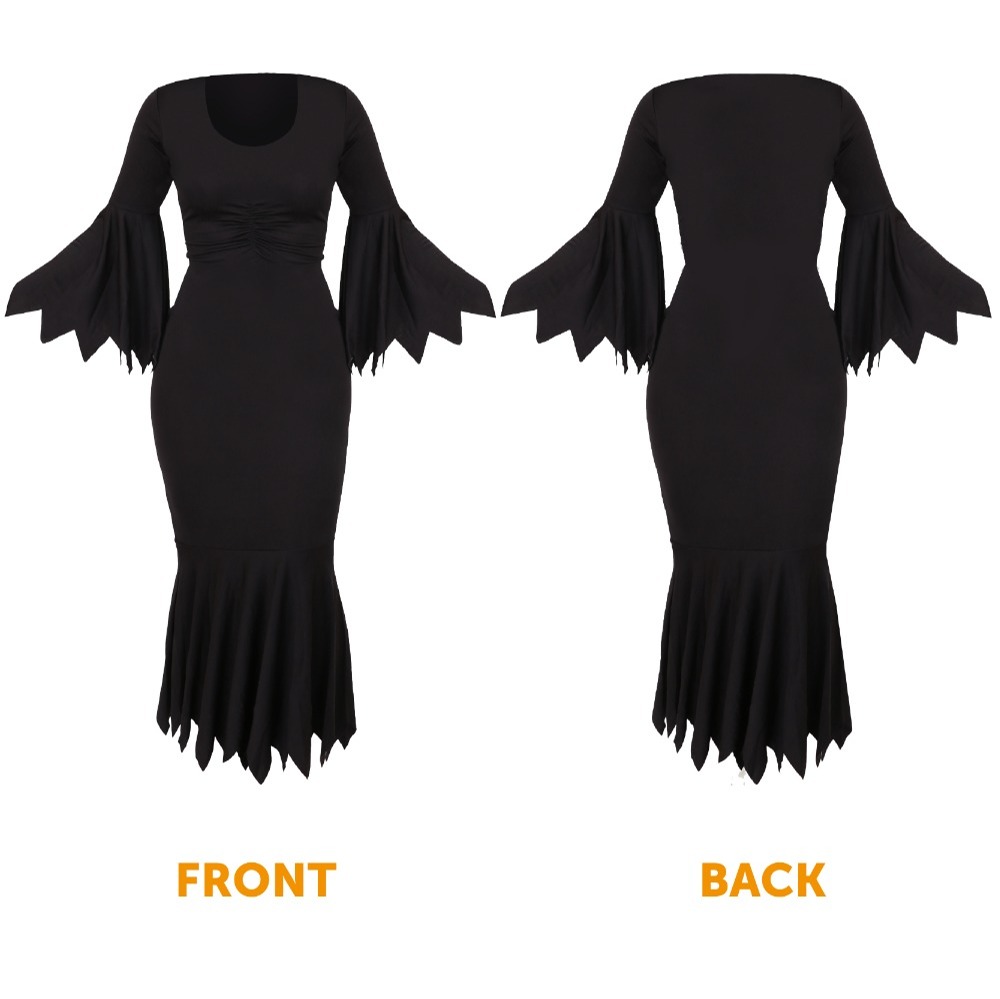 - Long Black Dress: Features tattered edges for a ghostly, reaper-like appearance — perfect for a chilling Halloween vibe.