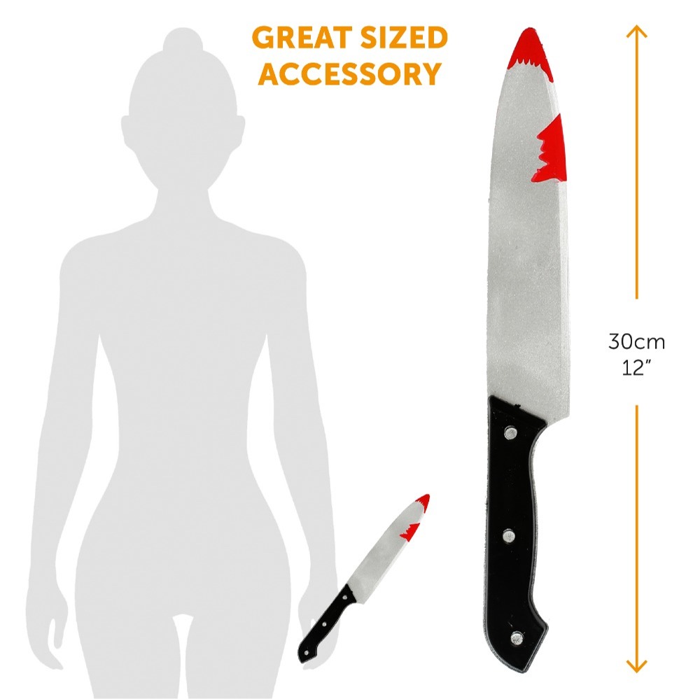 - Plastic Bloody Knife Prop: Measures 30cm (12") with blood-splatter detailing for an authentic horror look.