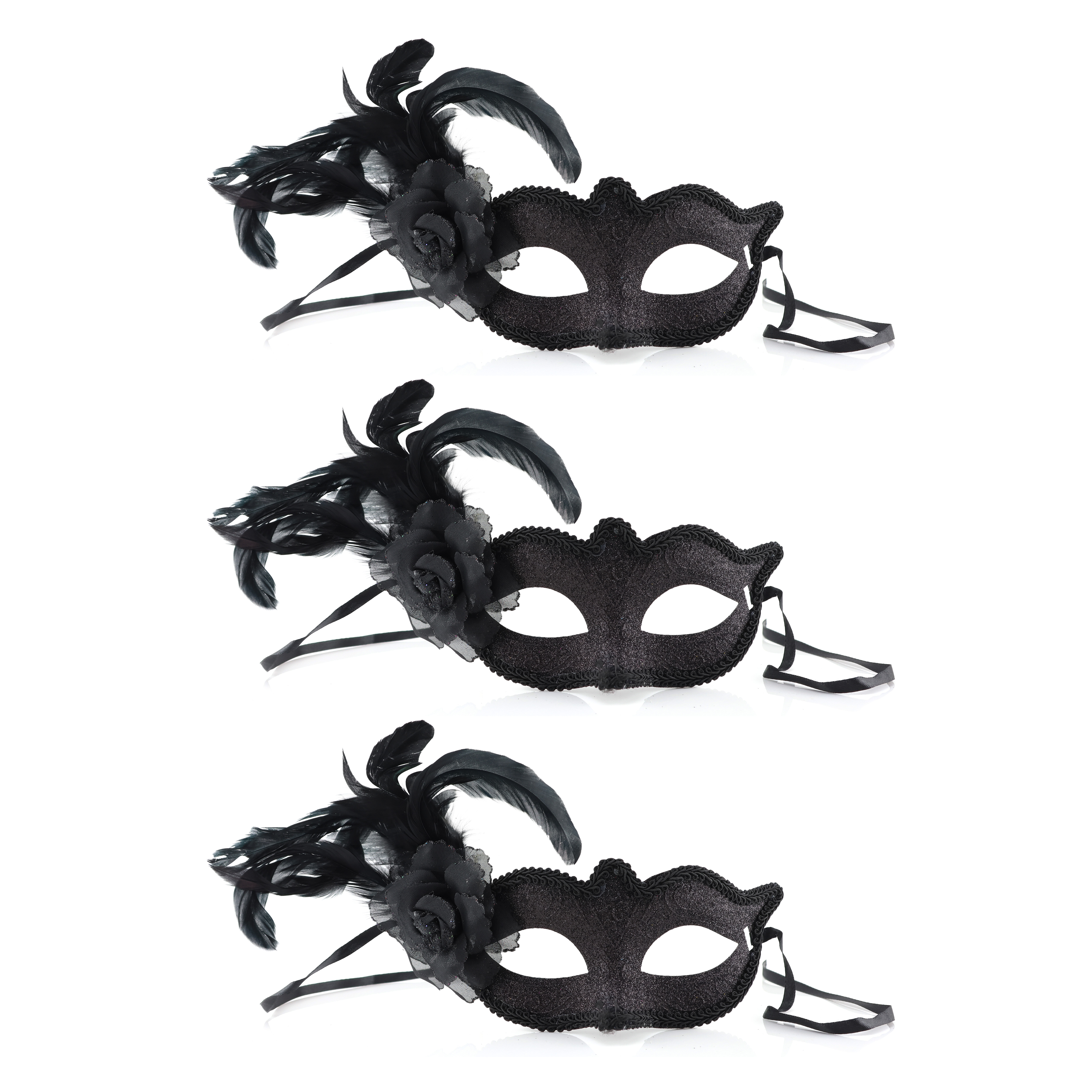 Elegant Black Feather Masquerade Mask – Venetian Style with Lace, Floral Accent & Satin Ties £4.99