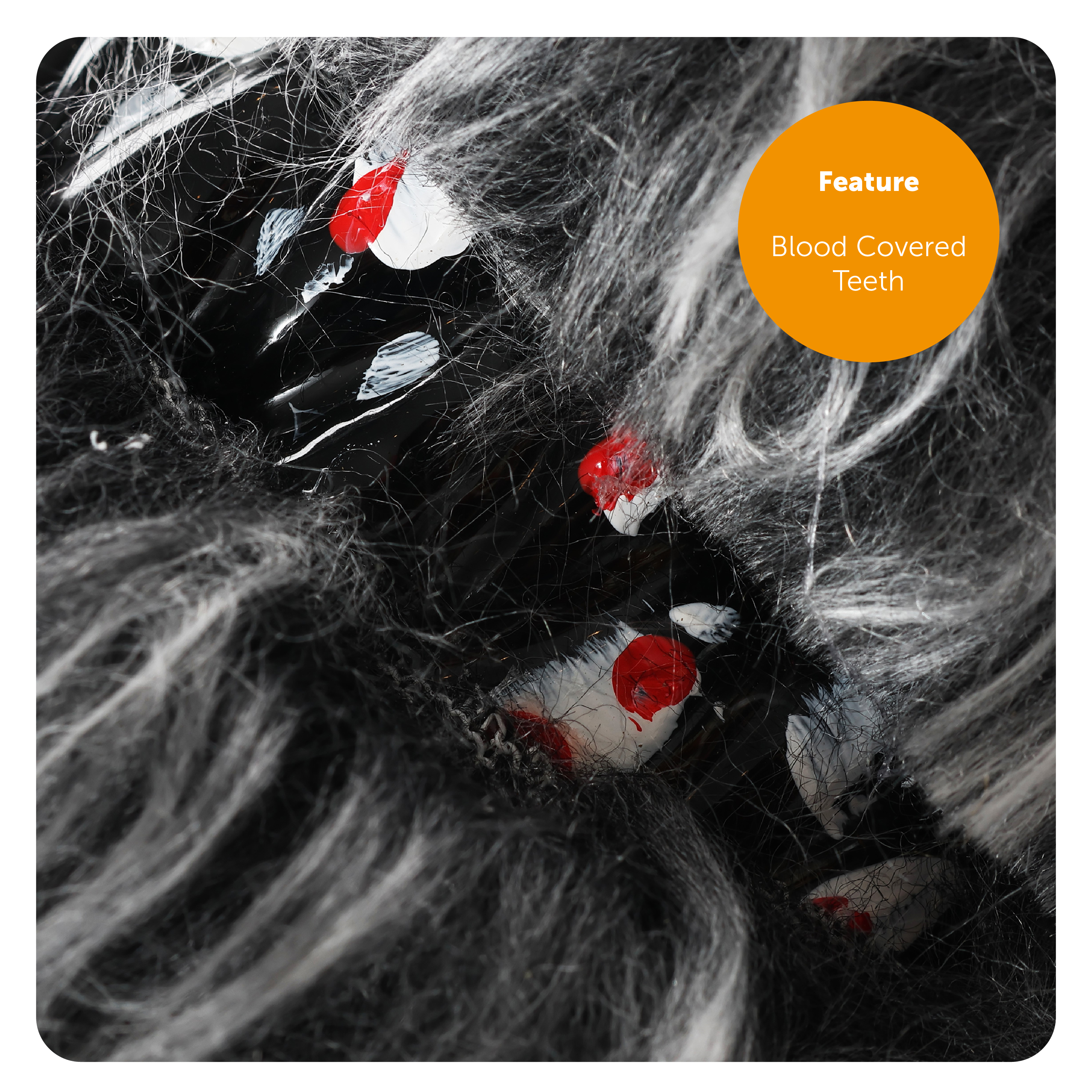MASK DETAILS: This Halloween Rabbit Mask is covered in Grey Faux Fur with tall, poseable Ears, detailed with blood covered Teeth and attached to a comfortable elasticated strap!