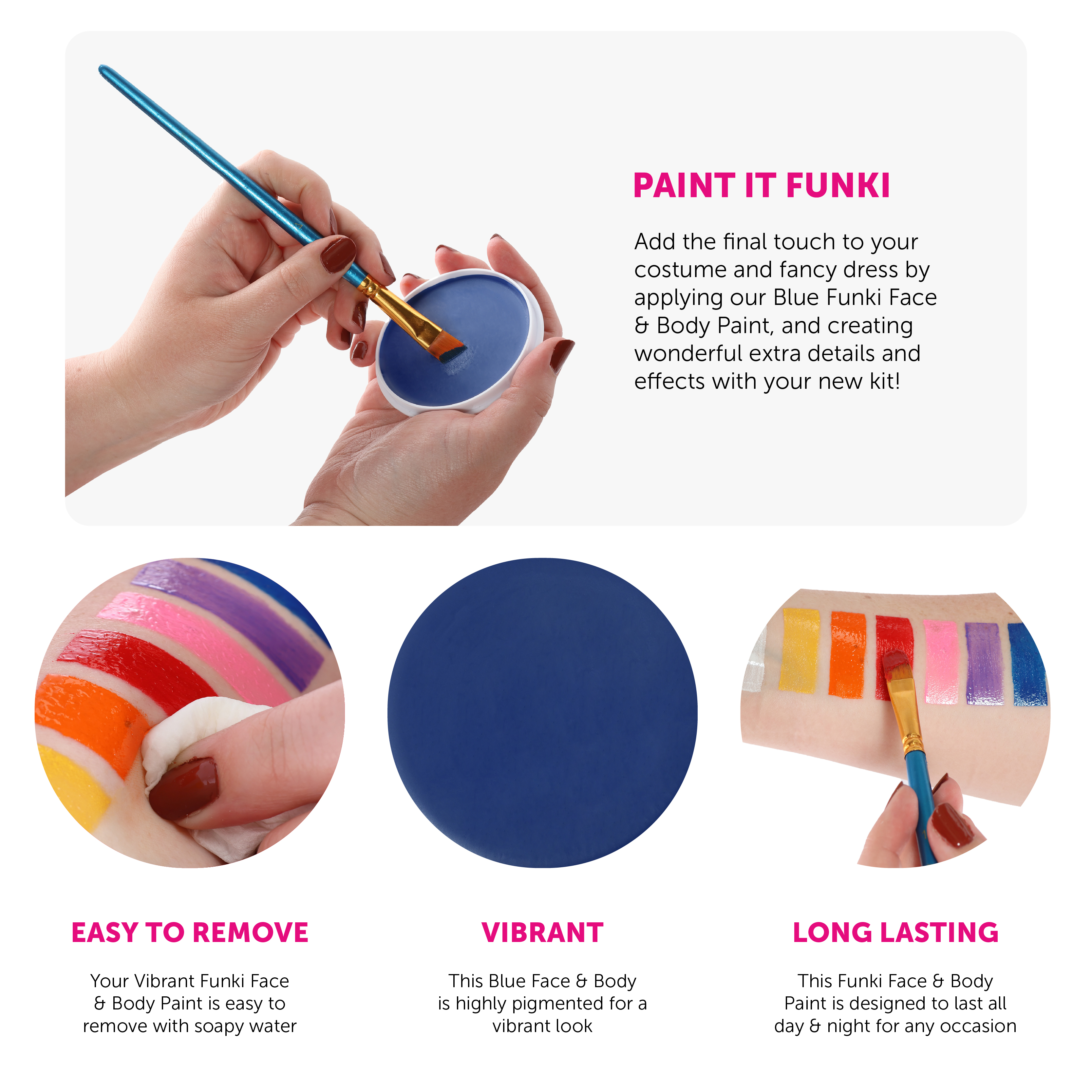 - BLUE FUNKI FACE & BODY PAINT: Add the final touch to your costume and fancy dress by applying our Blue Funki Face & Body Paint and creating wonderful extra details and effects with your new kit!