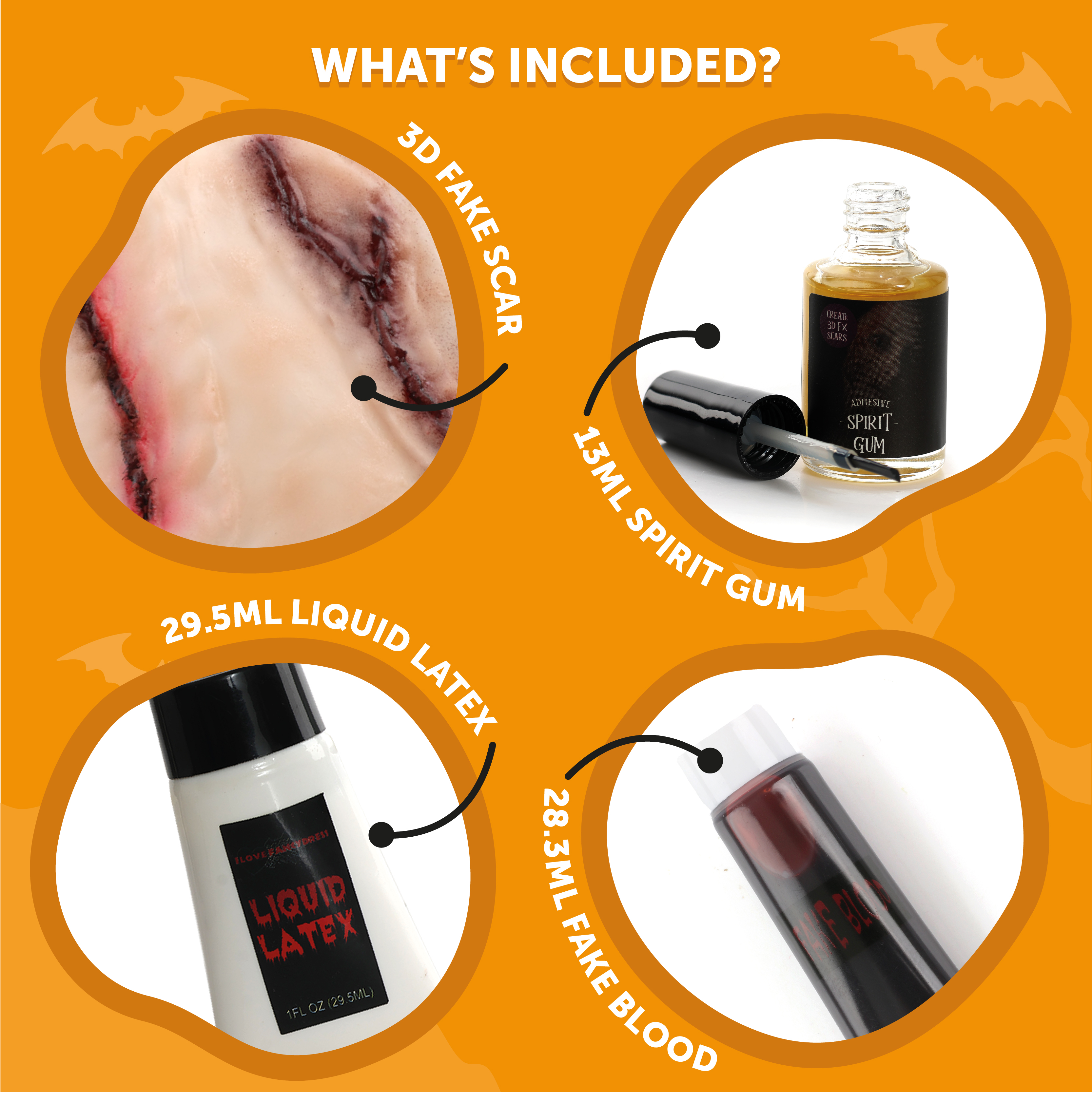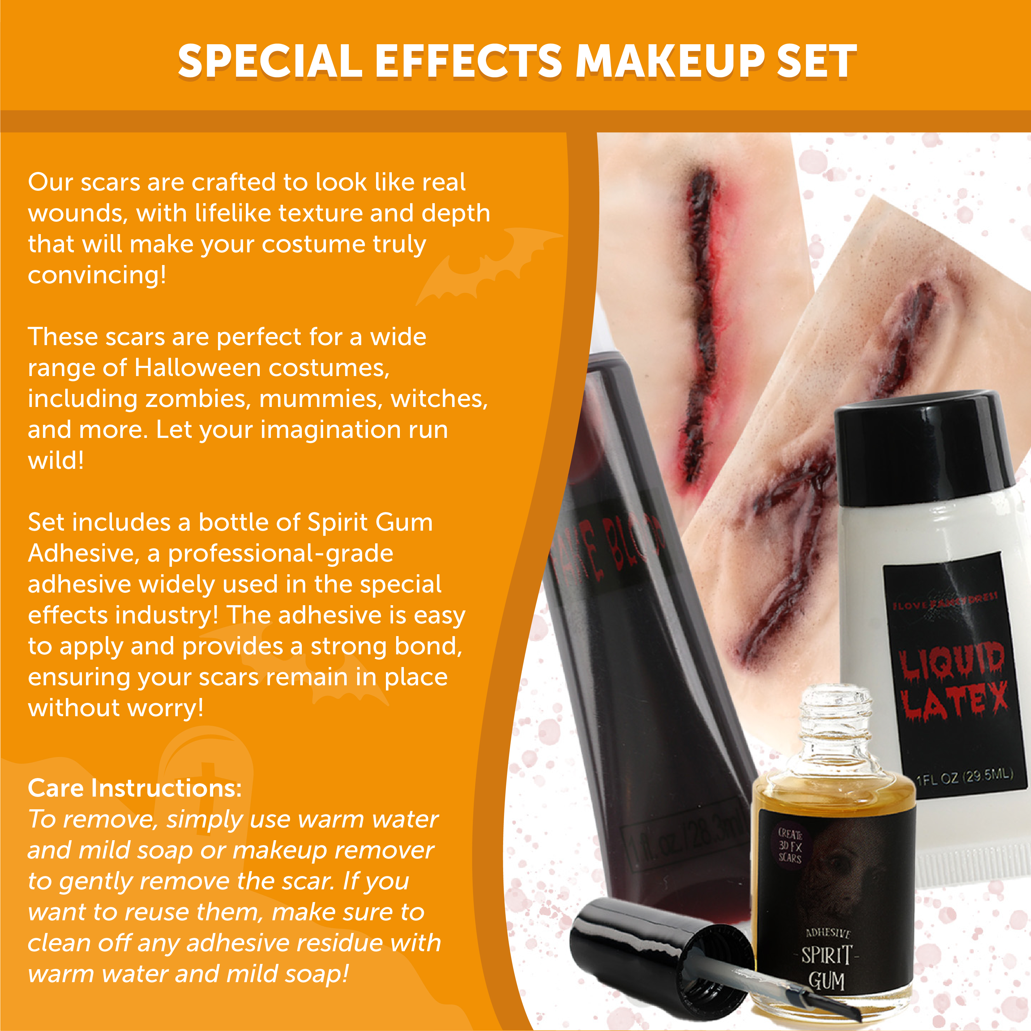 SET INCLUDES: This Sliced Scar Set includes a Sheet of 2 Fake 3D Scars that can be cut down to the desired size, a 13ml Bottle of clear adhesive Spirit Gum with a small brush attached to the inside of the lid, a Bottle of Liquid Latex and a Tube of Fake Blood, perfect to finish off your look!