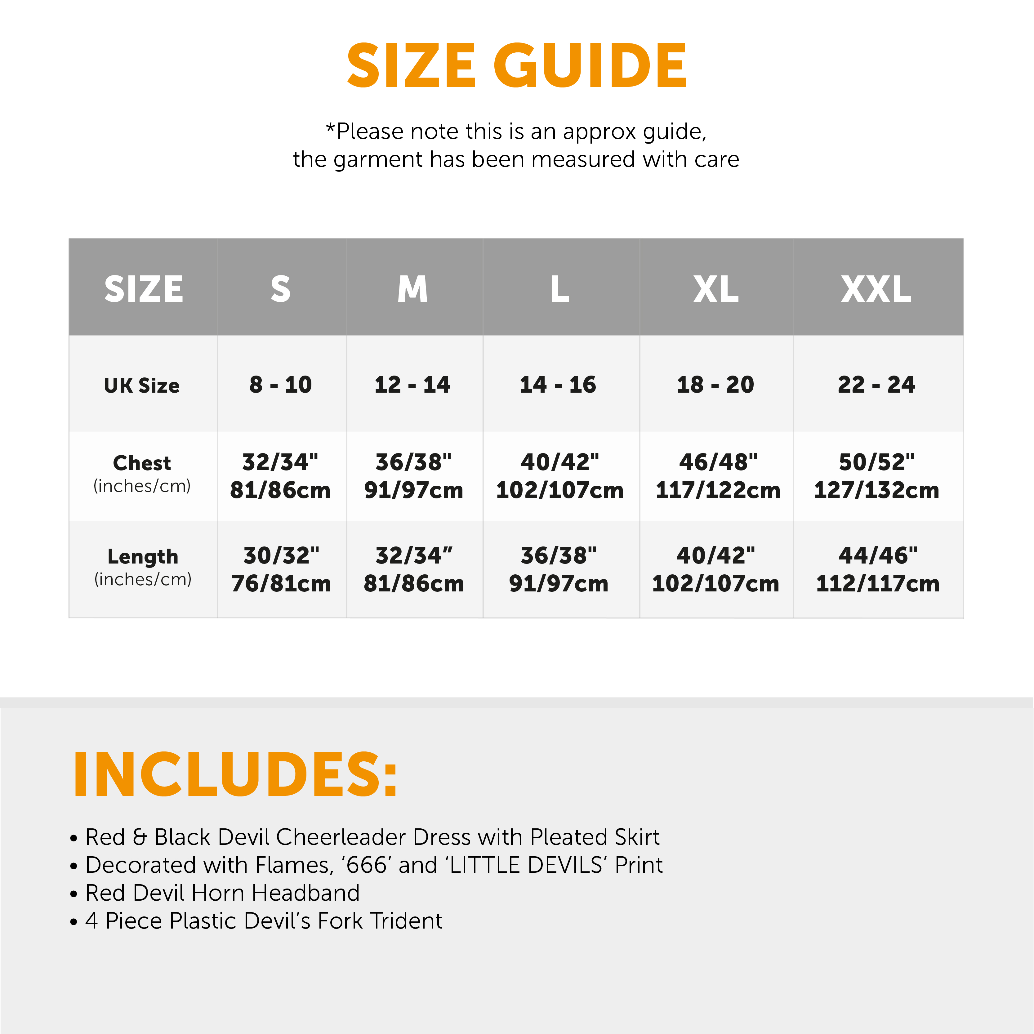 AVAILABLE IN MULTIPLE SIZES: Your Ladies Devil Cheerleader Costume is available in multiple sizes from Small to XX-Large: Small UK 8-10 – Chest: 81/86cm (32/34”), Length: 76/81cm (30/32”) | Medium UK 12-14 – Chest: 91/97cm (36/38”), Length: 81/86cm (32/34“) | Large UK 14-16 – Chest: 102/107cm (40/42”), Length: 91/97cm (36/38”) | X-Large UK 18-20 – Chest: 117/122cm (46/48”), Length: 102/106cm (40/42”) | XX-Large UK 22-24 – Chest: 127/132cm (50/52”), Length: 112/117cm (44/46”)