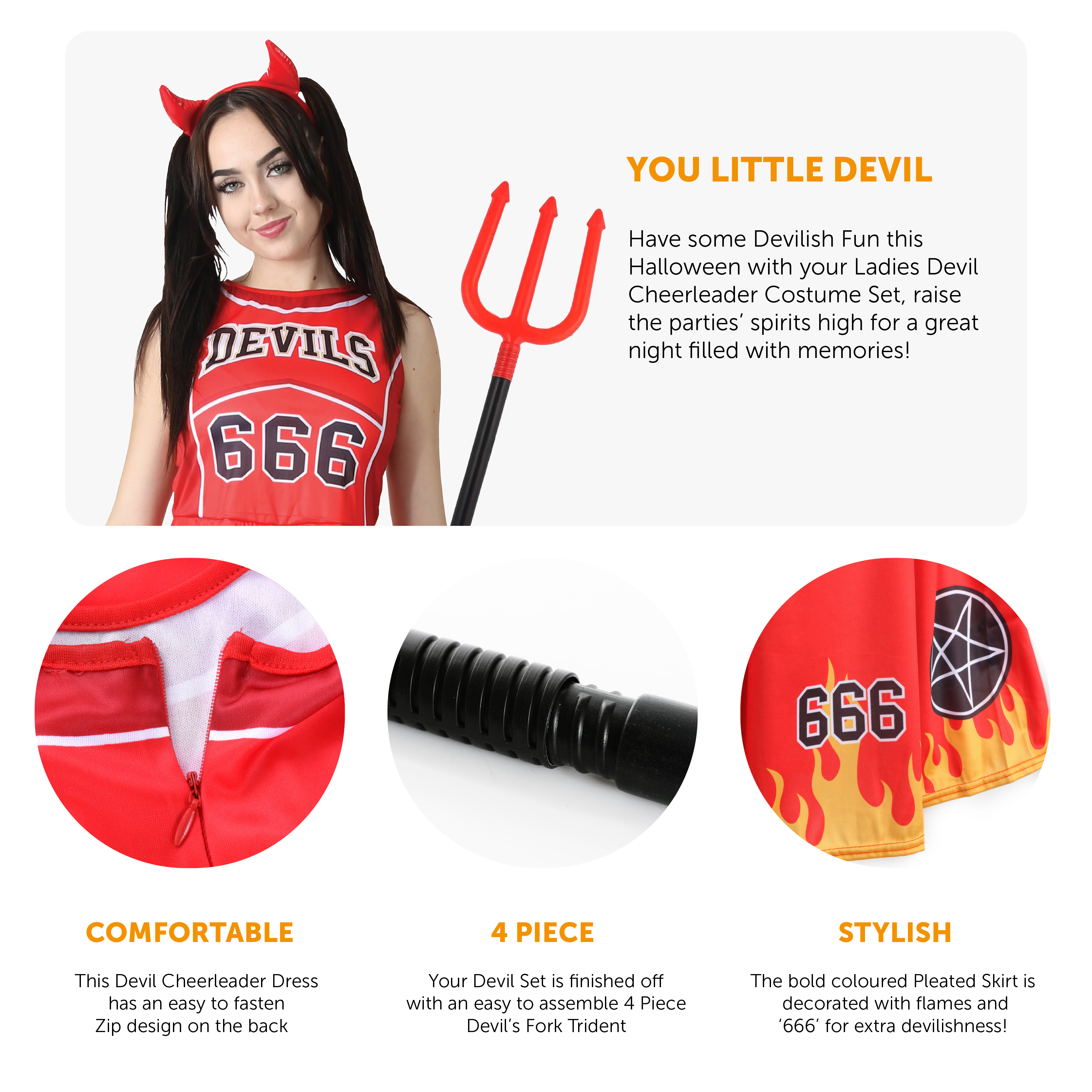 SET INCLUDES: This Ladies Devil Cheerleader Costume Set includes a Red Devil Horn Headband, a Red and Black Cheerleader Dress with a Pleated Skirt, decorated with Flames and “DEVILS” Print, and an easy to assemble 4 Piece Plastic Devil Fork Trident, the perfect Costume to act Devilish all night long!