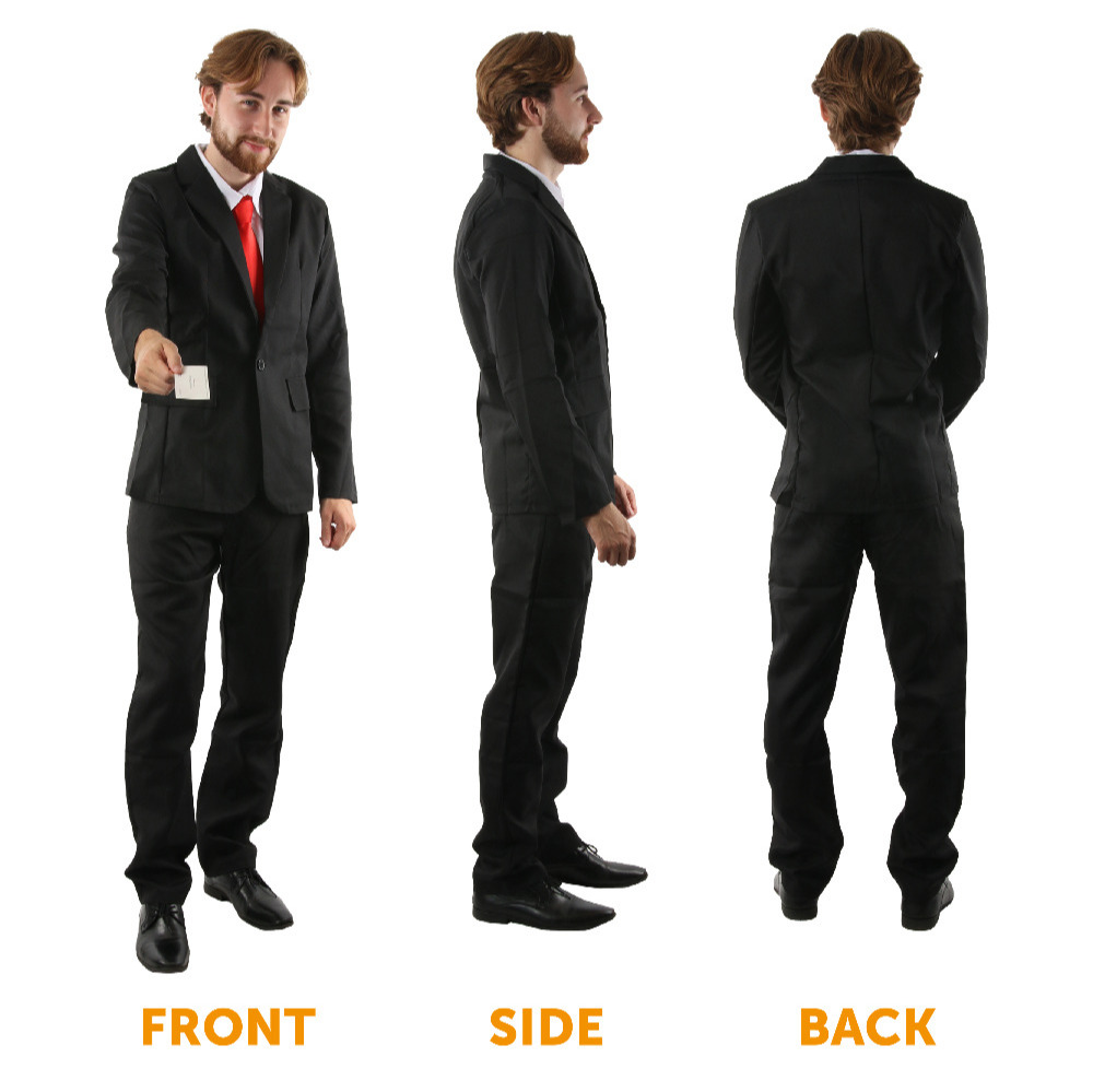 AVAILABLE IN MULTIPLE SIZES: This Adults Black Suit is available in multiple sizes, ranging from Small to X-Large: Small - Chest: Up to 36 inches (92cm), Waist: 26 inches (67cm), Trouser Length: 41 inches (105cm) | Medium - Chest: Up to 39 inches (99cm), Waist: 28 inches (71cm), Trouser Length: 43 inches (110cm) | Large - Chest: Up to 40 inches (101cm), Waist: 30 inches (75cm), Trouser Length: 44 inches (113cm) | X-Large - Chest: Up to 41 inches (103cm), Waist: 33 inches (83cm), Trouser Length: 45 inches (115cm) | XX-Large - Chest: Up to 42 inches (107cm), Waist: 36 inches (91cm), Trouser Length: 46 inches (117cm)