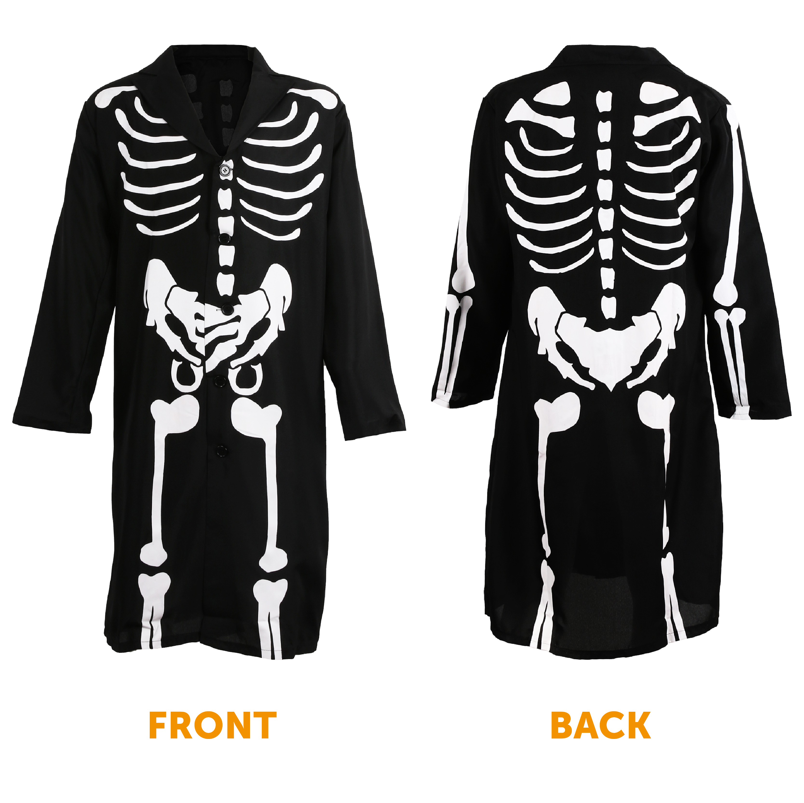 LONG SKELETON JACKET DETAILS: Your Long Skeleton Jacket Costume is a long black jacket with a Skeleton Print on the front, and a Black Tie with a Skeleton Print Bone design down the front!