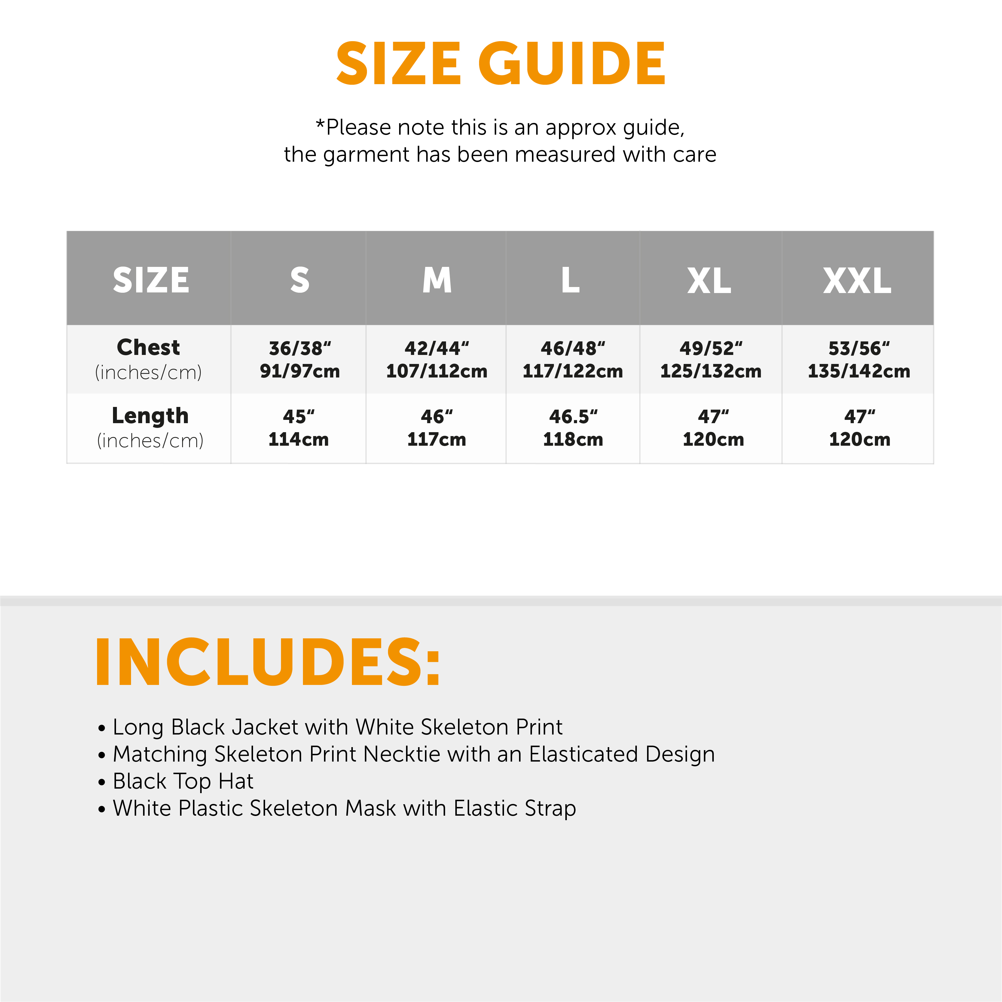 AVAILABLE IN MULTIPLE SIZES: Your Long Skeleton Jacket is available in multiple sizes, from Small to XX-Large: