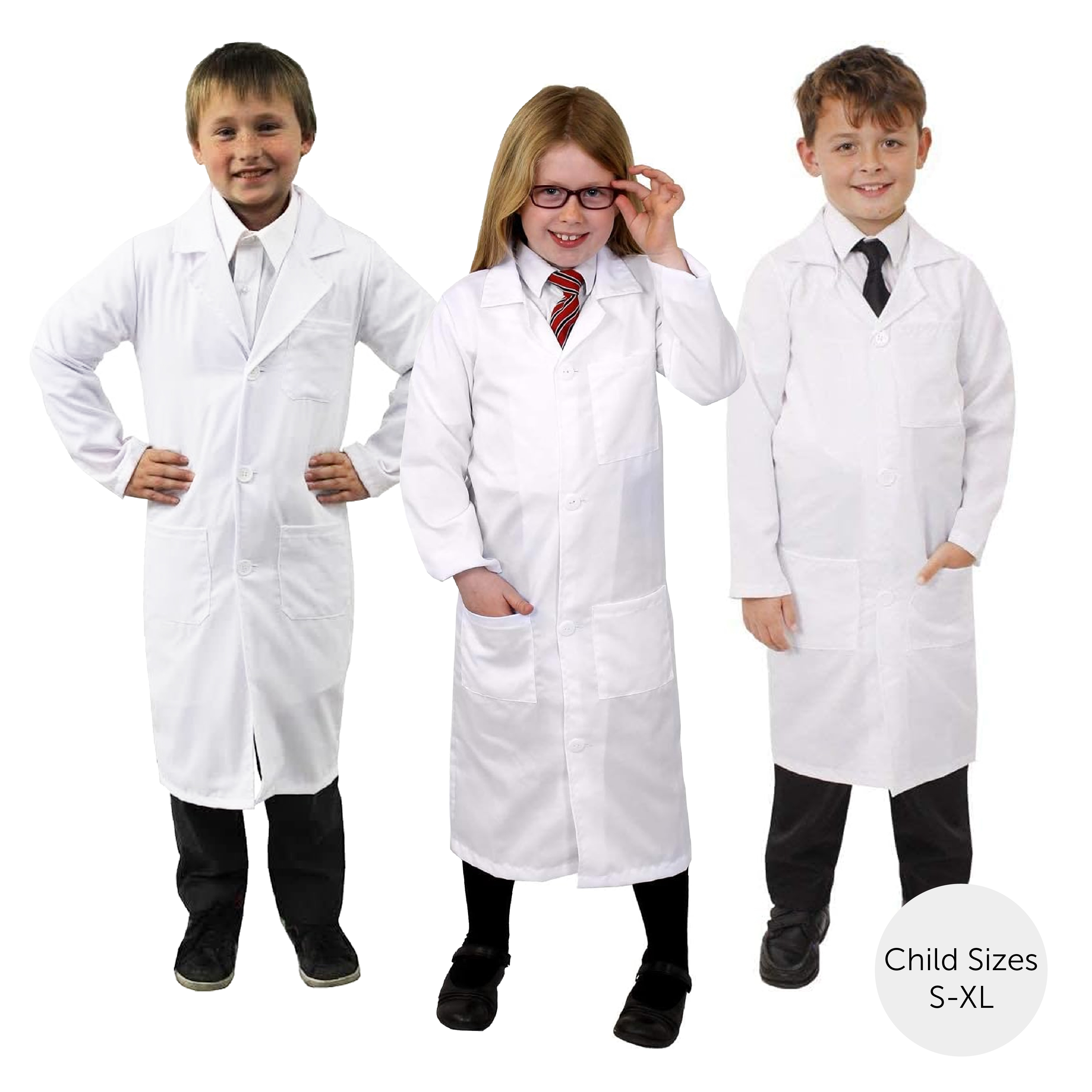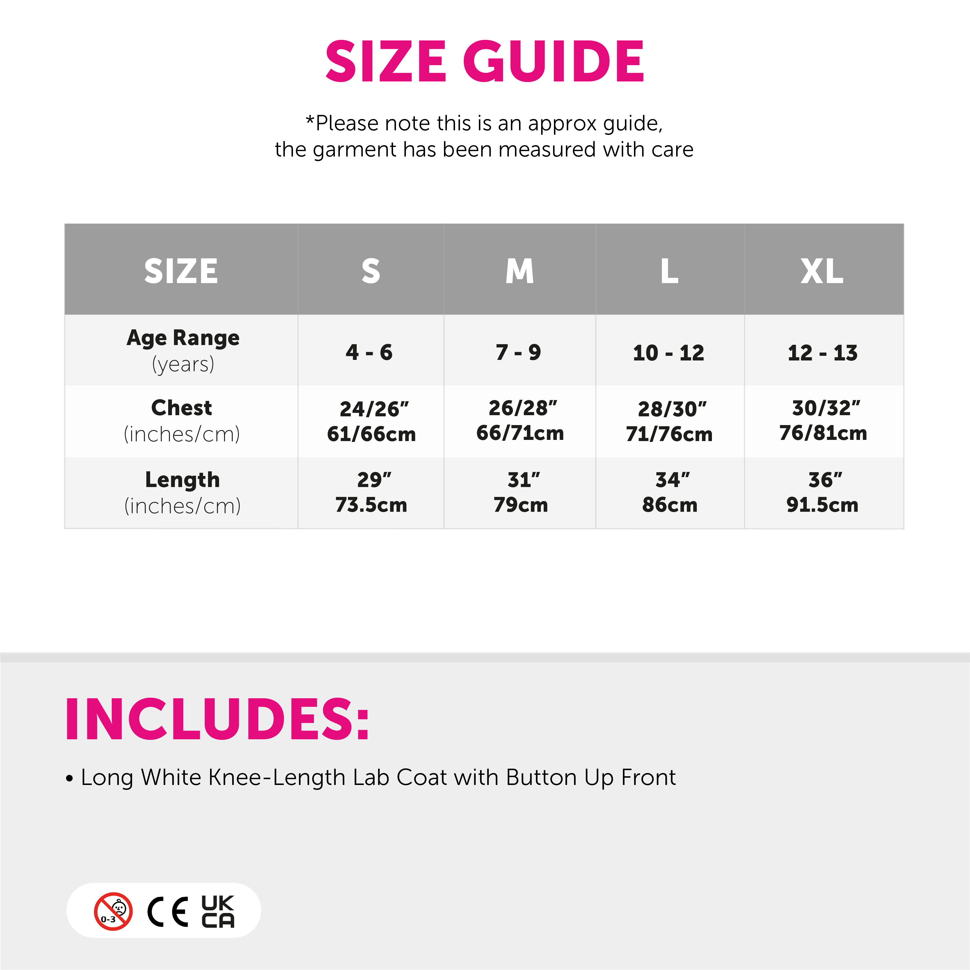 AVAILABLE IN MULTIPLE SIZES: This Child's White Lab Coat is available in sizes Small to X-Large: Small - (4 - 6 years), Chest 24/26" (61/66cm), Length 29" (73.5cm) | Medium - (7 - 9 years), Chest 26/28" (66/71cm), Length 31" (79cm) | Large - (10 - 12 years), Chest 28/30" (71/76cm), Length 34" (86cm) | X-Large - (12 - 13 years), Chest 30/32" (76/81cm), Length 36" (91.5cm)