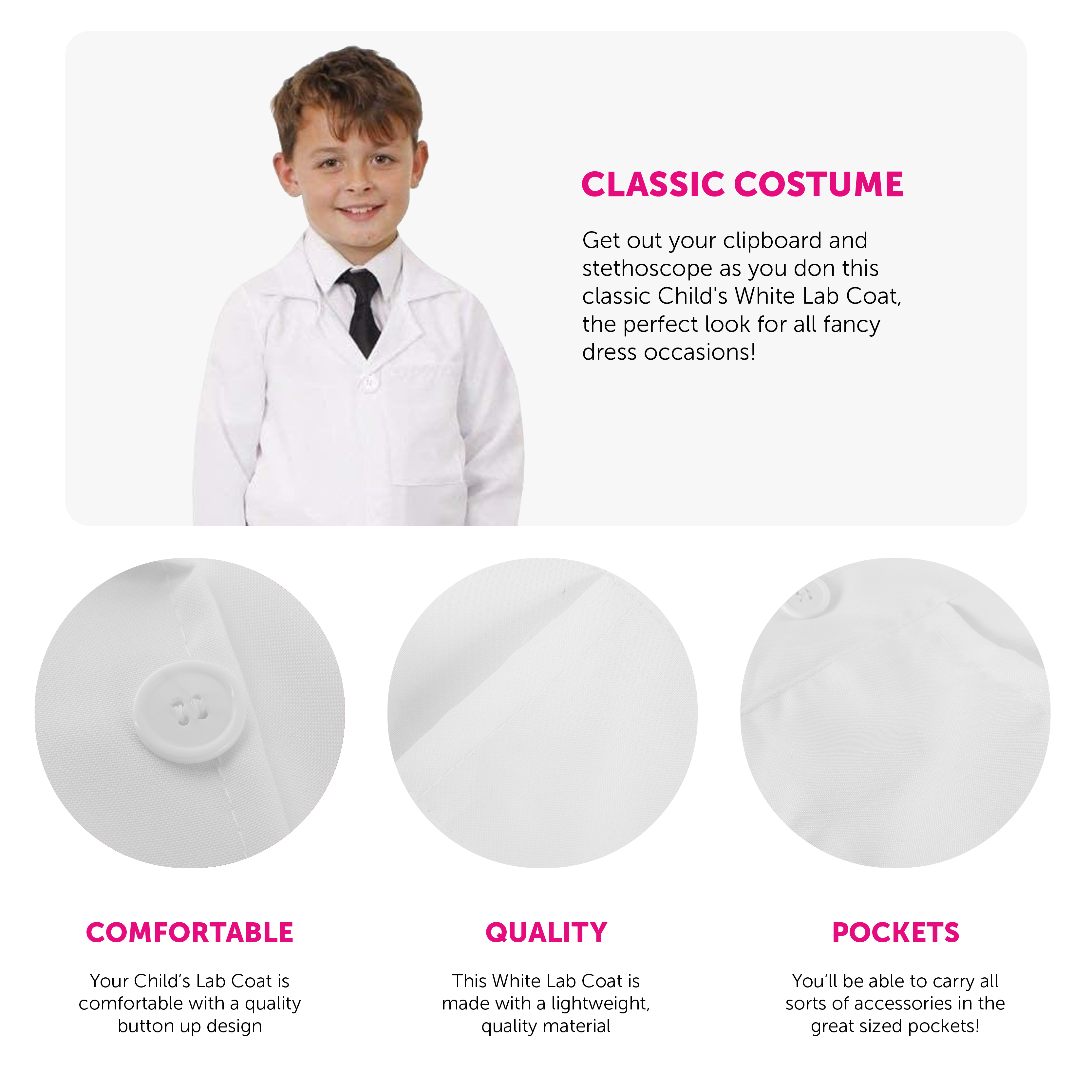 CHILDS WHITE LAB COAT COSTUME: Get out your clipboard and stethoscope as you don this classic Child's White Lab Coat, the perfect look for all fancy dress occasions!