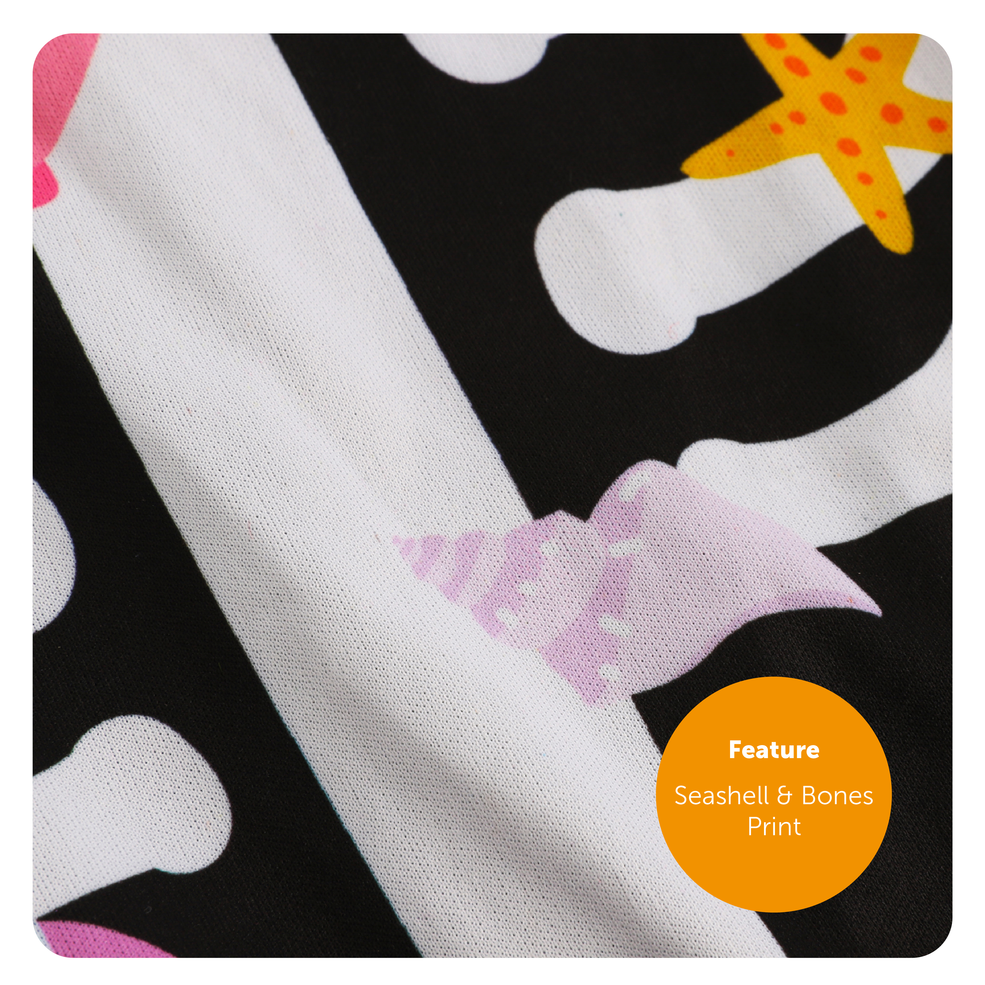 MERMAID SKELETON DETAILS: Your Childs Mermaid Costume is a full body jumpsuit with a skeleton mermaid top attached with sea creature details, attached mermaid tail with skeletal mermaid fins and a pink shell headband!