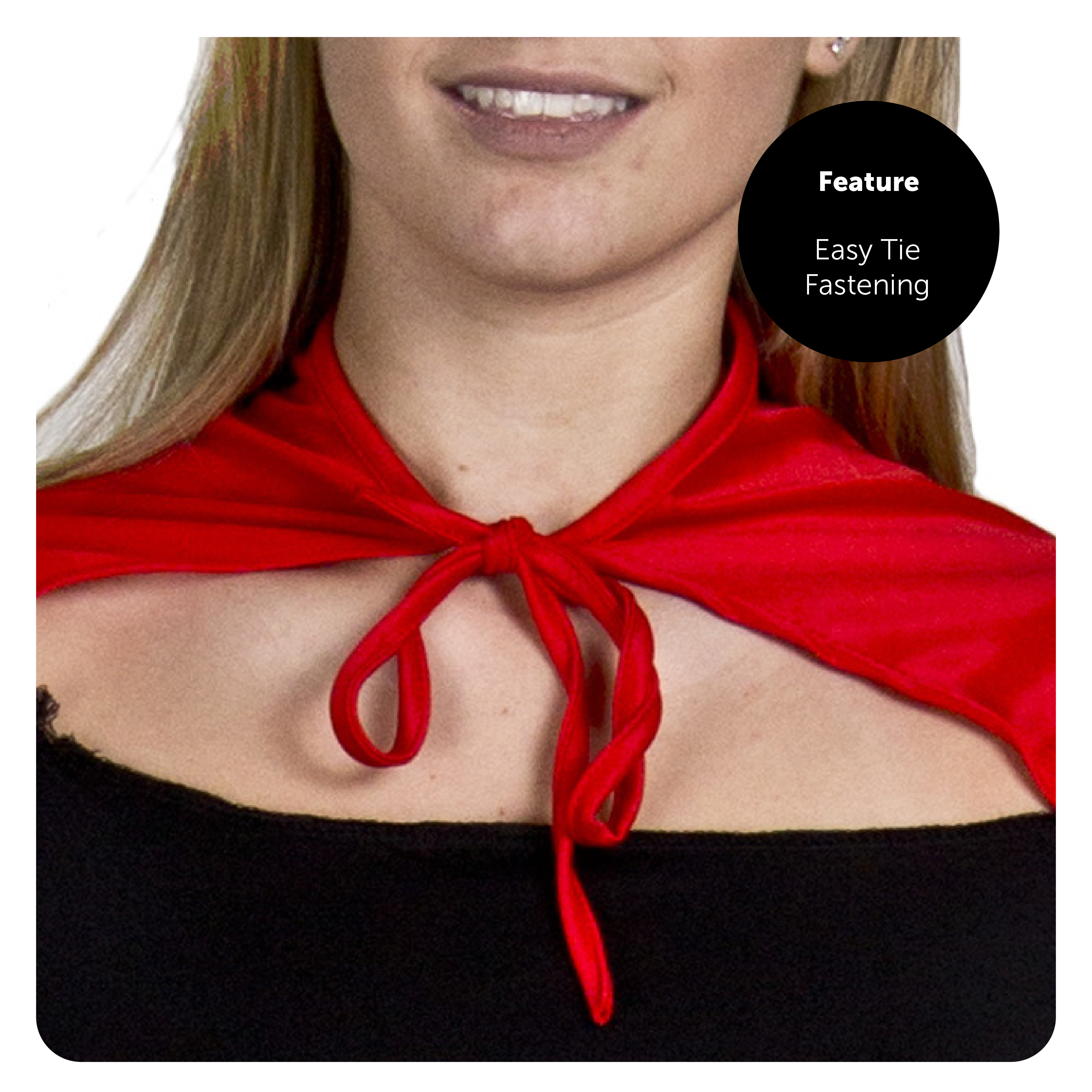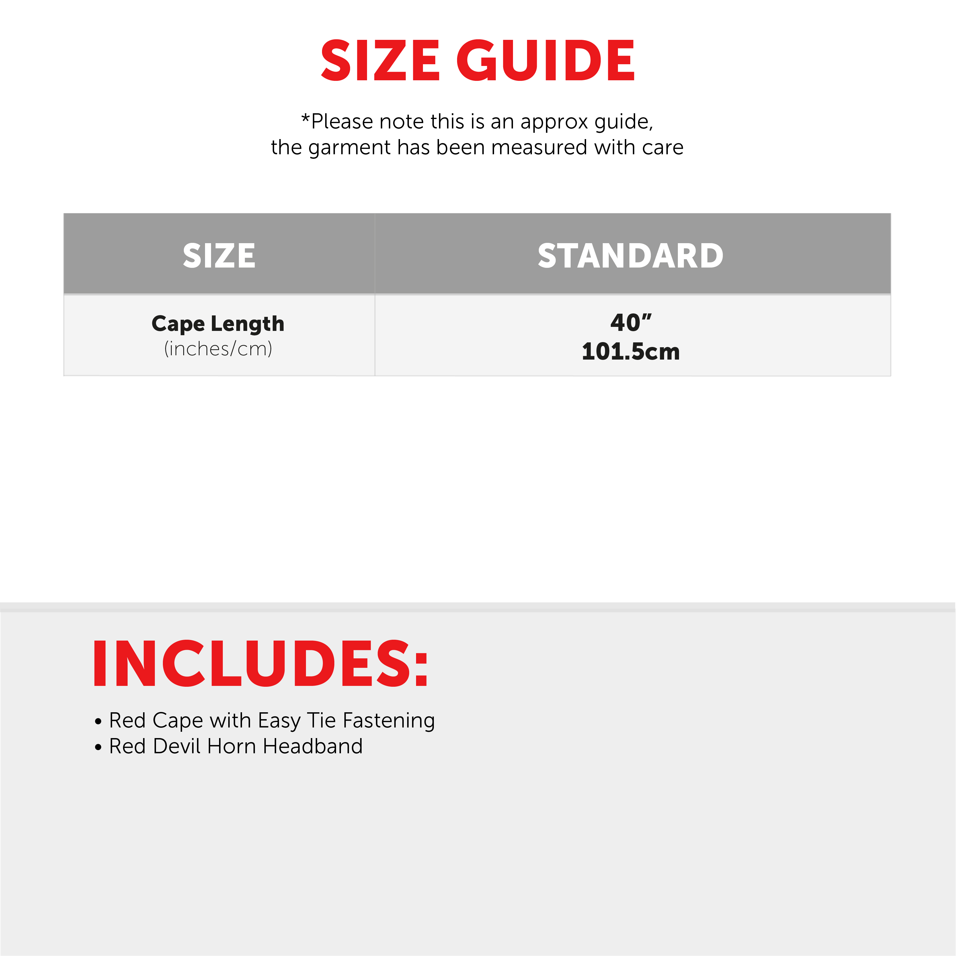 CAPE MEASUREMENT: Your Adults Red Cape is only available in one size, measuring 40" (101.5cm) in length, you’ll feel comfortable and have no issue bringing the Devilishness wherever you go!