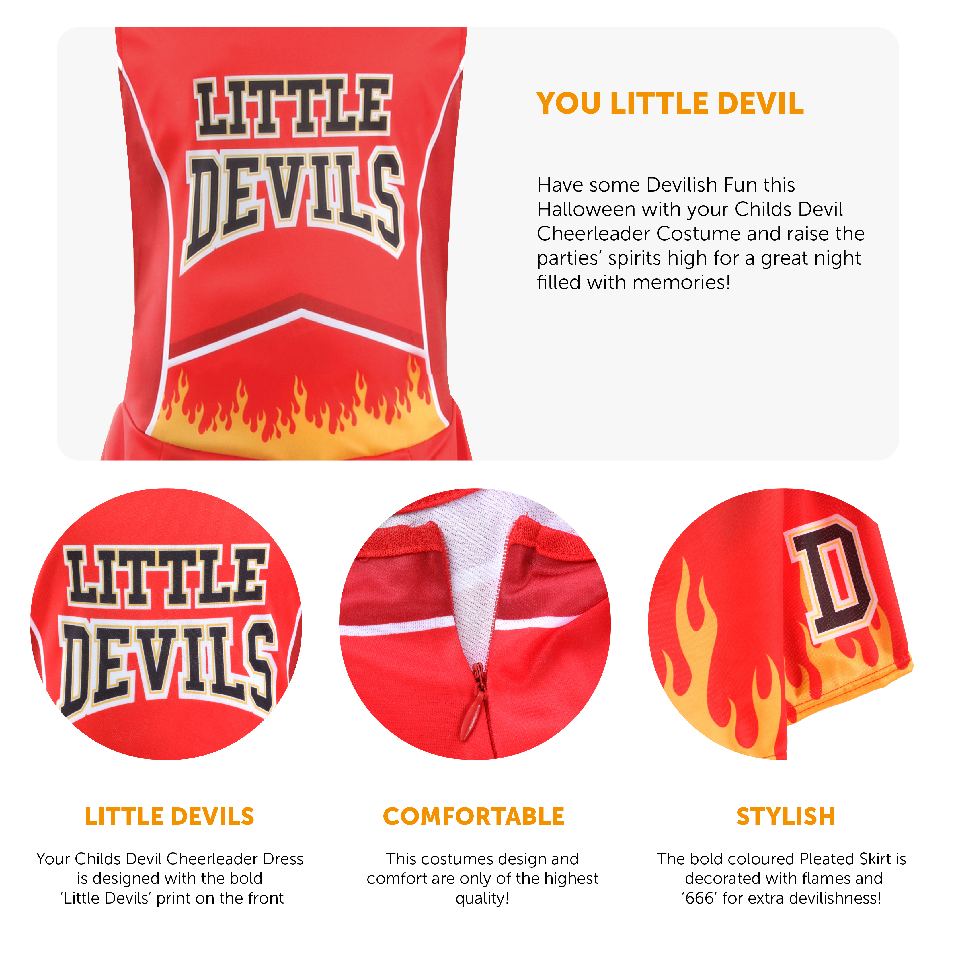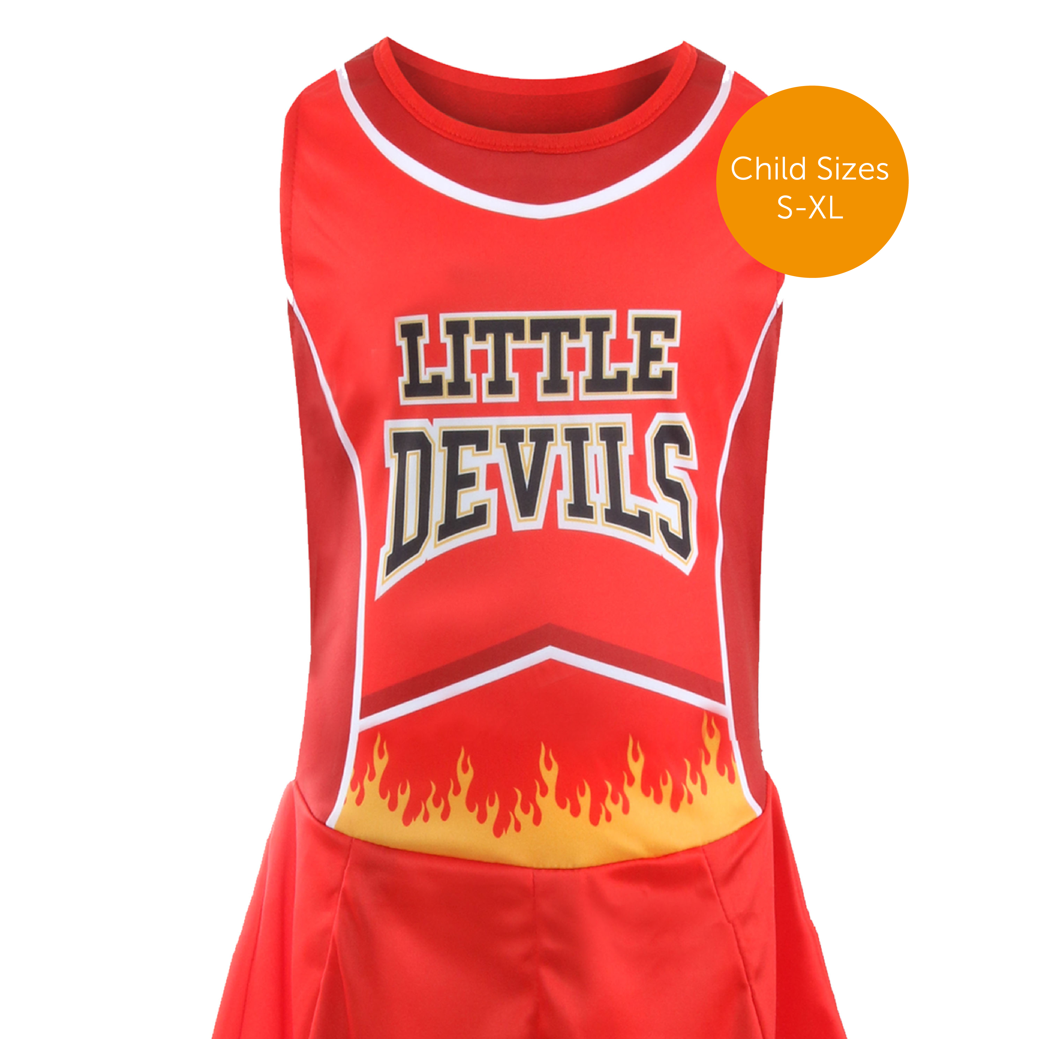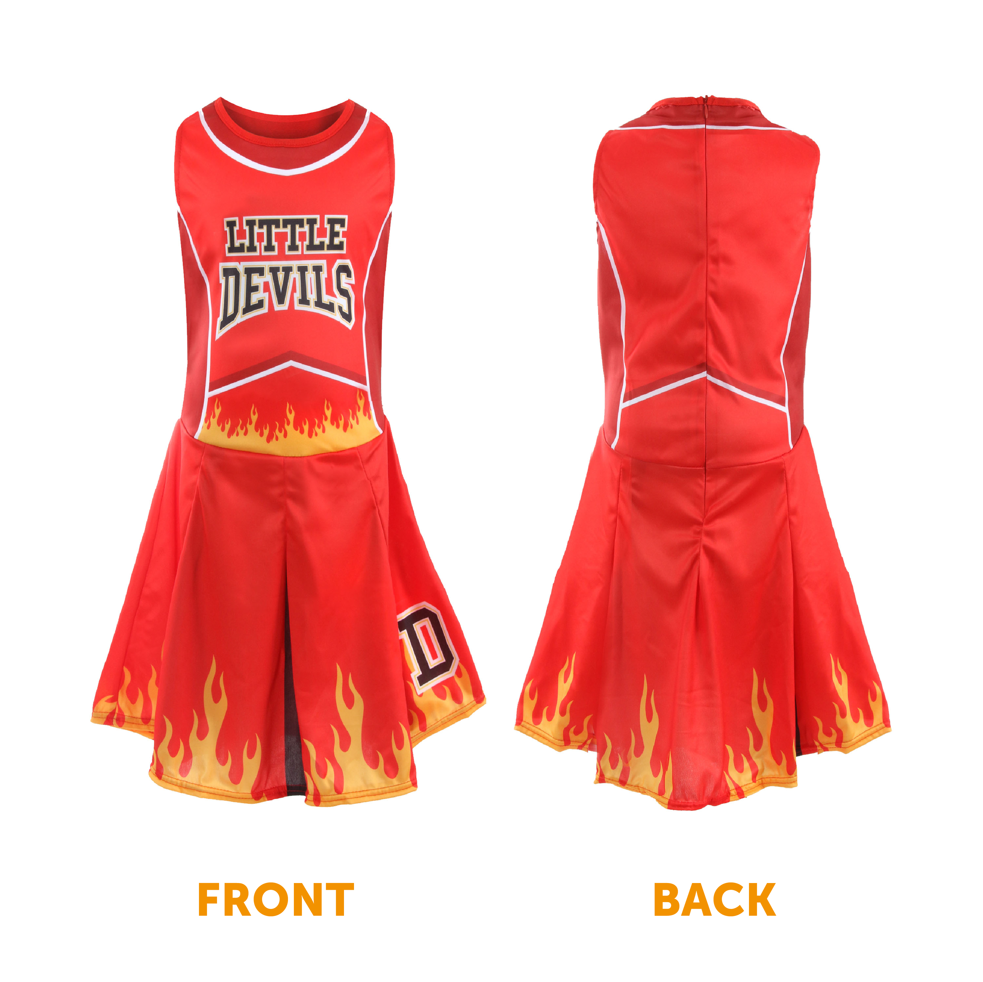 GIRLS DEVIL CHEERLEADER DETAILS: Your Devil Cheerleader Costume includes a Red and Black Dress with Pleated Skirt Decorated with Flames and "666" and “LITTLE DEVILS” Print on Top!