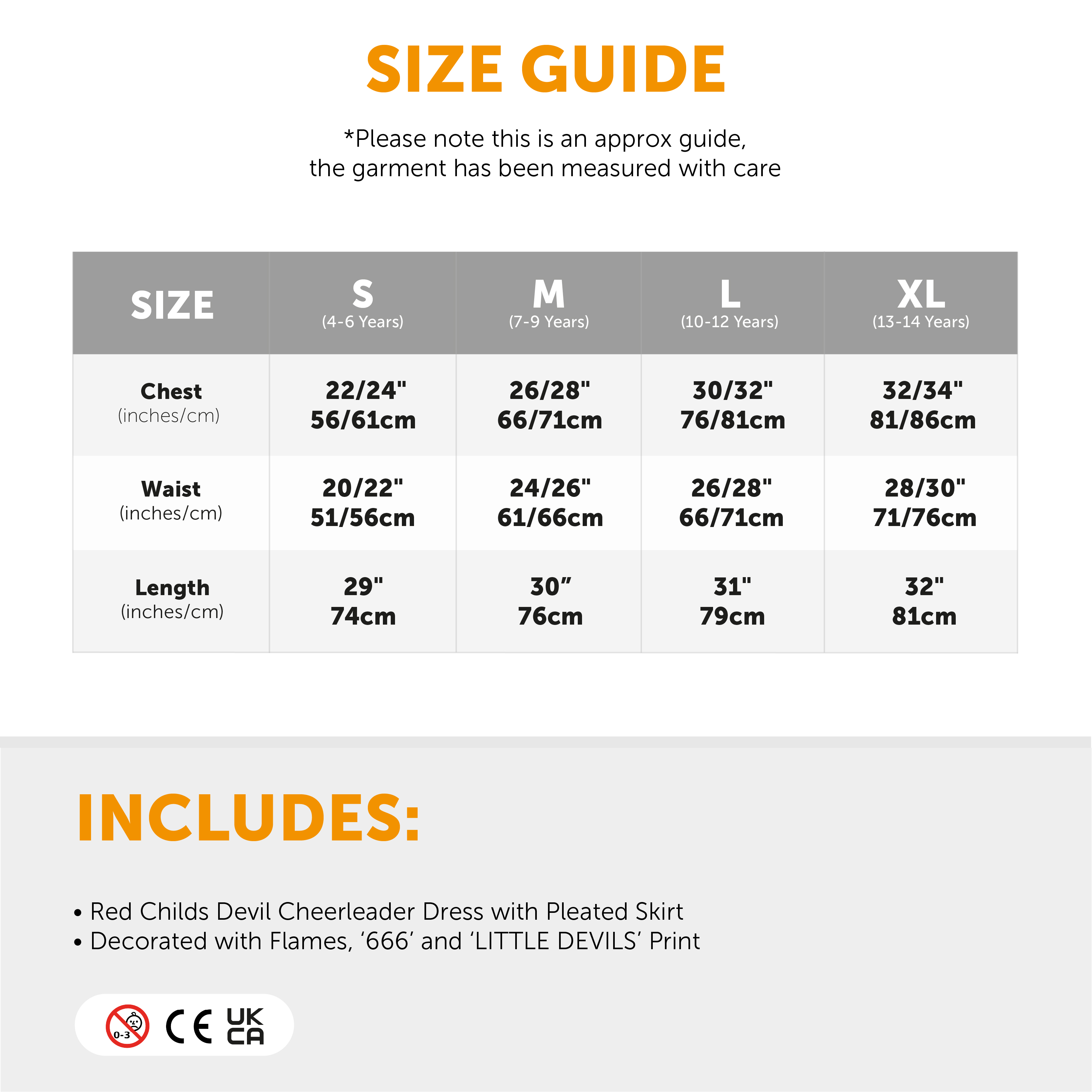 AVAILABLE IN MULTIPLE SIZES: Your Girls Devil Cheerleader Costume is available in multiple sizes from Small to X-Large: Large 10-12 Years - Chest: 30-32" (76-81cm) - Waist: 26-28" (66-71cm) - Length: 31" (79cm)