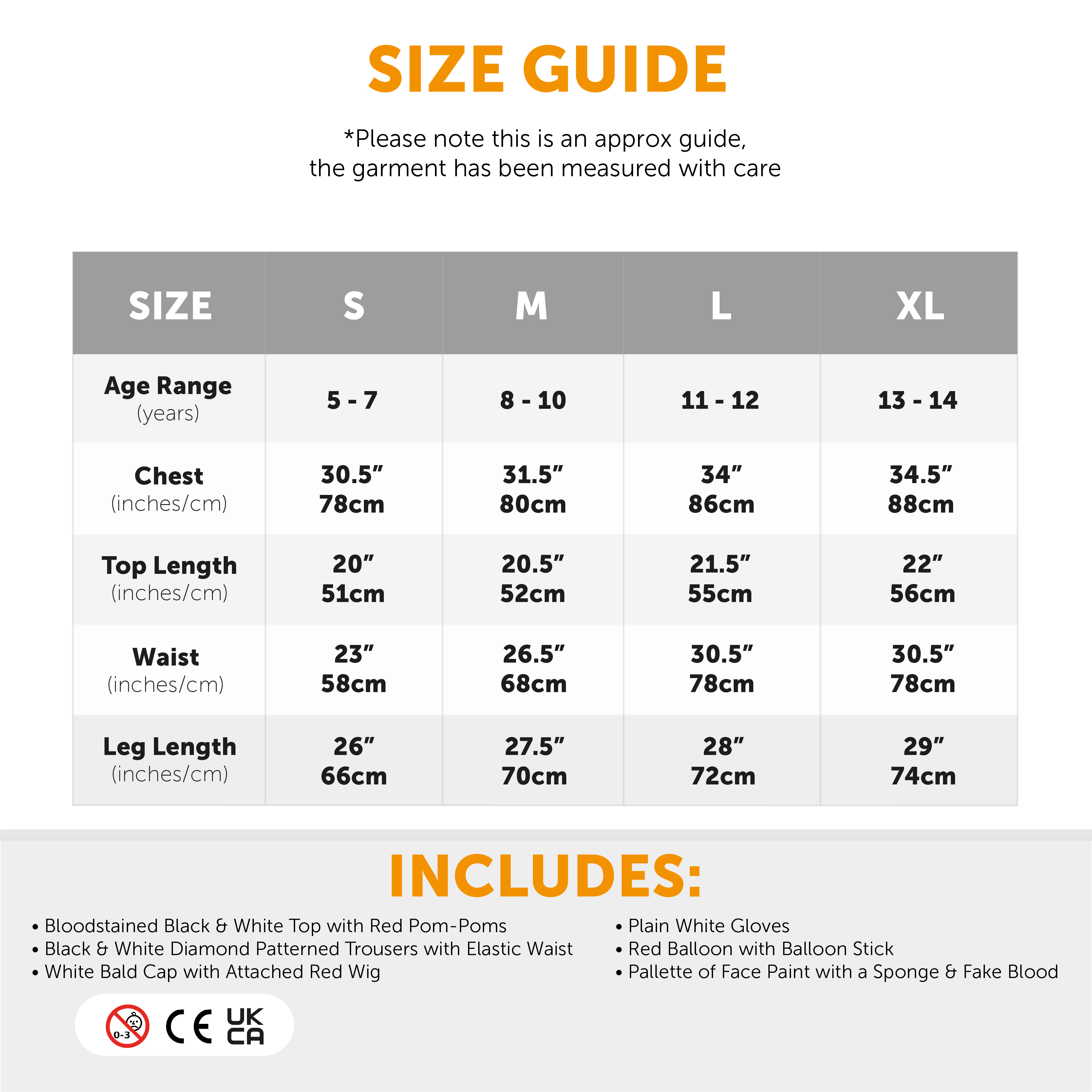 AVAILABLE IN MULTIPLE SIZES: Your Child Killer Clown Halloween Costumes are available in multiple sizes from Small to X-Large: Small (5 - 7 years) Chest 30.5" (78cm), Top Length 20" (51cm), Waist 23" (58cm), Leg Length 26" (66cm) | Medium (8 - 10 years) Chest 31.5" (80cm), Top Length 20.5" (52cm), Waist 26.5" (68cm), Leg Length 27.5" (70cm) | Large (11 - 12 years) Chest 34" (86cm), Top Length 21.5" (55cm), Waist 30.5" (78cm), Leg Length 28" (72cm) | X-Large (13 - 14 years) Chest 34.5" (88cm), Top Length 22" (56cm), Waist 30.5" (78cm), Leg Length 29" (74cm)
