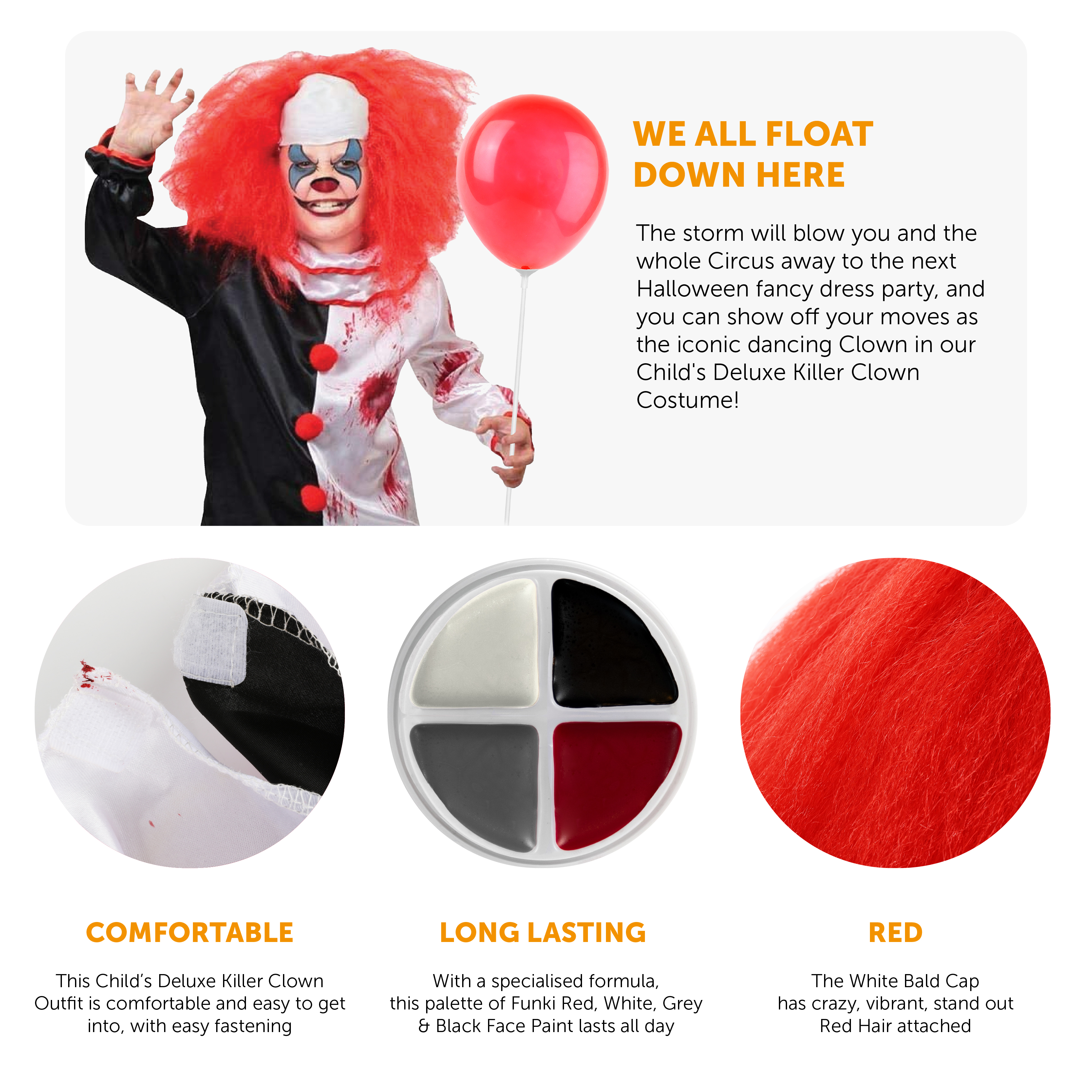 CHILD'S DELUXE KILLER CLOWN COSTUME: The storm will blow you and the whole Circus away to the next Halloween fancy dress party, and you can show off your moves as the iconic dancing Clown in our Child's Deluxe Killer Clown Costume!