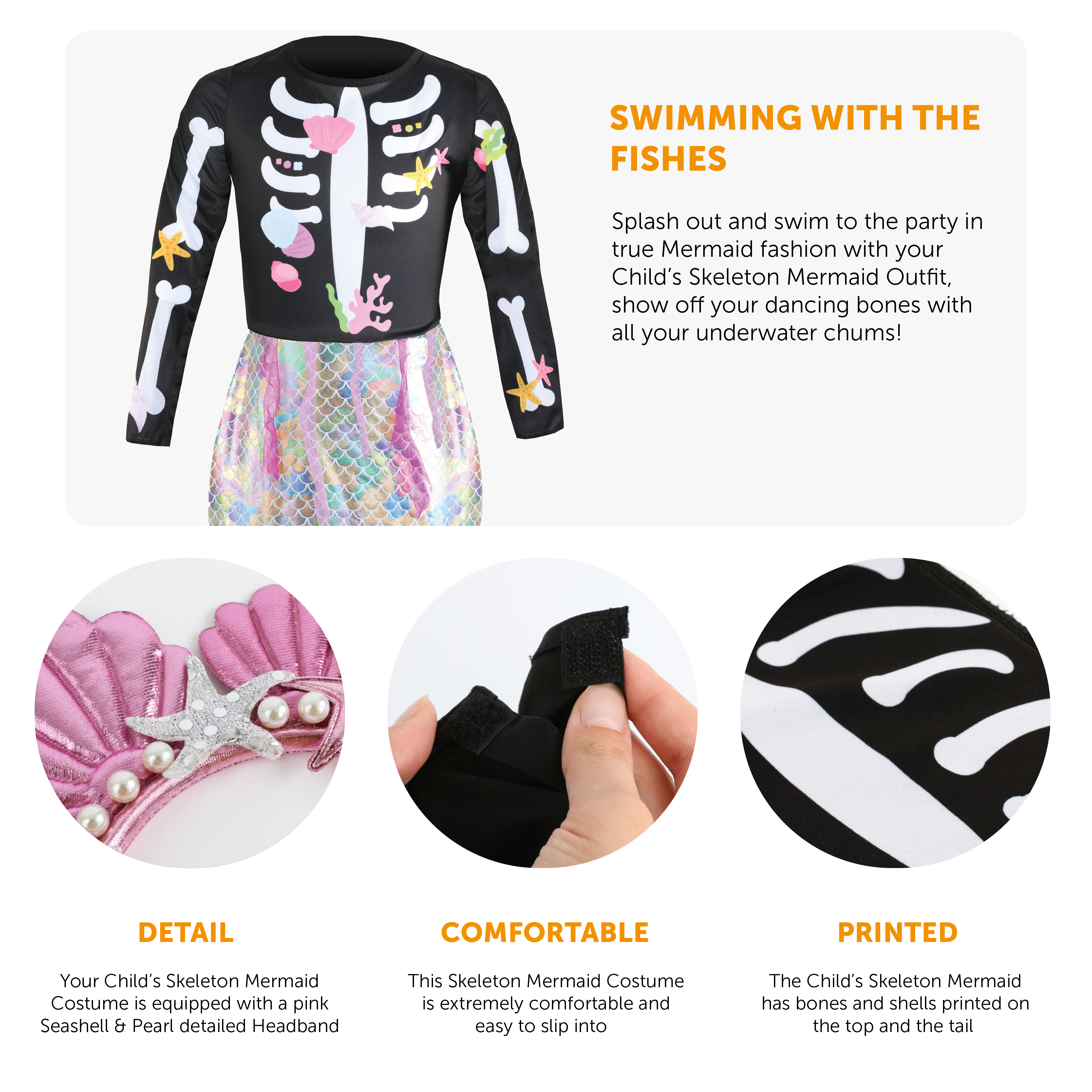 GREAT COSTUME QUALITY: From the soft comfortable feel to the fantastic design of the mermaid tail, the details on the skeleton’s bones, and the fantastic design and accessories on the pink shell headband, this is a fantastic Halloween costume!