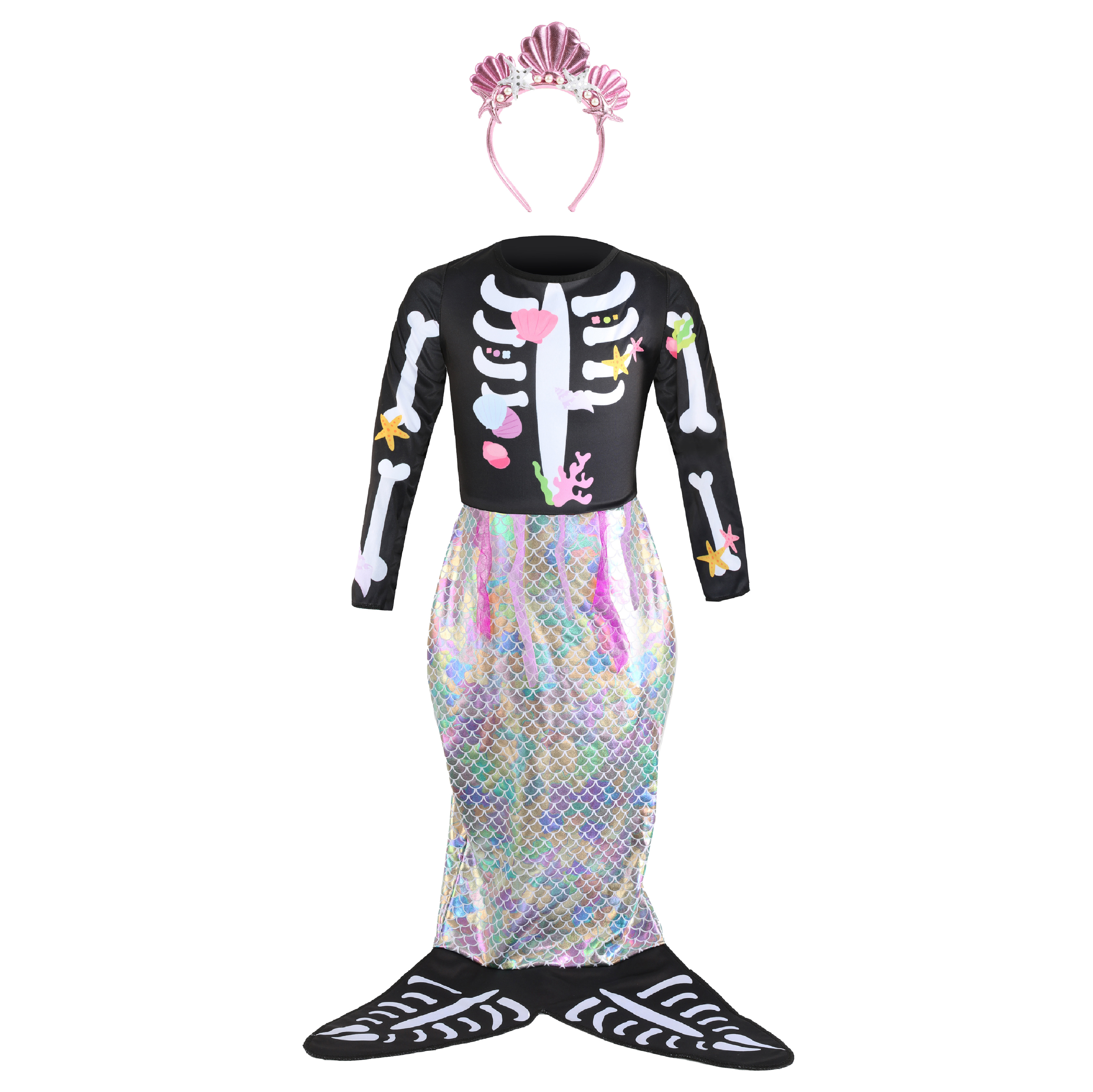 MERMAID SKELETON DETAILS: Your Child's Mermaid Costume is a full body jumpsuit with a skeleton mermaid top attached with sea creature details, attached mermaid tail with skeletal mermaid fins, a pink shell headband and Black and White Face Paint!