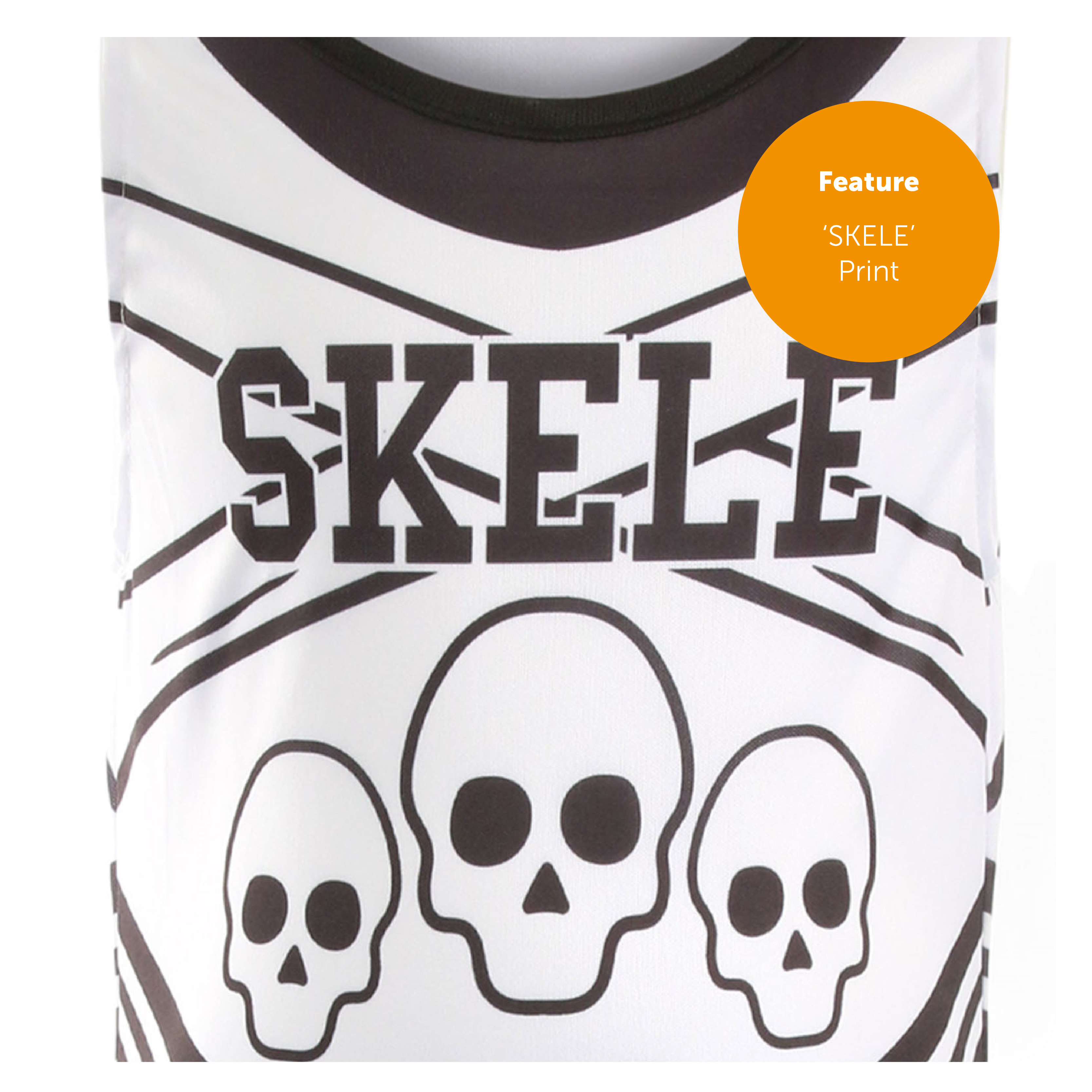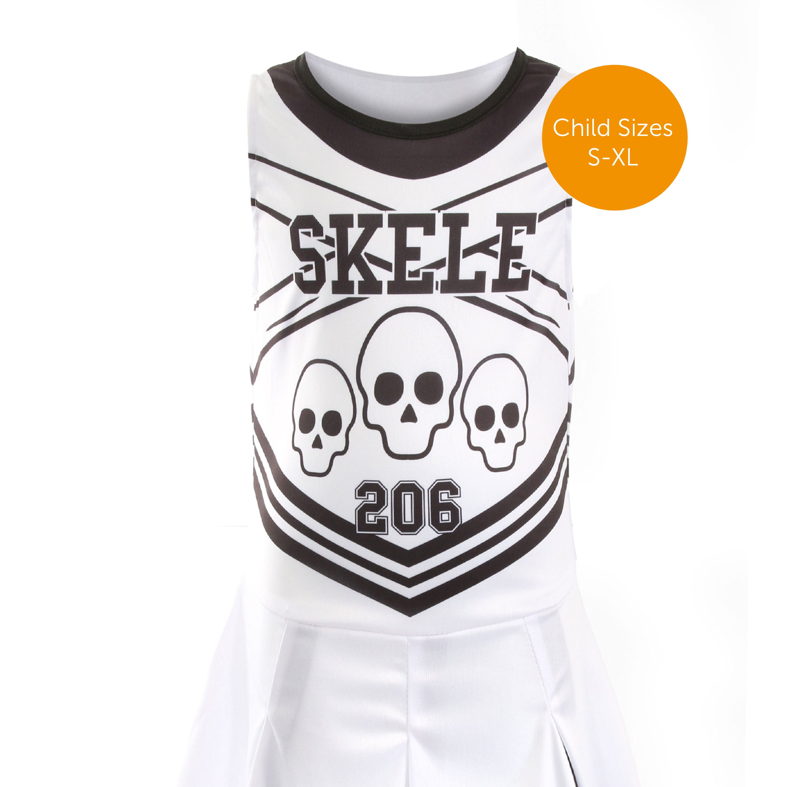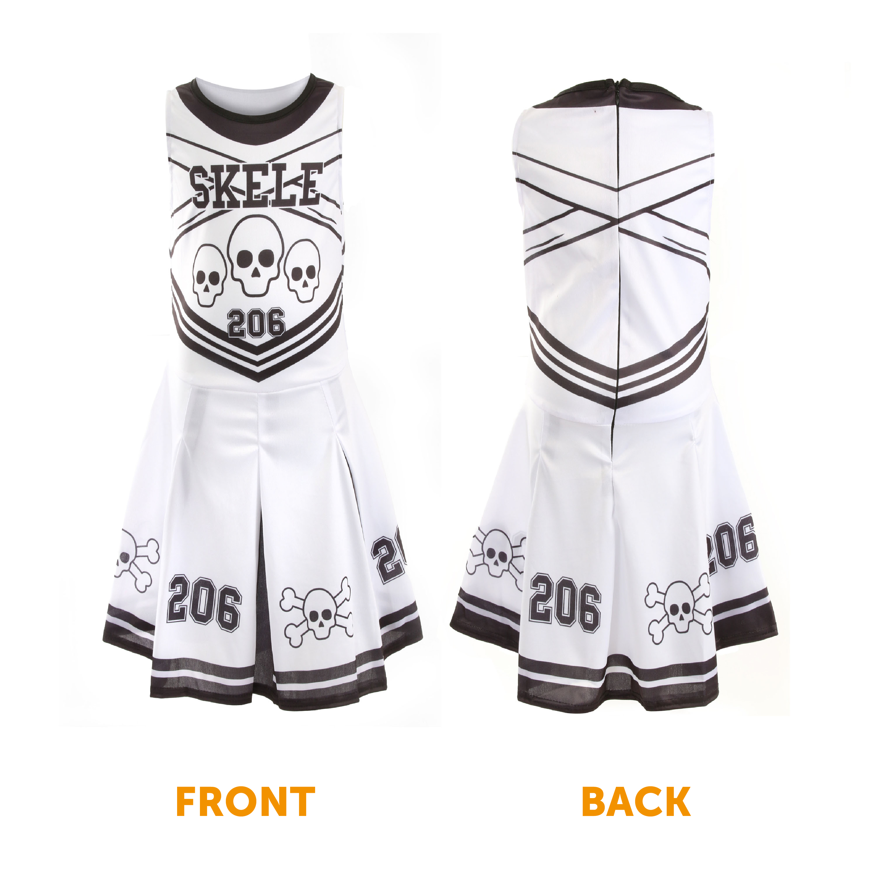 - GIRLS SKELETON CHEERLEADER DETAILS: Your Skeleton Cheerleader Costume includes a Black and White Dress with Pleated Skirt Decorated with Skull & Crossbones and "206" and “SKELE” Print on Top, A Pair of Red Pom Poms, Black, White and Grey Facepaint and a tube of Fake Blood!