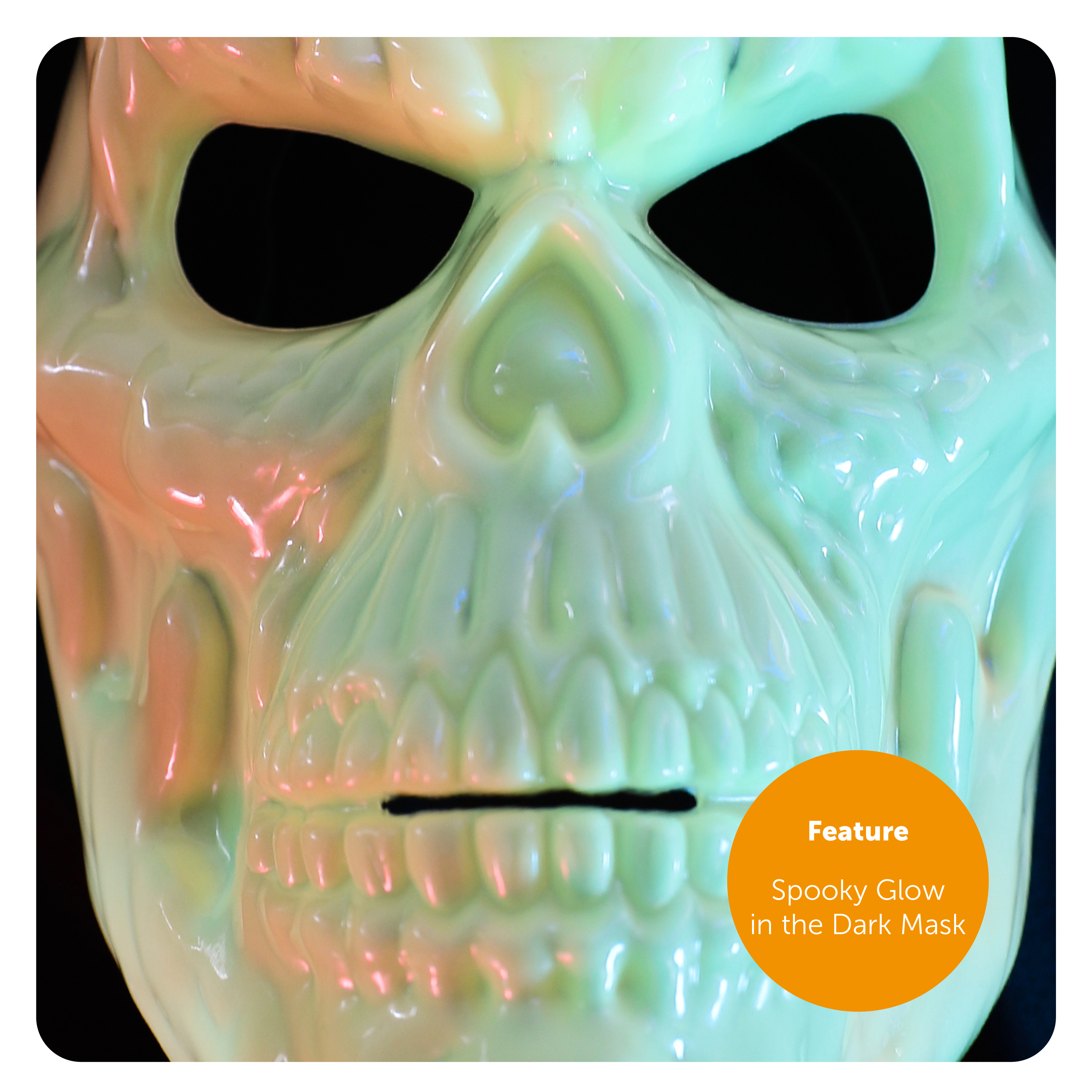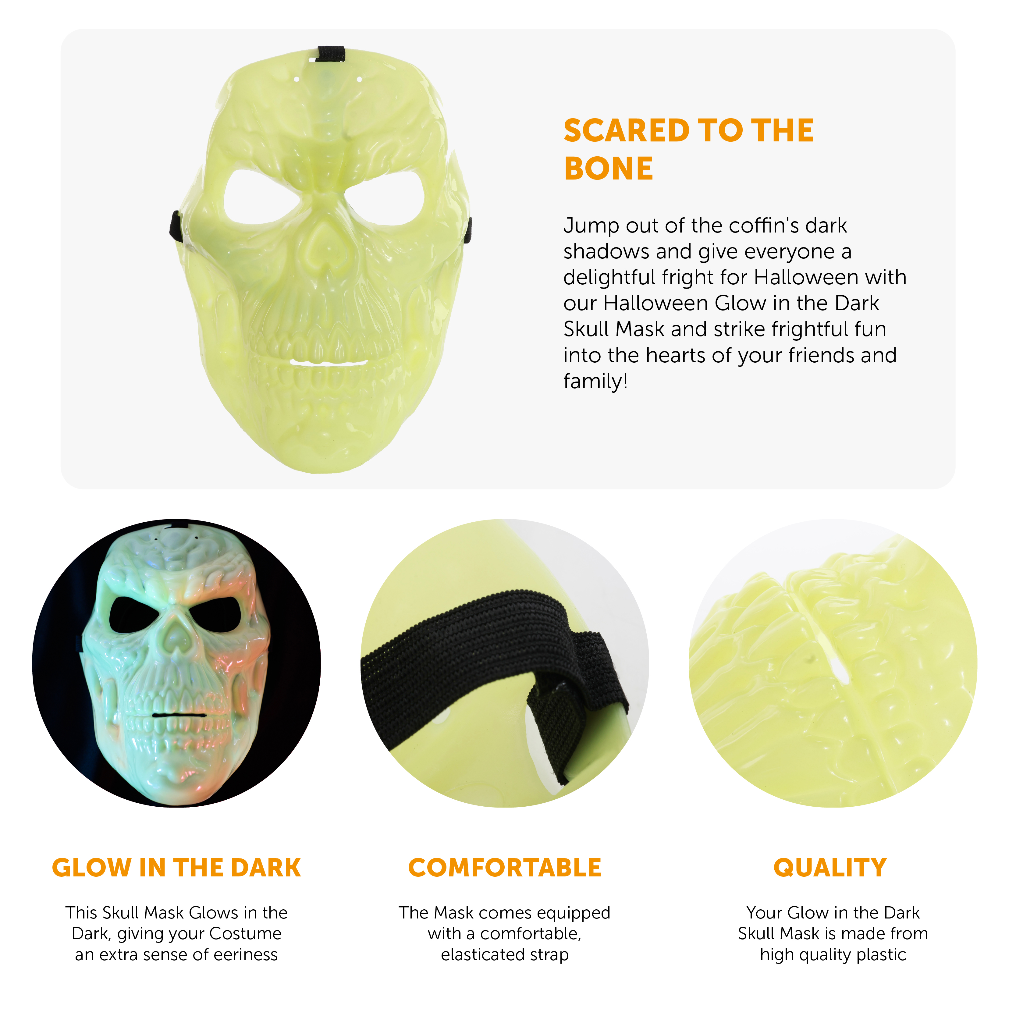 HALLOWEEN GLOW IN THE DARK SKULL MASK: Jump out of the coffin's dark shadows and give everyone a delightful fright for Halloween with our Halloween Glow in the Dark Skull Mask and strike frightful fun into the hearts of your friends and family!