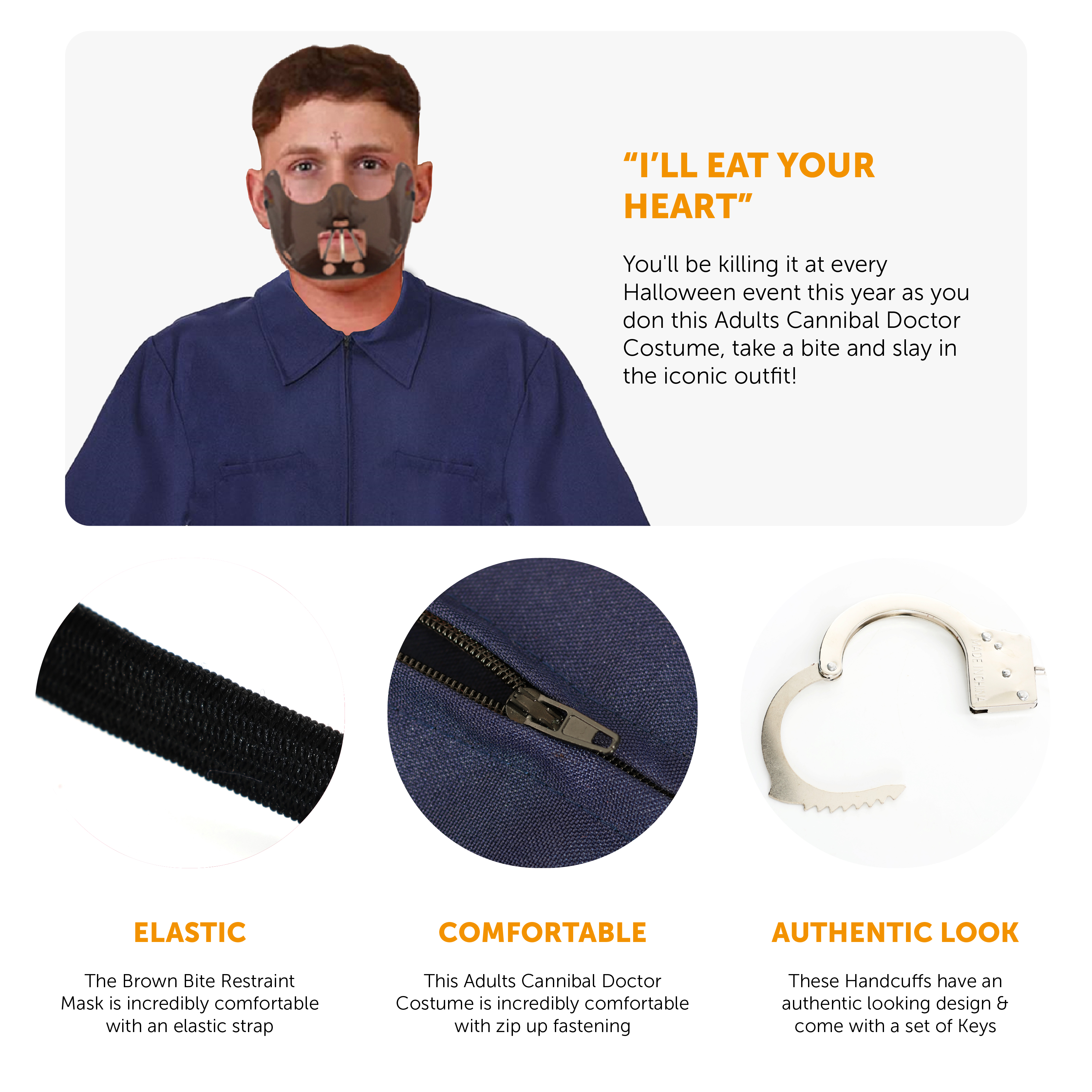 COSTUME INCLUDES: This Adults Cannibal Doctor Costume includes a Navy Blue, all-in-one, long sleeved Jumpsuit with comfortable zip up fastening, Silver Metal Handcuffs with a Key and an iconic Brown Bite Restraint Mask, the perfect Costume this Halloween!