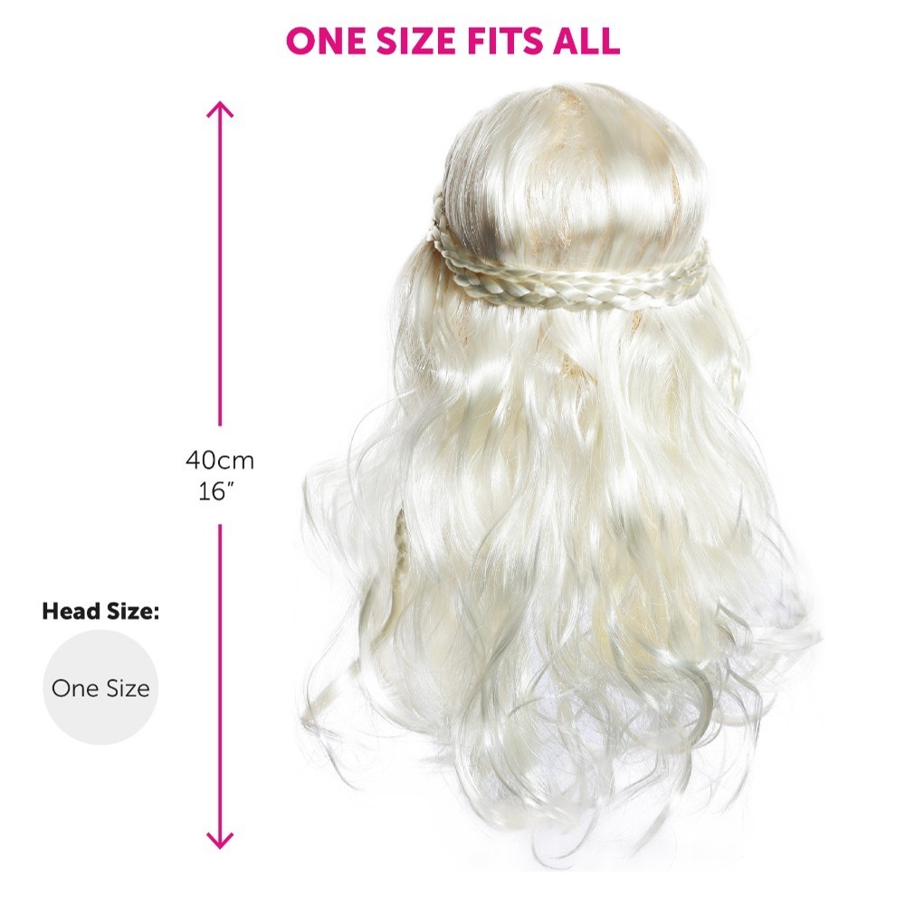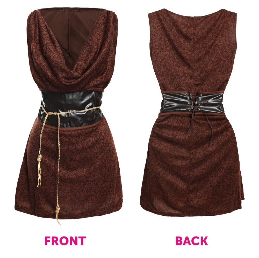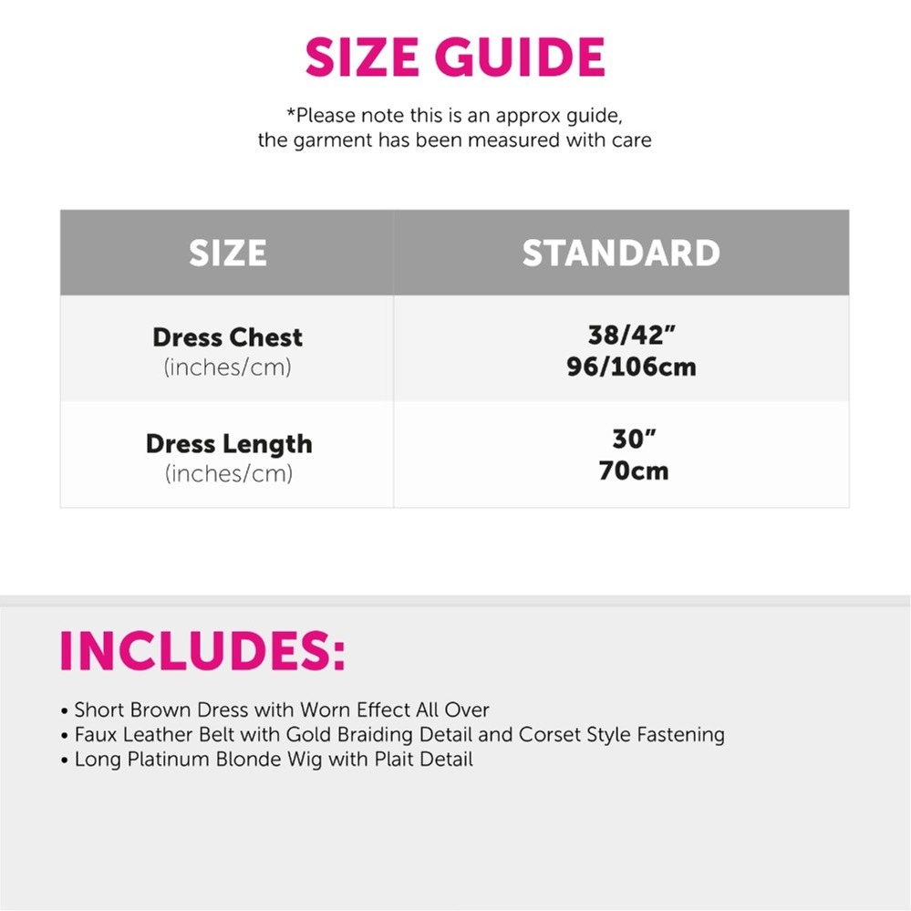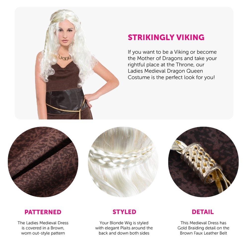 COSTUME DETAILS: Your Ladies Medieval Dragon Queen Costume includes a beautifully wavy, Long Blonde Wig with a delicate Plaited style on top and down both sides and a loose fitting, short Brown Dress with a rough, worn effect all over, a Faux Leather Belt with Corset style fastening and Gold Braiding detail!
