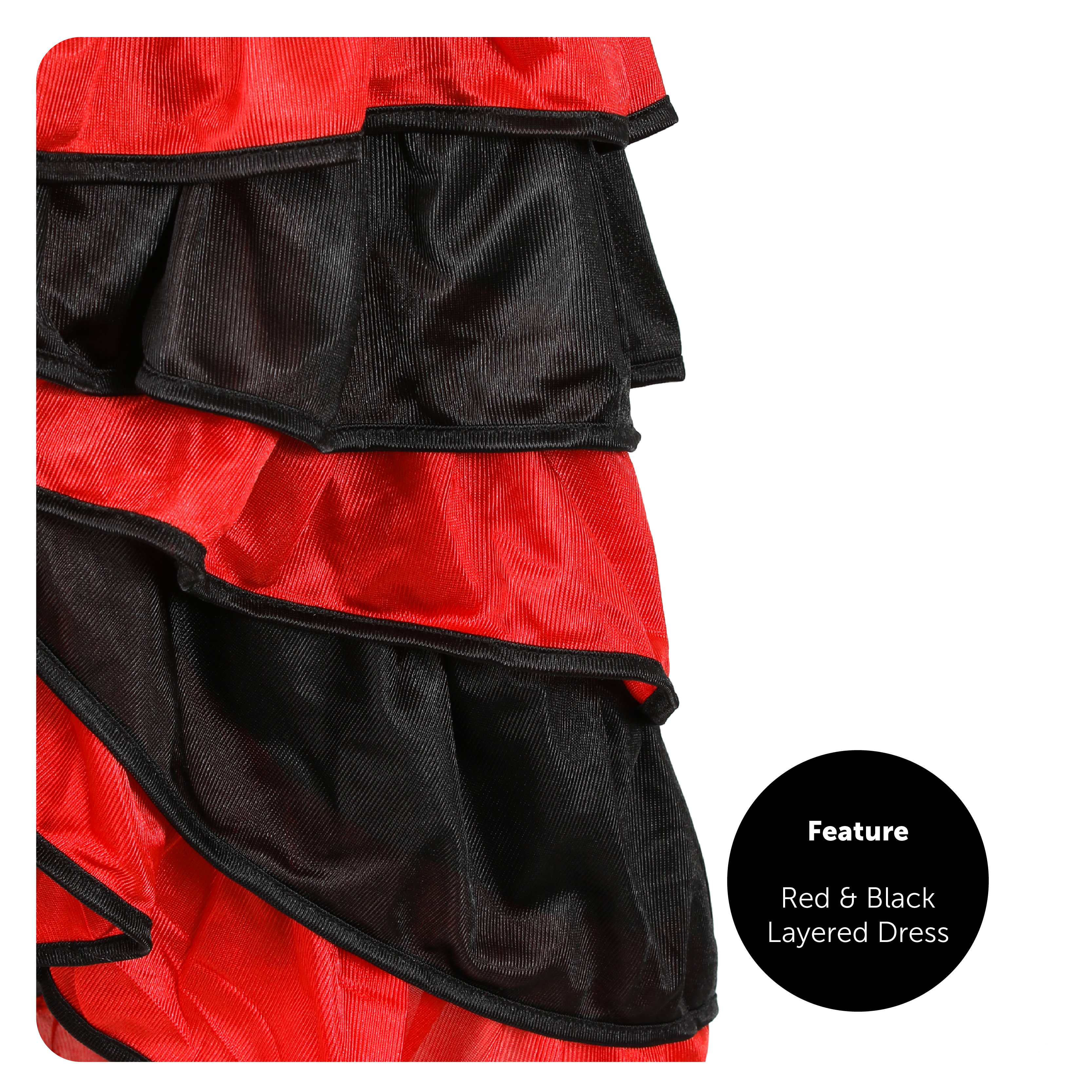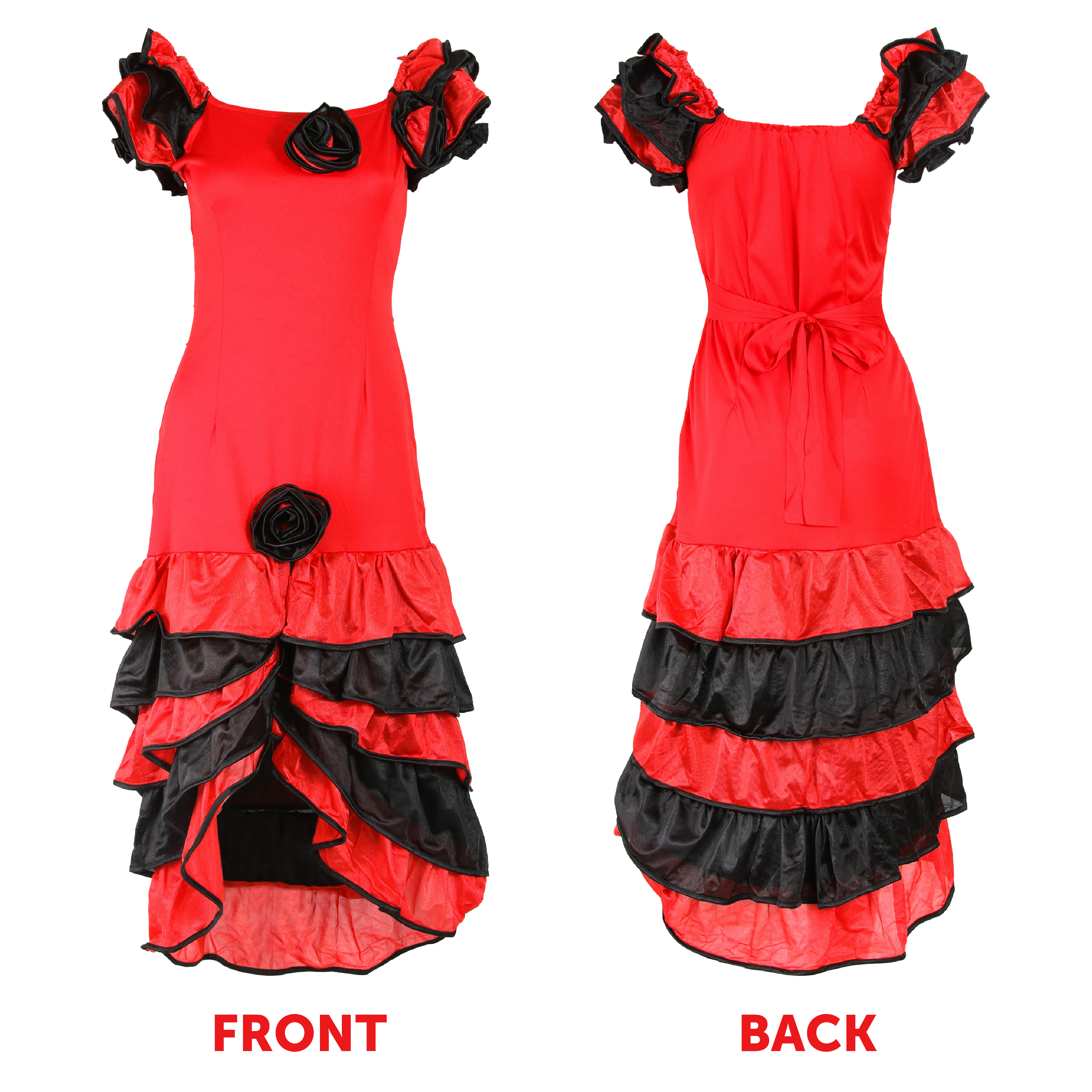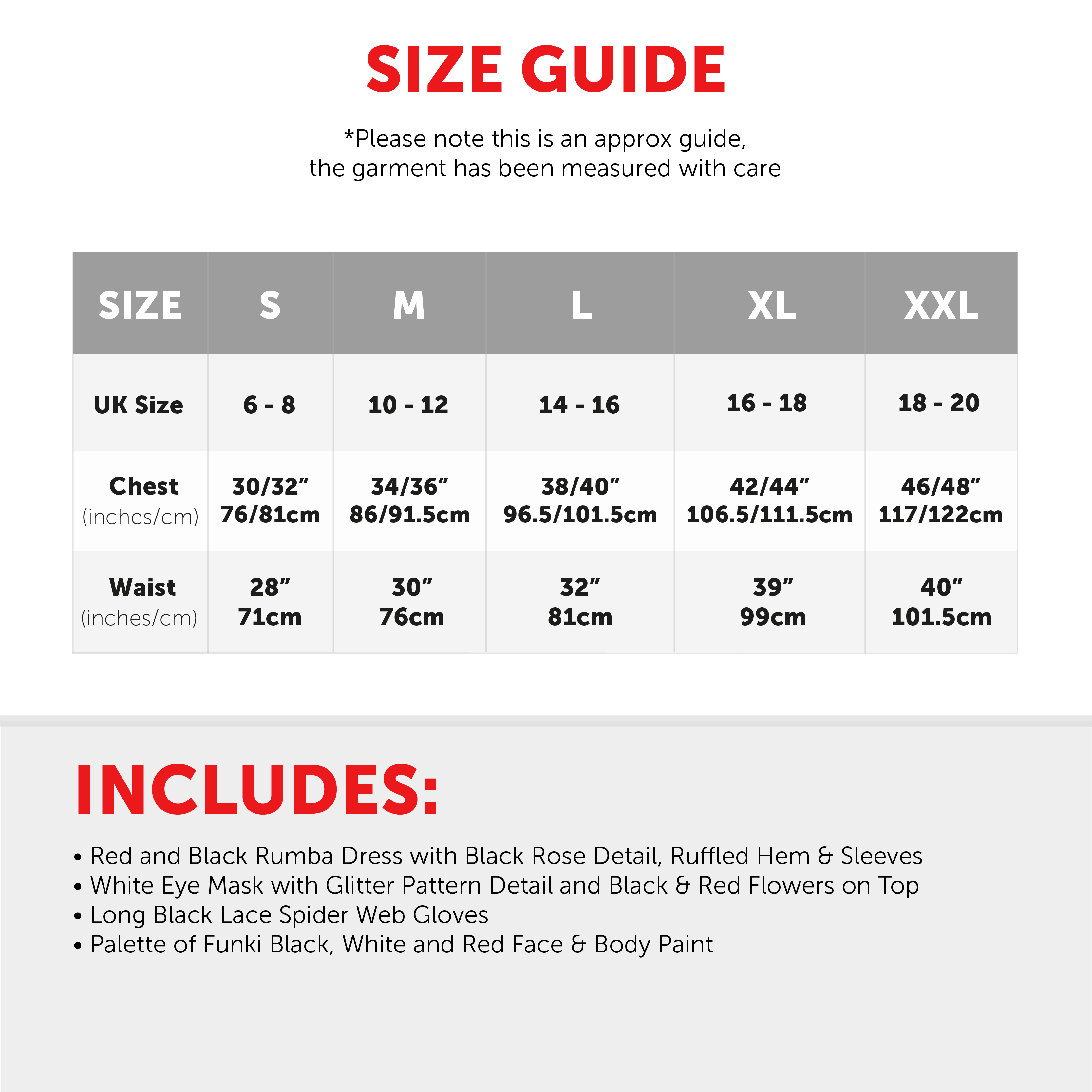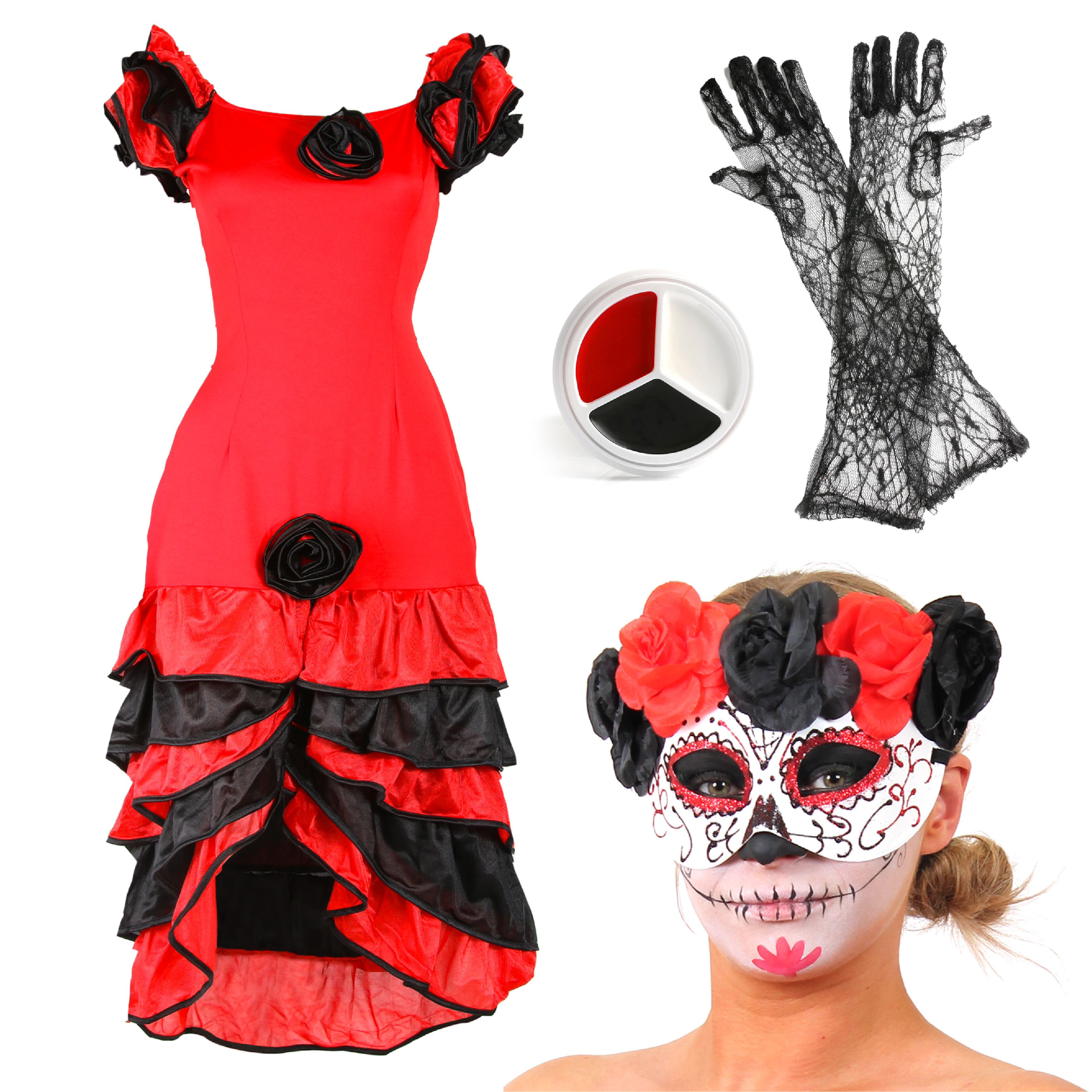 COSTUME INCLUDES: The Ladies Day of the Dead Costume includes a Red and Black Rumba Dress with Black Flower detail on the front and layered hems, a White Eye Mask with Glitter Detail and Red and Black Flowers on the top, Long Black Lace Spiderweb Gloves, and a palette of White, Black and Red Face and Body Paint, the perfect Halloween look!