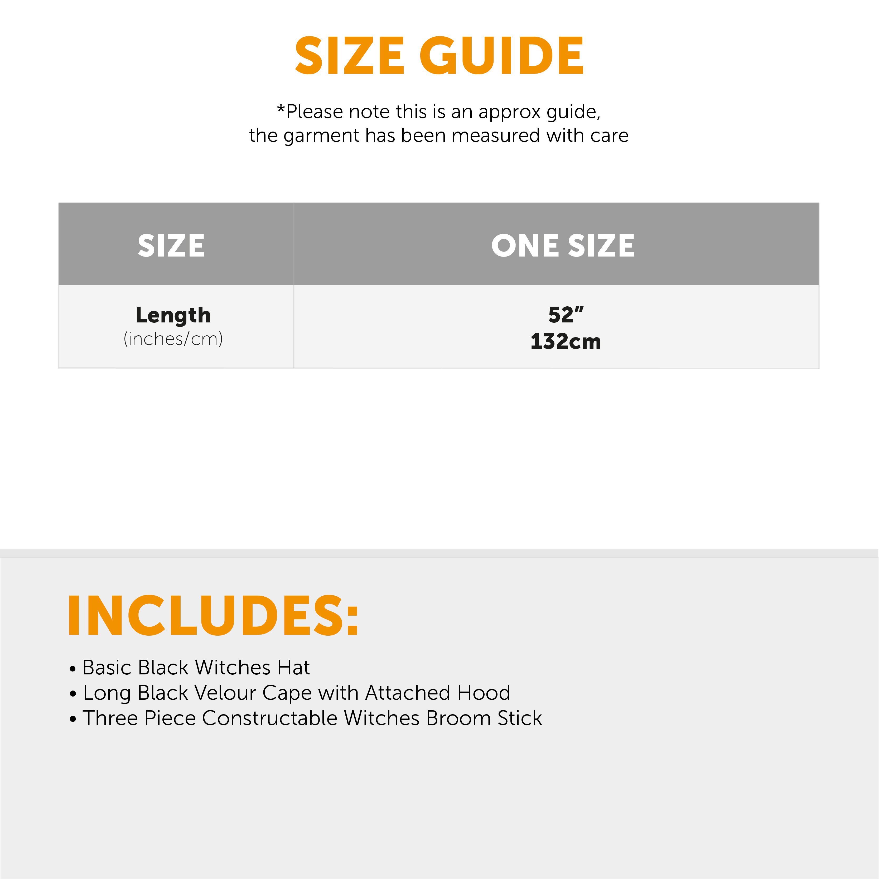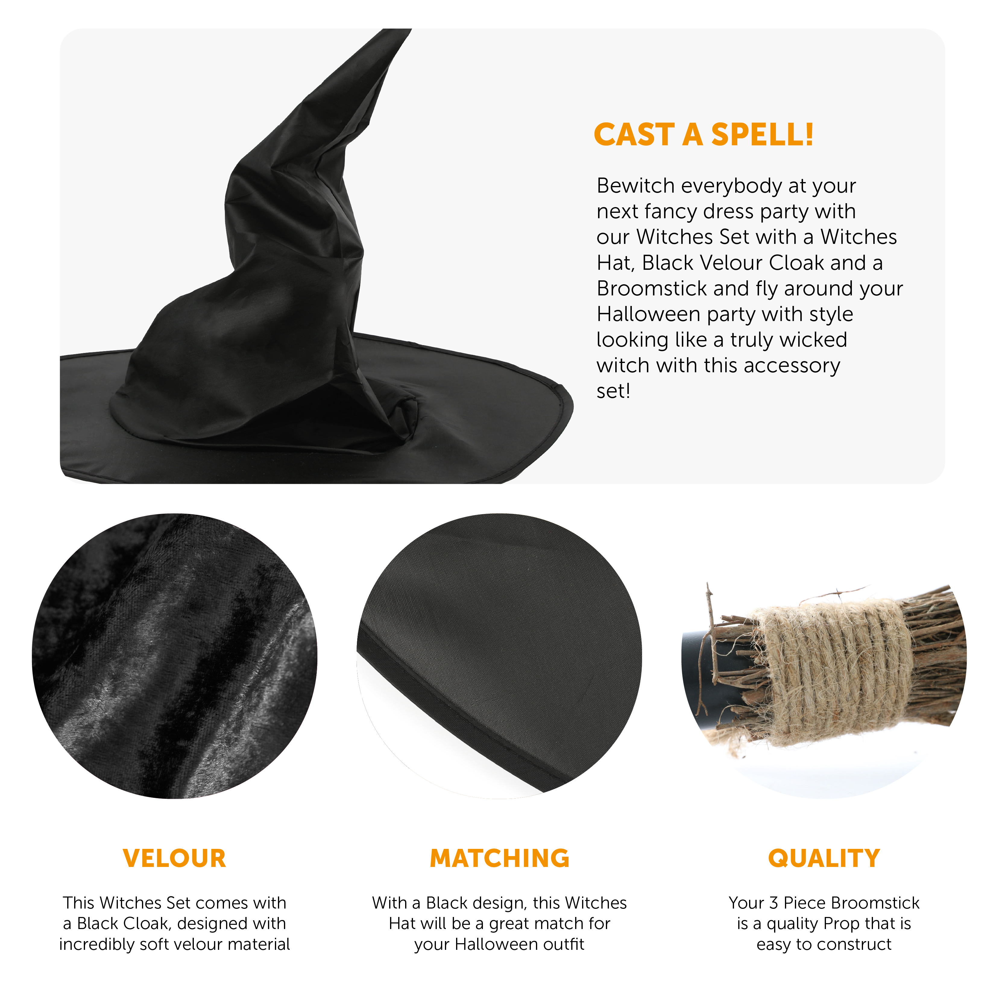 COSTUME DETAILS: The Adults Witch Costume includes a lightweight Black Witches Hat, a Long Black Velour Cloak with an attached Hood, and easy to tie fastening design, and a 3 Piece Witches Broomstick prop with an authentic design, the perfect set to accompany your spooky Witch style!