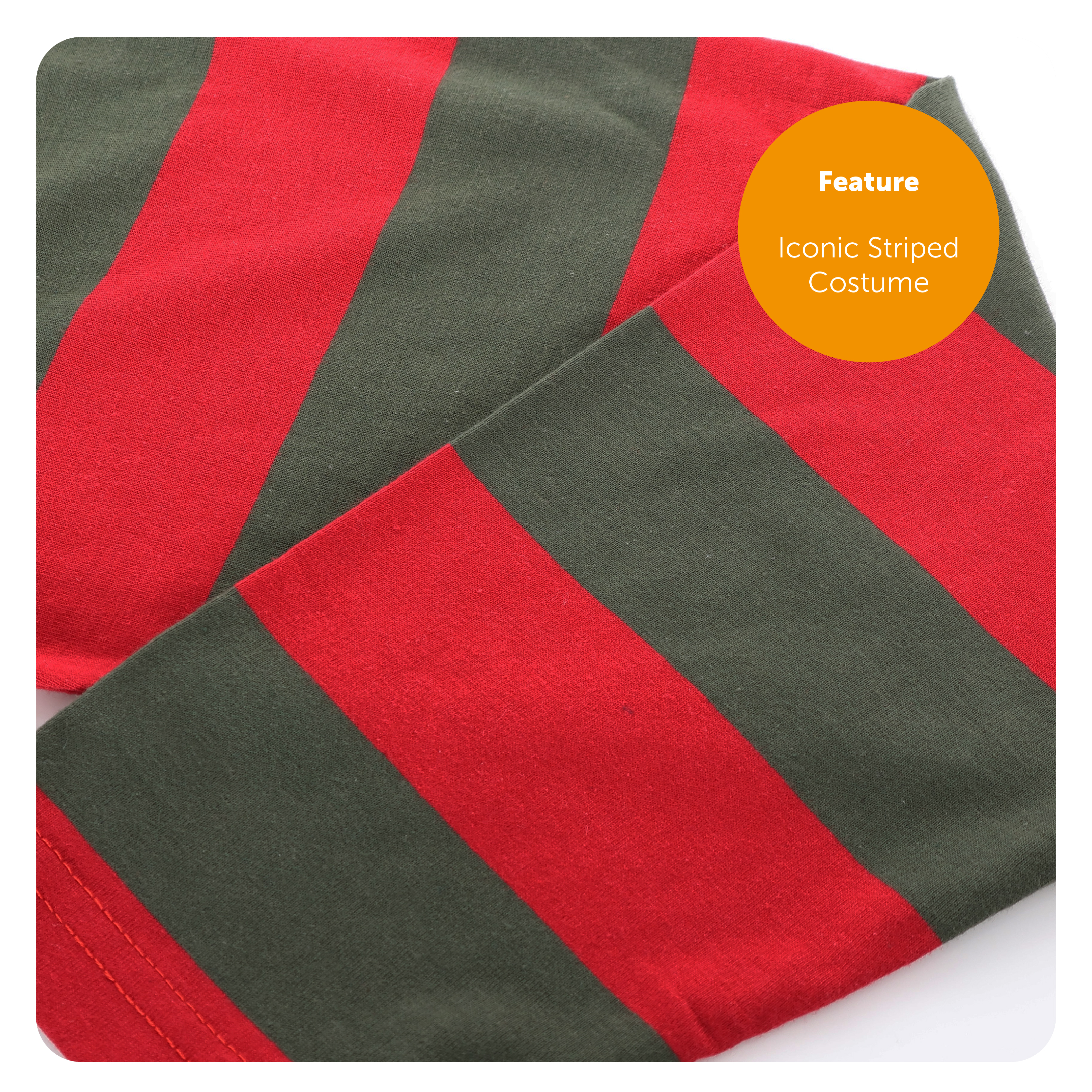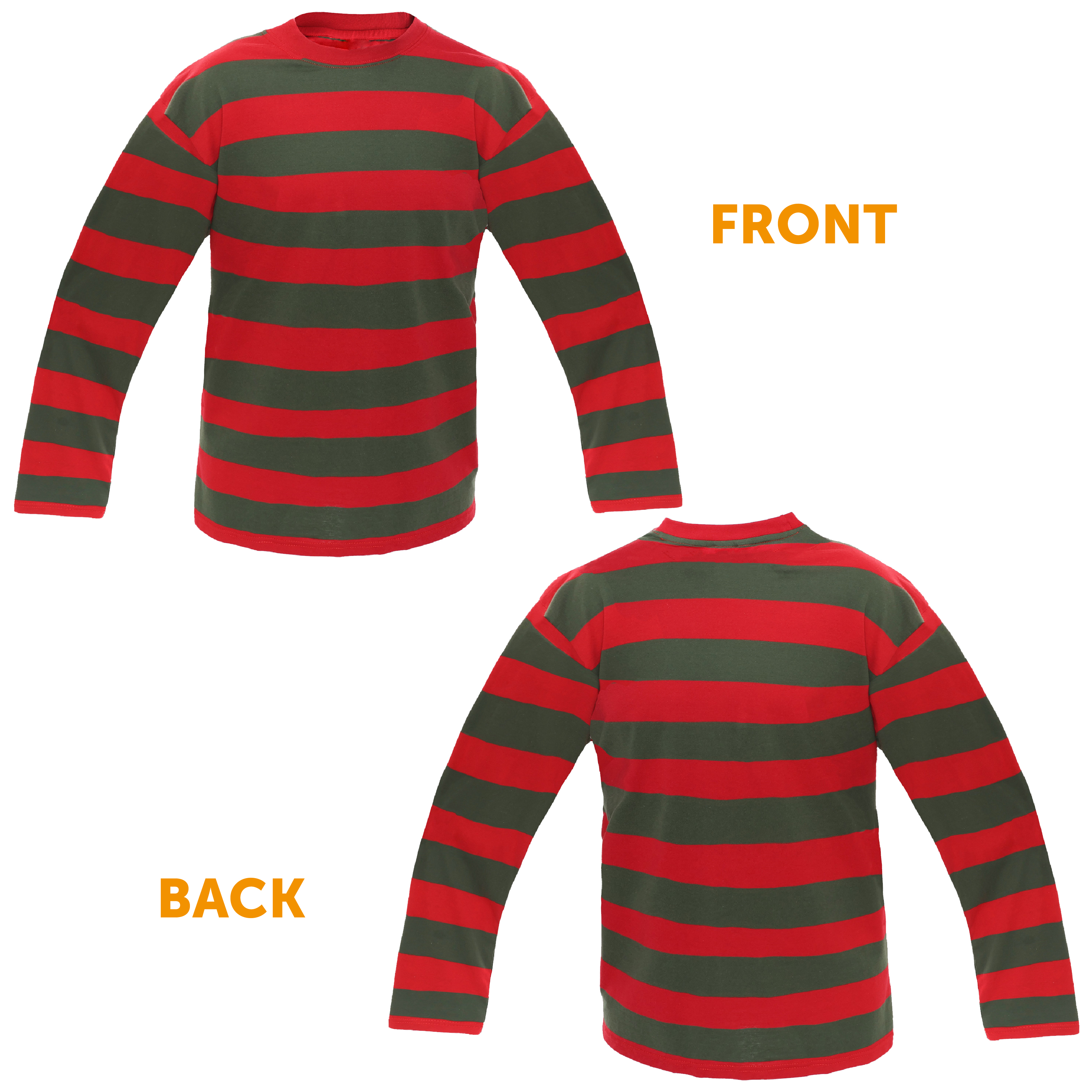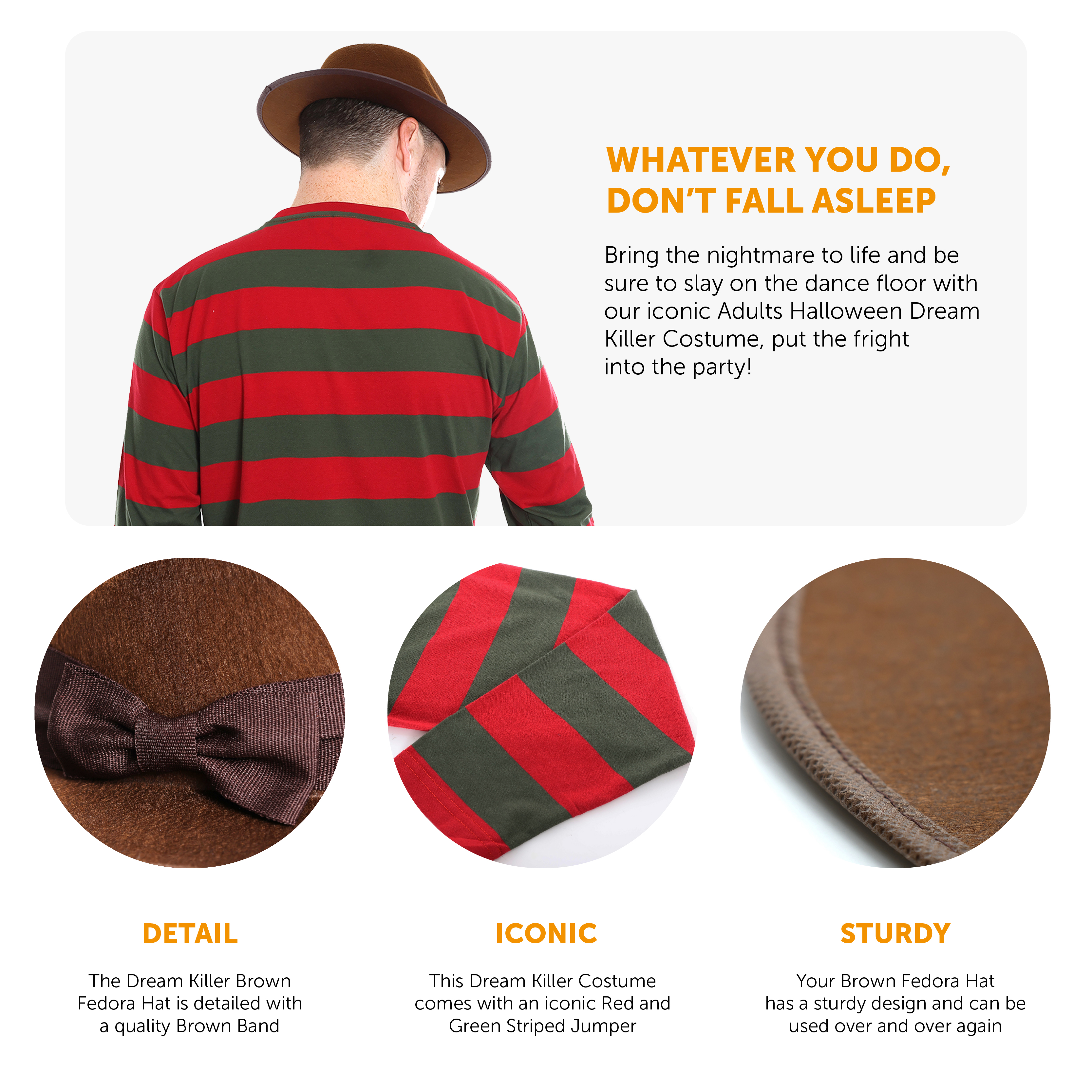 COSTUME INCLUDES: Your Adults Dream Killer Costume Set includes a Long Sleeved Red and Green Striped Top, and a sturdy Brown Fedora Hat with an attached decorative bow, the perfect Costume for this year's Halloween party!