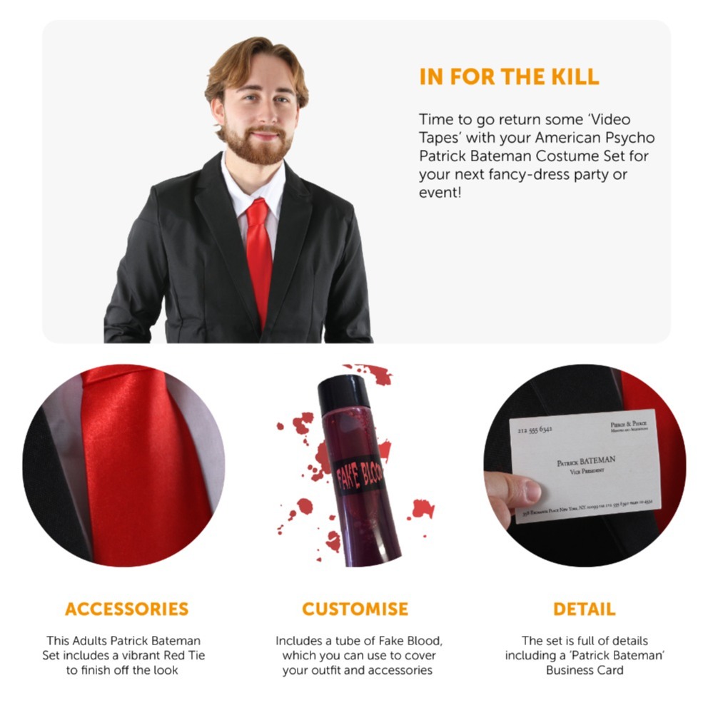 COSTUME INCLUDES: Your American Psycho costume includes a Red Tie, Bloody Axe, Patrick Bateman Business Card, and a Tube of Fake Blood, a perfect set for any movie fancy dress event!