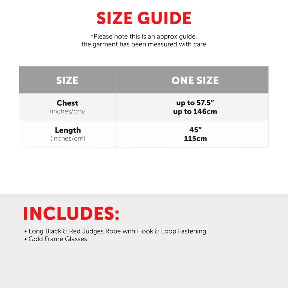 This Adult Judge’s Robe is designed to fit most adults comfortably, measuring approximately Chest: up to 57.5" (146cm) and Length: 45" (115cm).