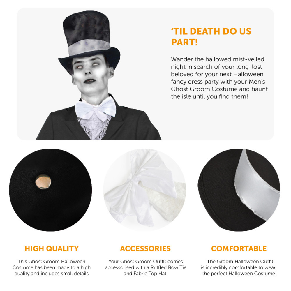 PERFECT FOR HALLOWEEN AND GOTHIC FANCY DRESS: Whether you’re seeking out your long-lost bride on Halloween, or for any Gothic fancy dress event or occasion, your Men’s Ghost Groom Costume is sure to be the centre of attention throughout the night!