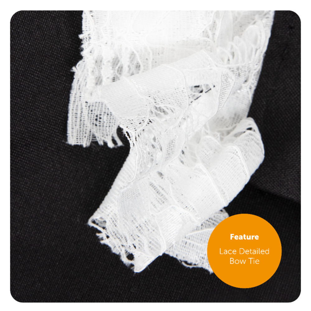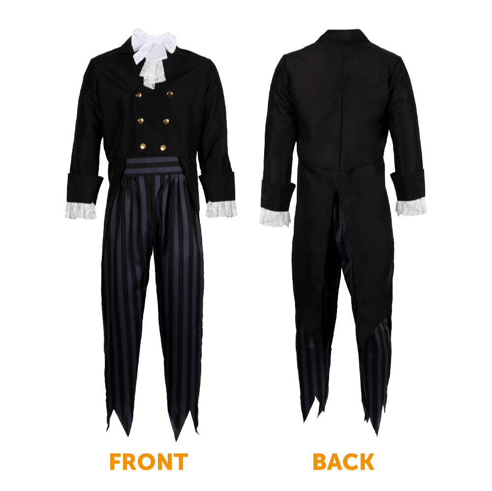 GHOST GROOM COSTUME DETAILS: Your Men’s Ghost Groom Costume includes a Black button up tailcoat jacket, Stripey black and grey trousers, a lace tie, and a Black Top Hat with a White band to complete the look!