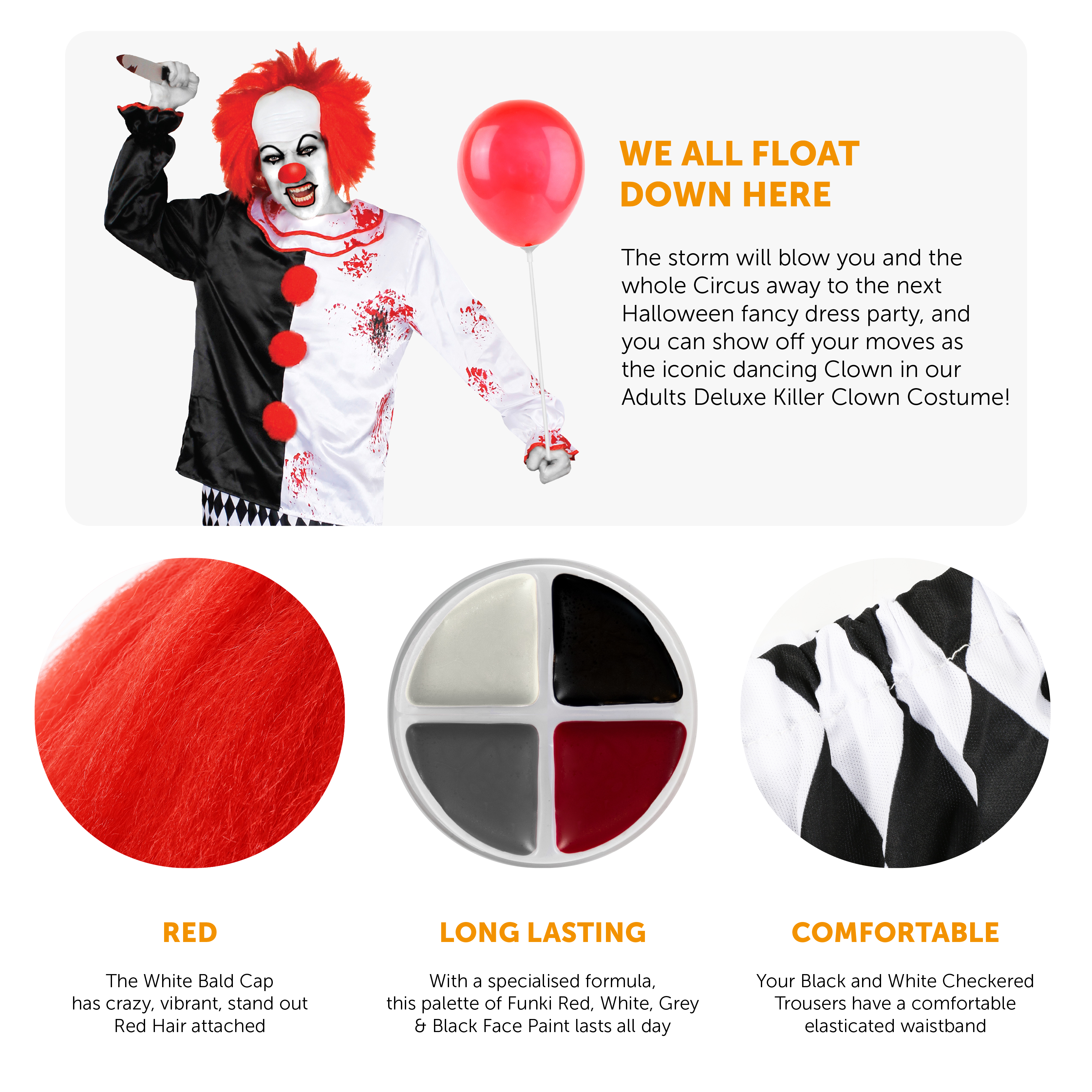 COSTUME DETAILS: Your Men's Deluxe Killer Clown Costume includes a Bloodstained Black and White Top, with Red Pom Pom Buttons, Black and White Checkered Trousers, a White Bald Cap with a long Red Wig attached, White Gloves, a Red Balloon with a Balloon Stick, and a palette of Black, White, Grey and Red Face Paint with a Sponge and a Tube of Fake Blood, a perfect costume to get yourself set to being a terror of the night!