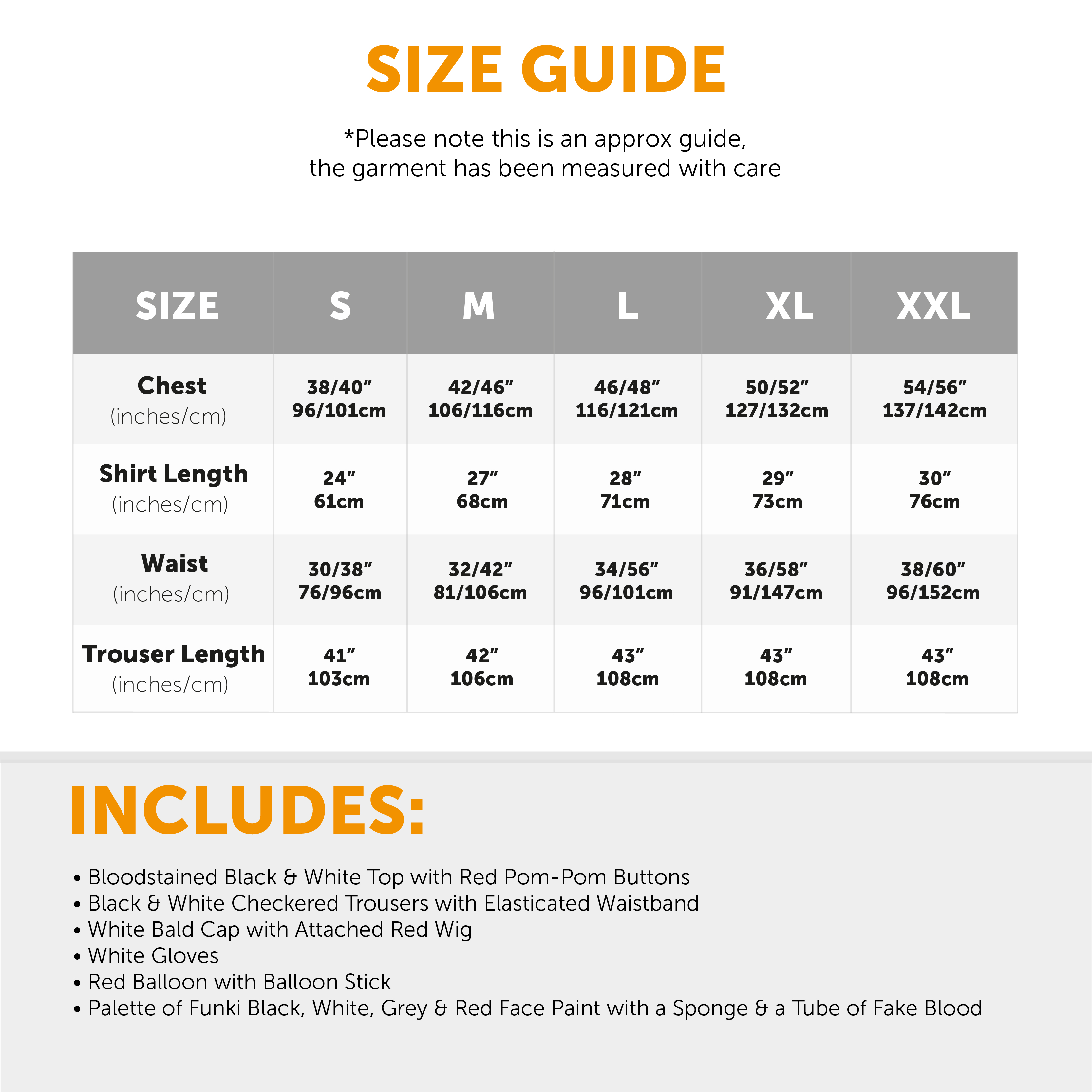 AVAILABLE IN MULTIPLE SIZES: Your Men's Deluxe Killer Clown Halloween Costume is available in multiple sizes from Small to X-Large: Small: Chest: 38/40" (96/101cm), Shirt Length: 24" (61cm), Waist: 30/38" (76/96cm), Leg Length: 41" (103cm) | Medium: Chest: 42/46"(106/116cm), Shirt Length: 27" (68cm), Waist: 32/42" (81/106cm), Leg Length: 42" (106cm) | Large: Chest: 46/48" (116/121cm), Shirt Length: 28" (71cm), Waist: 34/56" (86/142cm), Leg Length: 43" (108cm) | X-Large: Chest: 50/52" (127/132cm), Shirt Length: 29" (73cm), Waist: 36/58" (91/147cm), Leg Length: 43" (108cm) | XX-Large: Chest: 54/56 (137/142cm), Shirt Length: 30" (76cm), Waist: 38/60" (96/152cm), Leg Length: 43" (108cm)