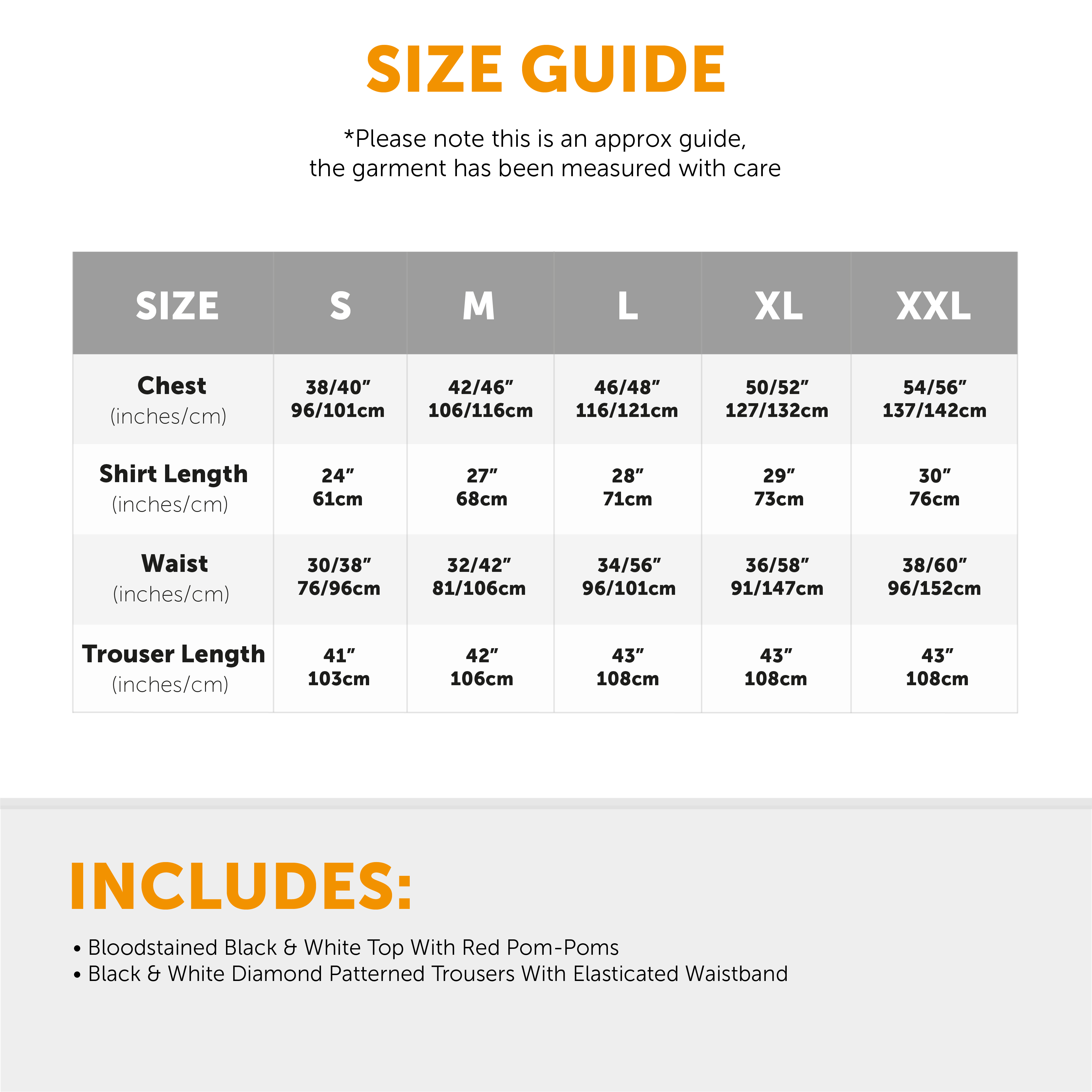 XXLARGE: CHEST: 54-56"/137-142CM, SHIRT LENGTH: 30"/76CM, WAIST: 38-60"/96-152CM, TROUSER LENGTH: 43"/108CM