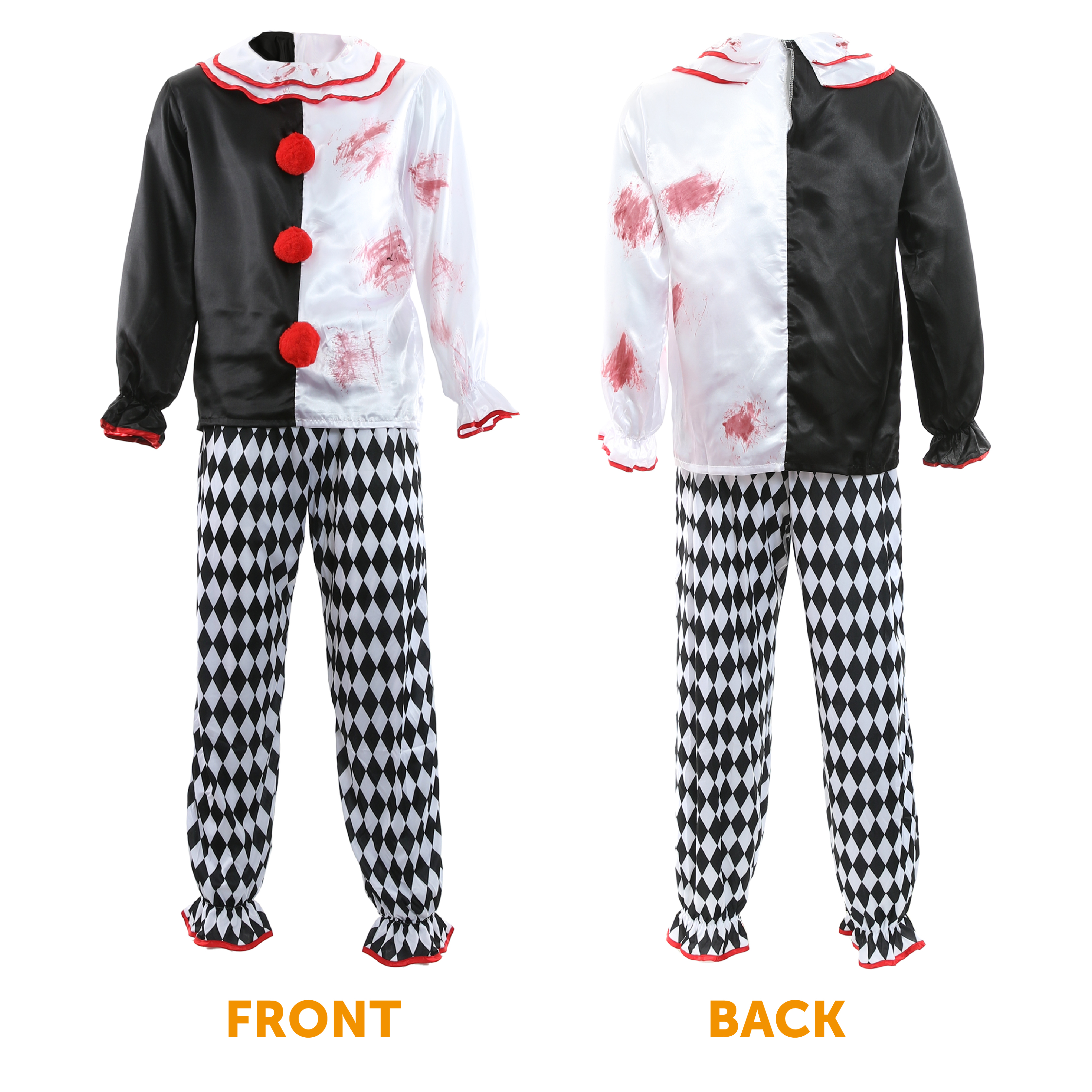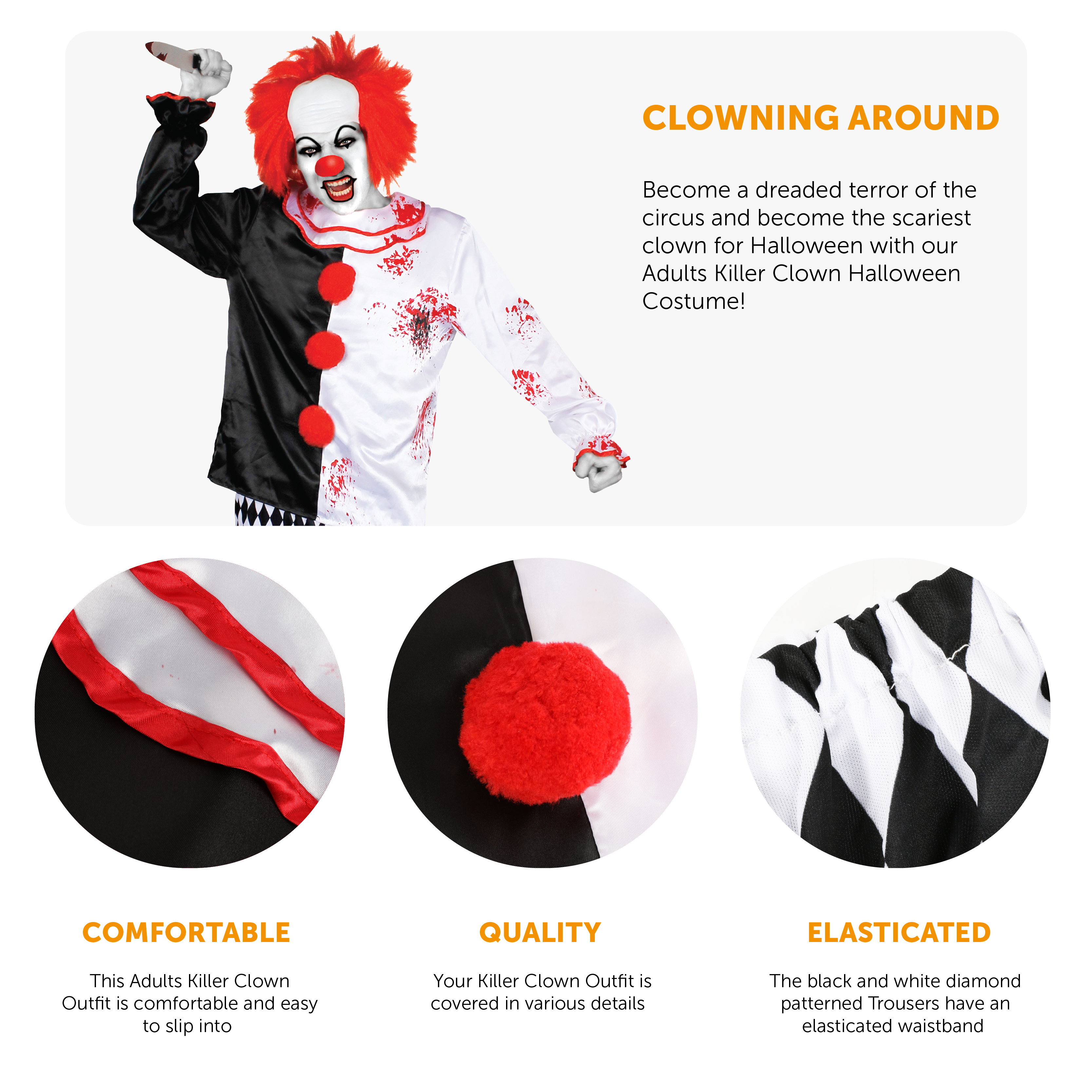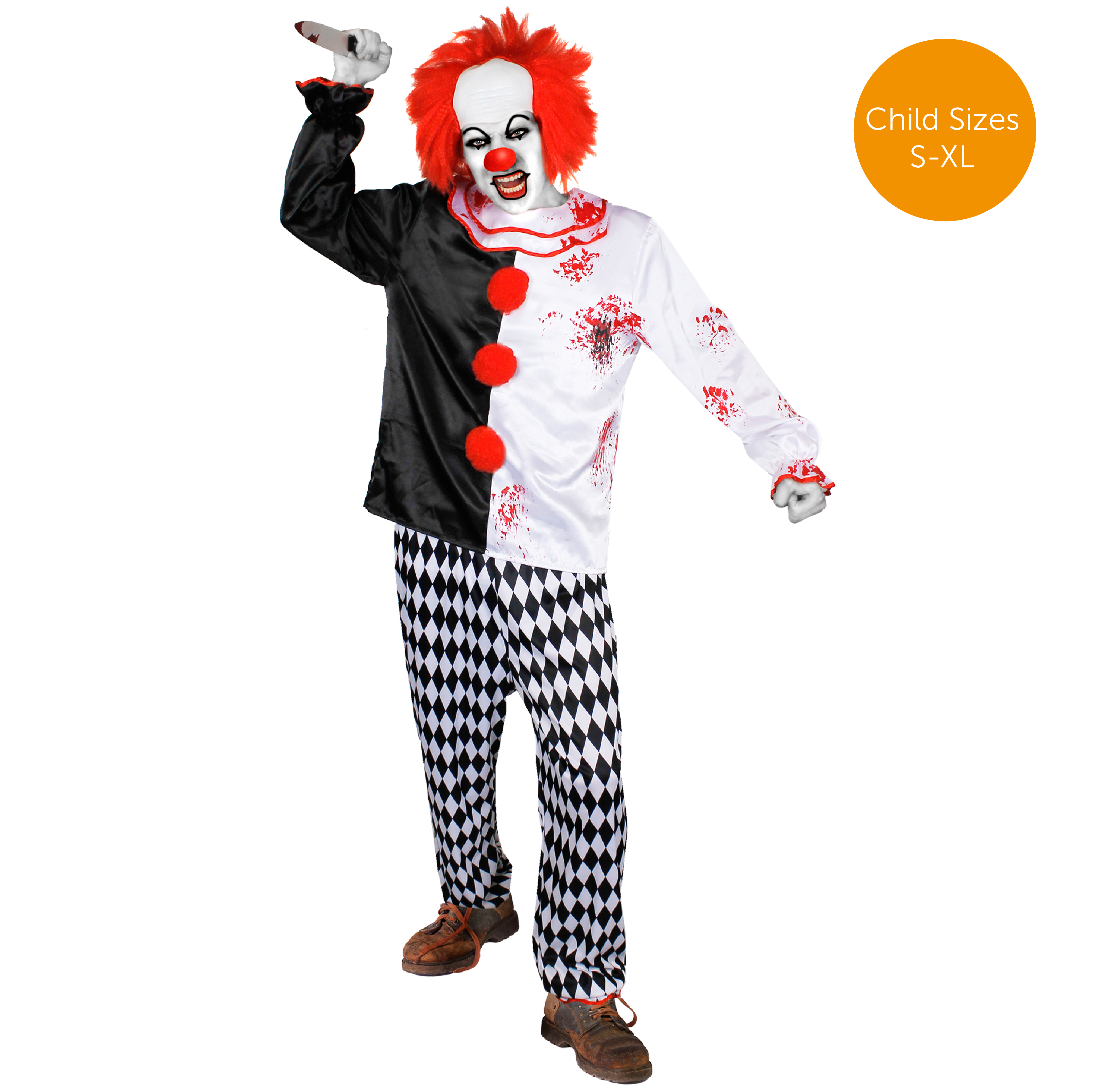 COSTUME DETAILS: Your Adults Killer Clown Halloween Costume contains a Bloodstained Black and White Top & Checked Trousers, a perfect costume to get yourself set to being a terror of the night!