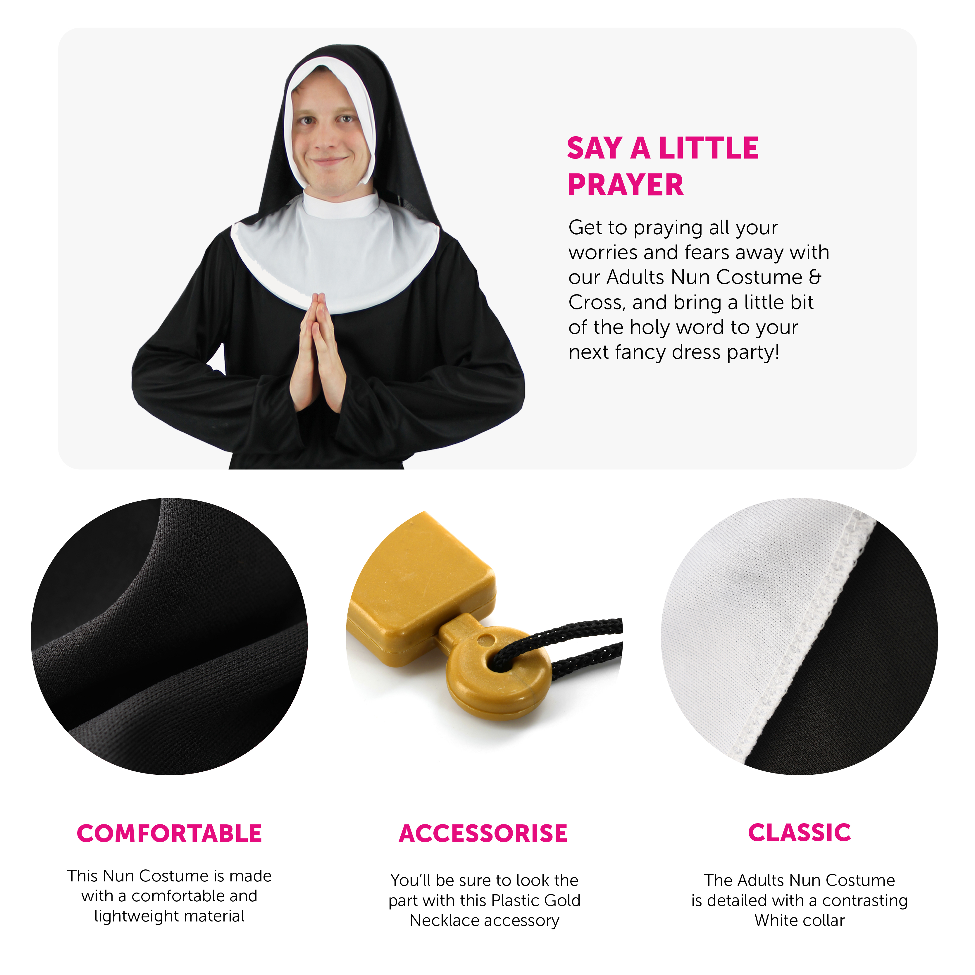 COSTUME INCLUDES: Your Adults Nun Costume includes a Black Long Loose-Fitting Tunic with White Nun Collar, a Black Belt, a Black Cowl, and a Plastic Gold Cross Necklace, for you to look like the real deal at the next fancy dress event!