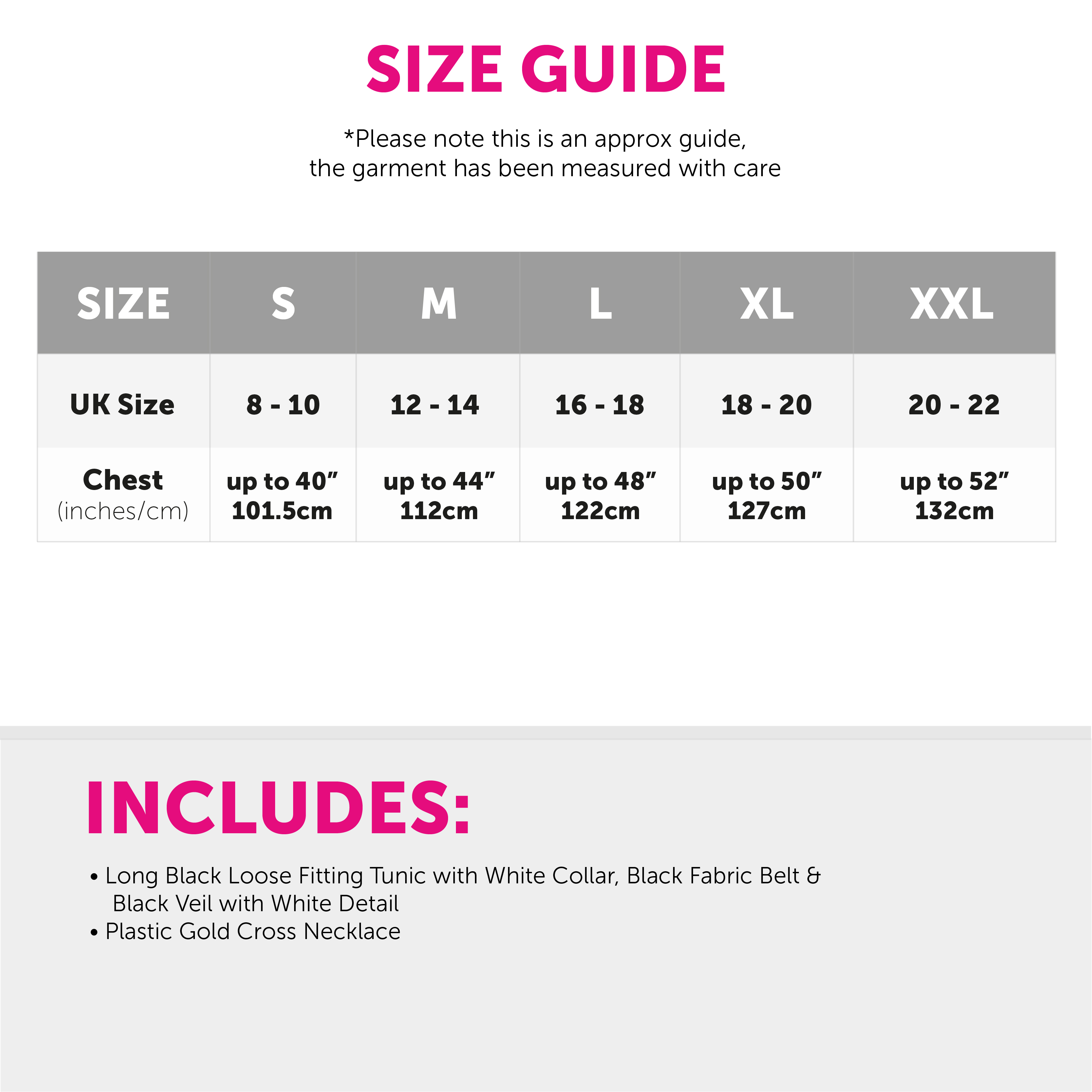 AVAILABLE IN MULTIPLE SIZES: Your Adults Nun Costume is unisex and is available in sizes Small to XX-Large: Small (UK Size 8 - 10) Chest up to 40" (101.5cm) | Medium (UK Size 12 - 14), Chest up to 44" (112cm) | Large (UK Size 16 - 18), Chest up to 48" (122cm) | X Large (UK Size 18 - 20), Chest up to 50" (127cm) | XX Large (UK Size 20 - 22), Chest up to 52" (132cm)