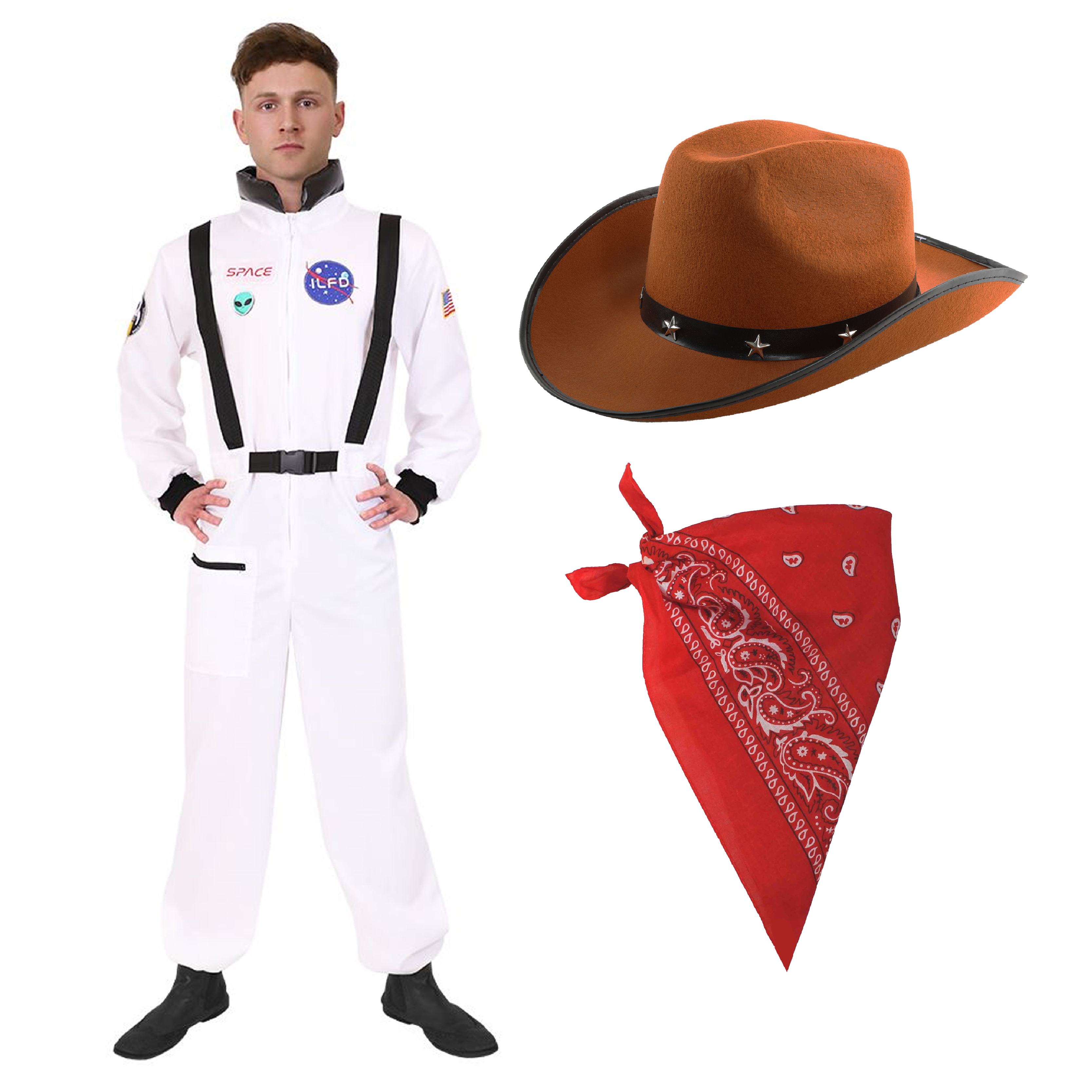 Men's Space Cowboy Costume | 3 Pcs | Space Suit, Brown Star Studded Hat & Red Bandana