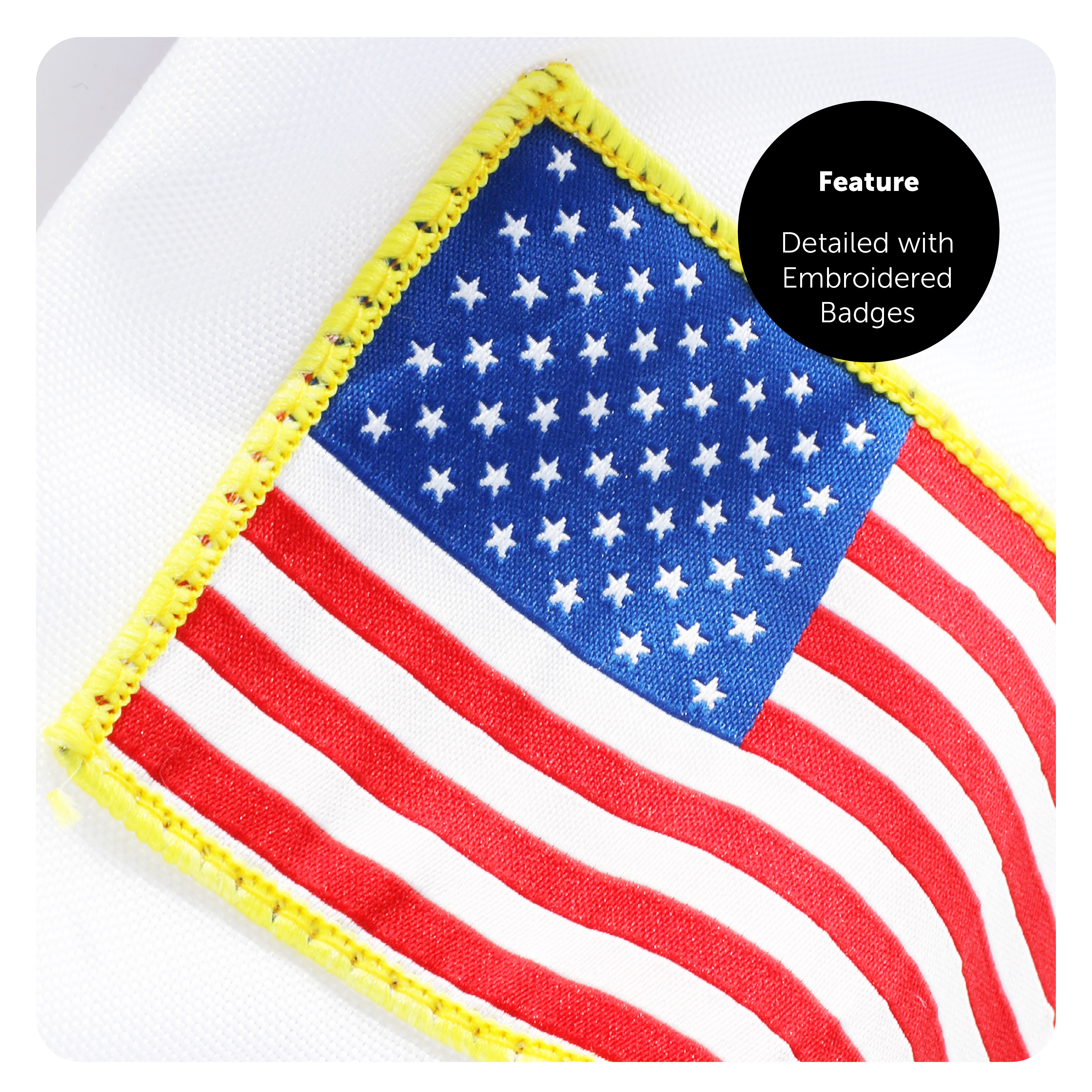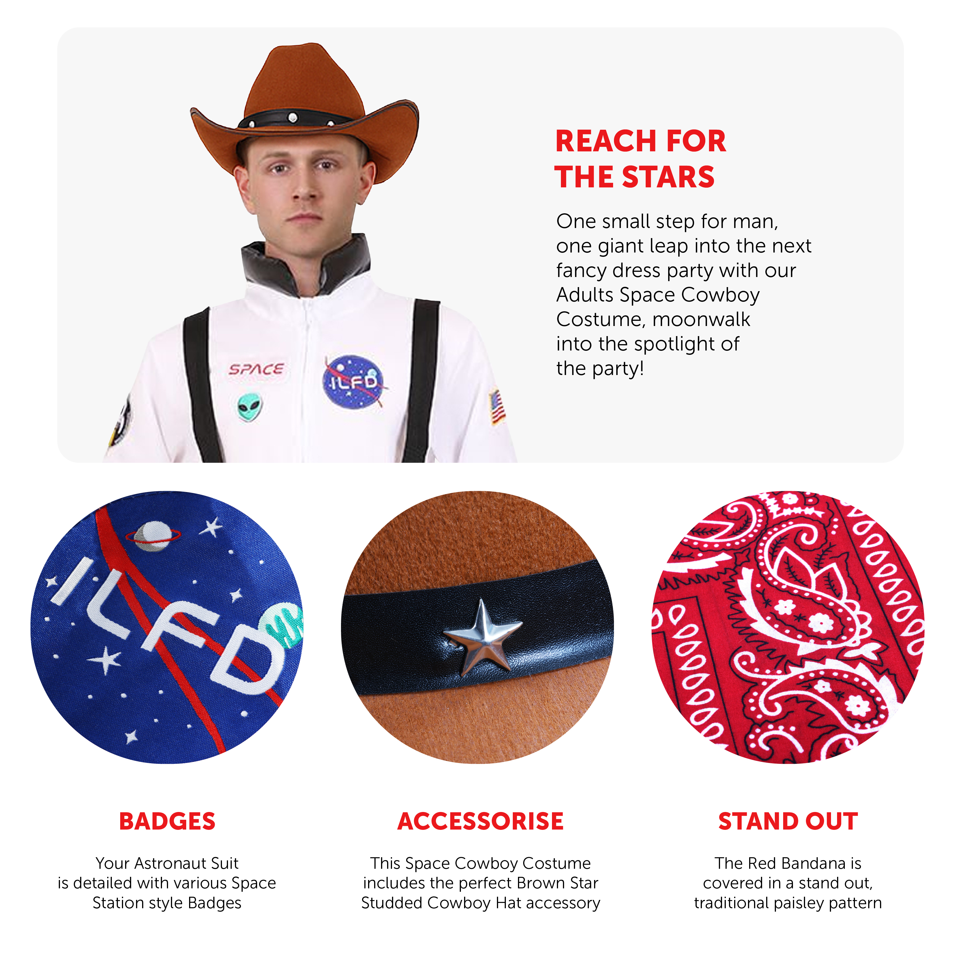 COSTUME INCLUDES: Your Adults Space Cowboy Costume includes a White Astronaut Jumpsuit, with space station badges & black clip buckle at the waist, a Brown Cowboy Hat with Silver Star Studs around the band, and a Red Bandana with a traditional Paisley pattern, to complete your costume!