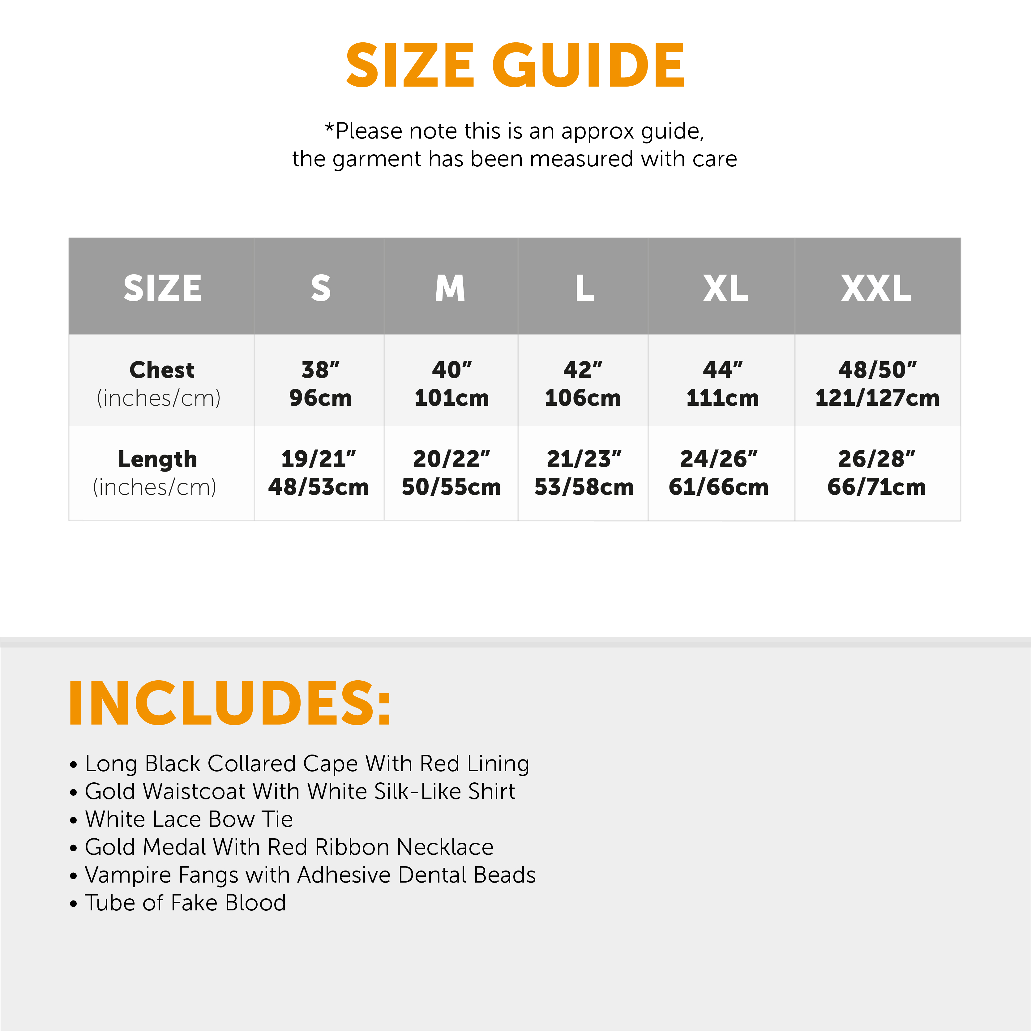 AVAILABLE IN MULTIPLE SIZES: Your Men’s Vampire Costume is available in multiple sizes from Small to XX-Large: Small - Chest 38" (96cm), Length 19/21" (48/53cm) | Medium - Chest 40" (101cm), Length 20/22" (50/55cm) | Large - Chest 42” (106cm), Length 21/23” (53/58cm) | X-Large - Chest 44” (111cm), Length 24/26” (61/66cm) | XX-Large - Chest 48/50” (121/127cm), Length 26/28” (66/71cm)