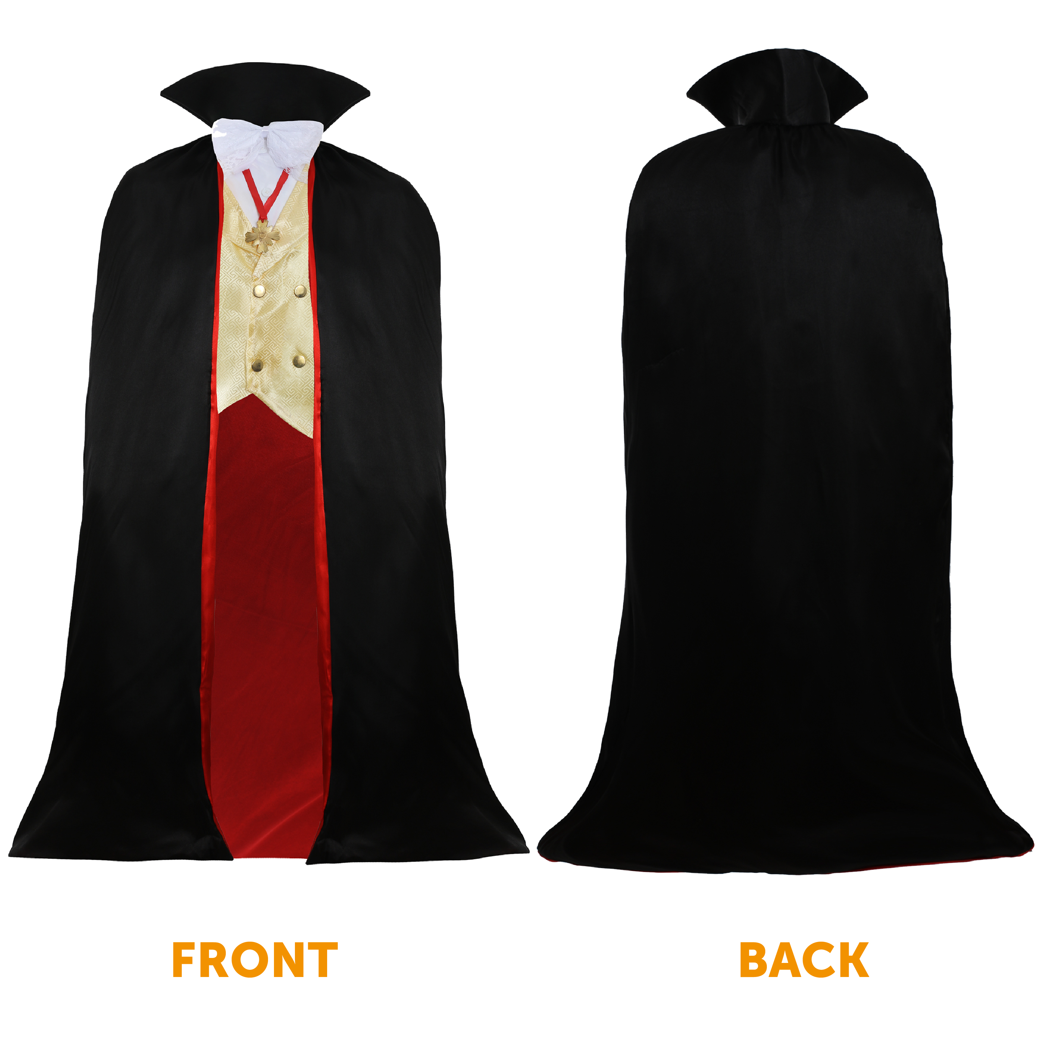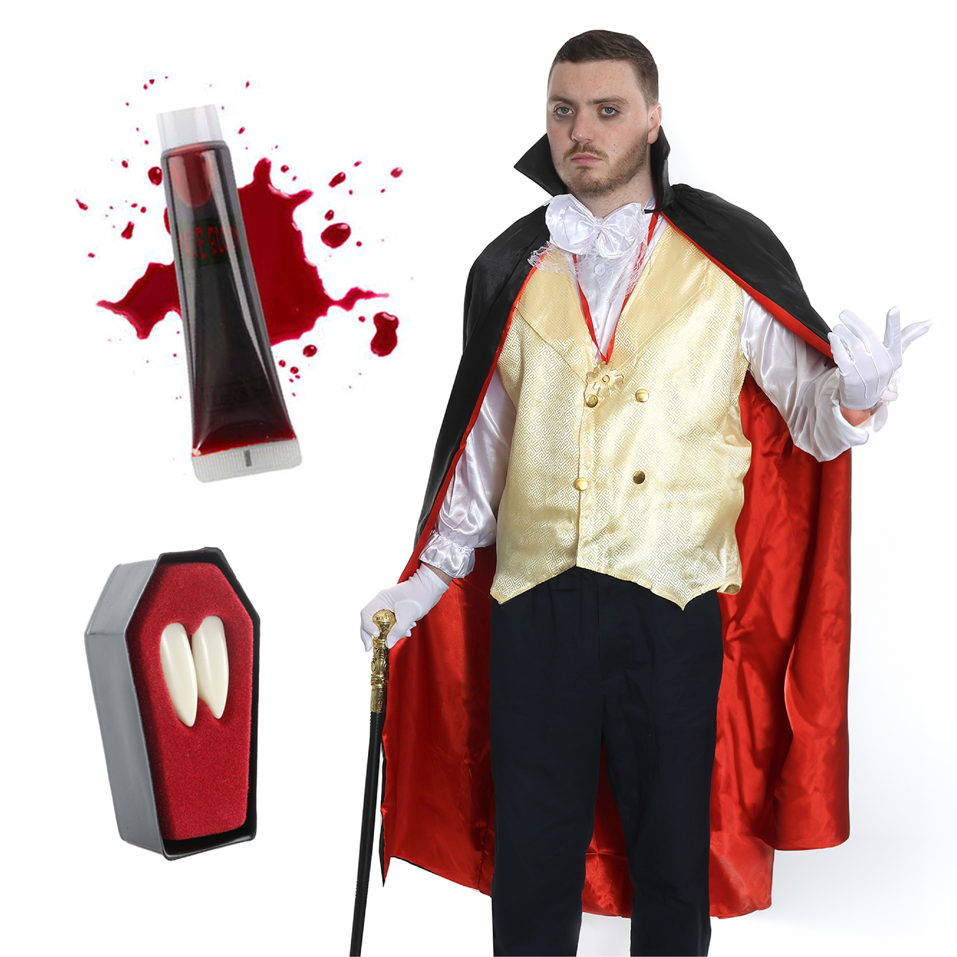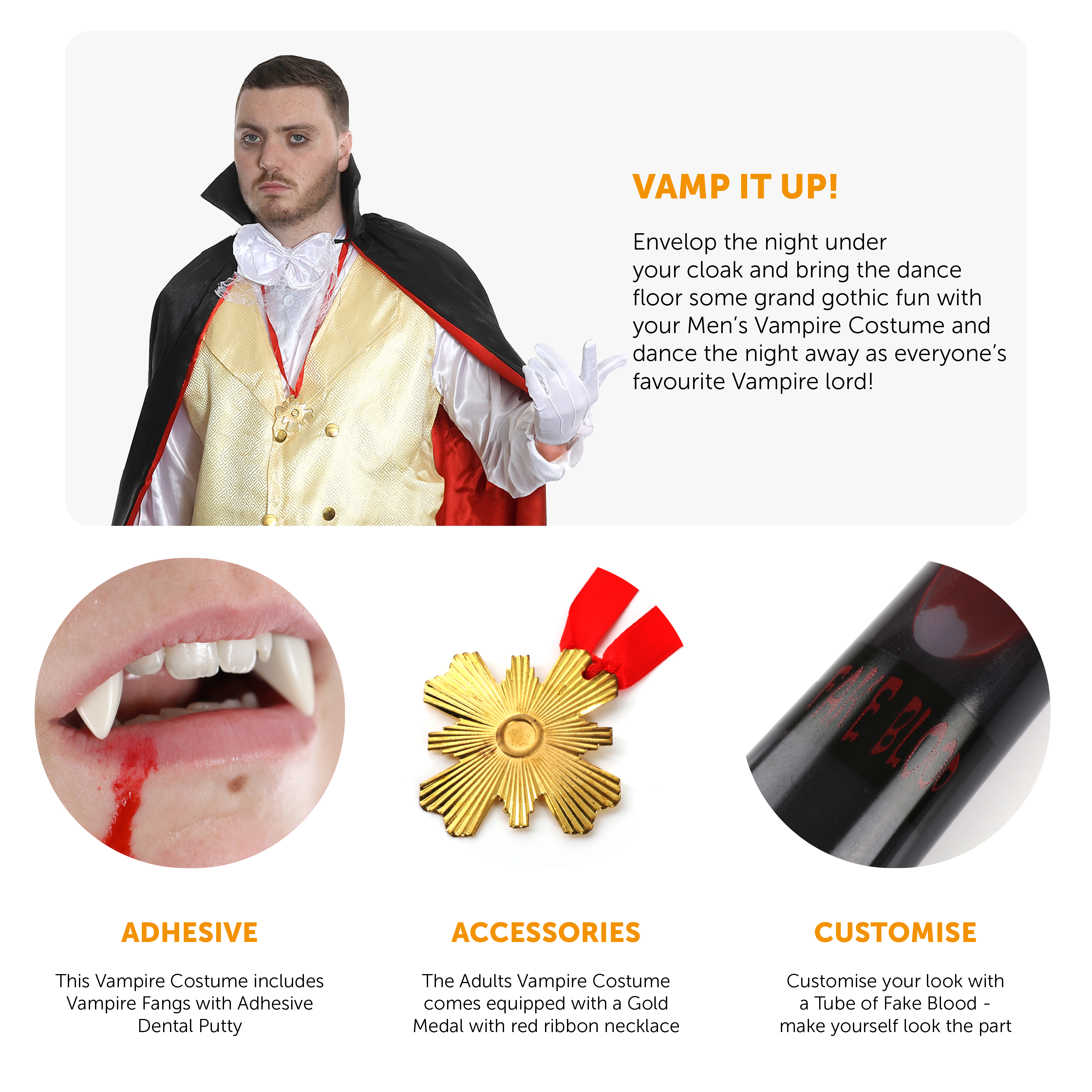 COSTUME INCLUDES: Your Men’s Vampire Costume includes a Gold Waistcoat with White Shirt, a Medal with a Red Necklace, a White Bow Tie, a Black Collared Cape with a Red interior, Vampire Fangs with Adhesive Dental Putty!