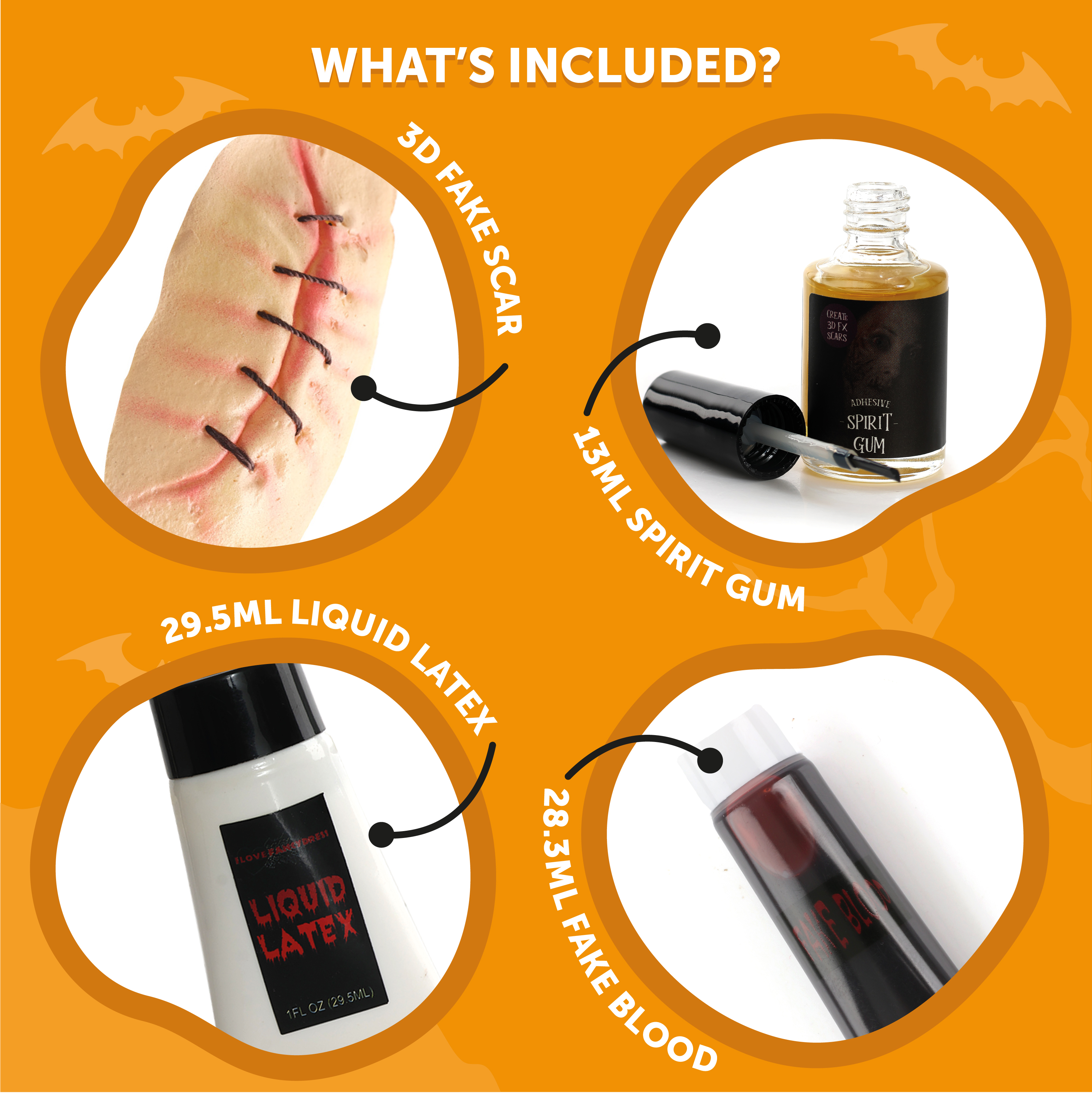 SET INCLUDES: This Scar Set includes a Fake 3D Scar with stitching detail, a 13ml Bottle of clear adhesive Spirit Gum with a small brush attached to the inside of the lid, a Bottle of Liquid Latex and a Tube of Fake Blood, perfect to finish off your look!