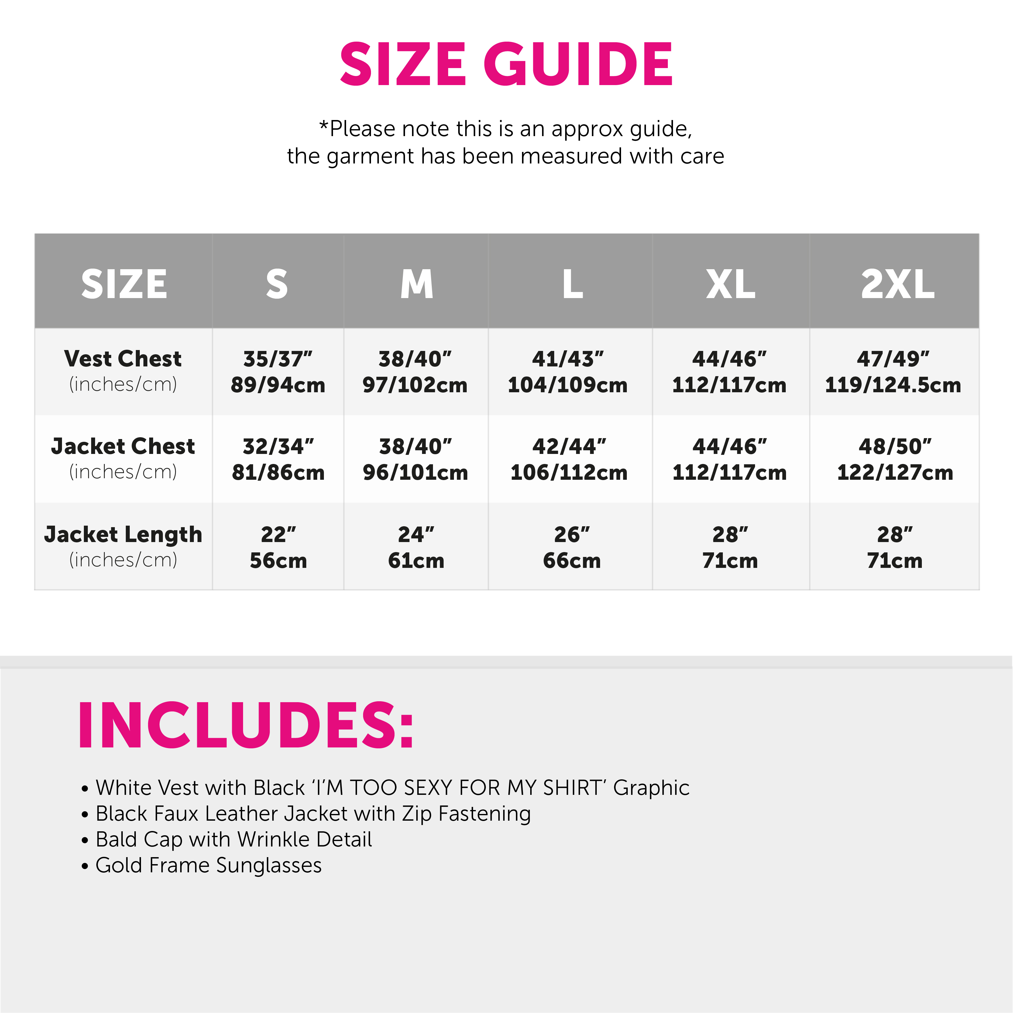 "I'm Too Sexy for My Shirt" Costume – White Vest, Bald Cap, Aviator Sunglasses & Leather Jacket (Adults)   £29.99