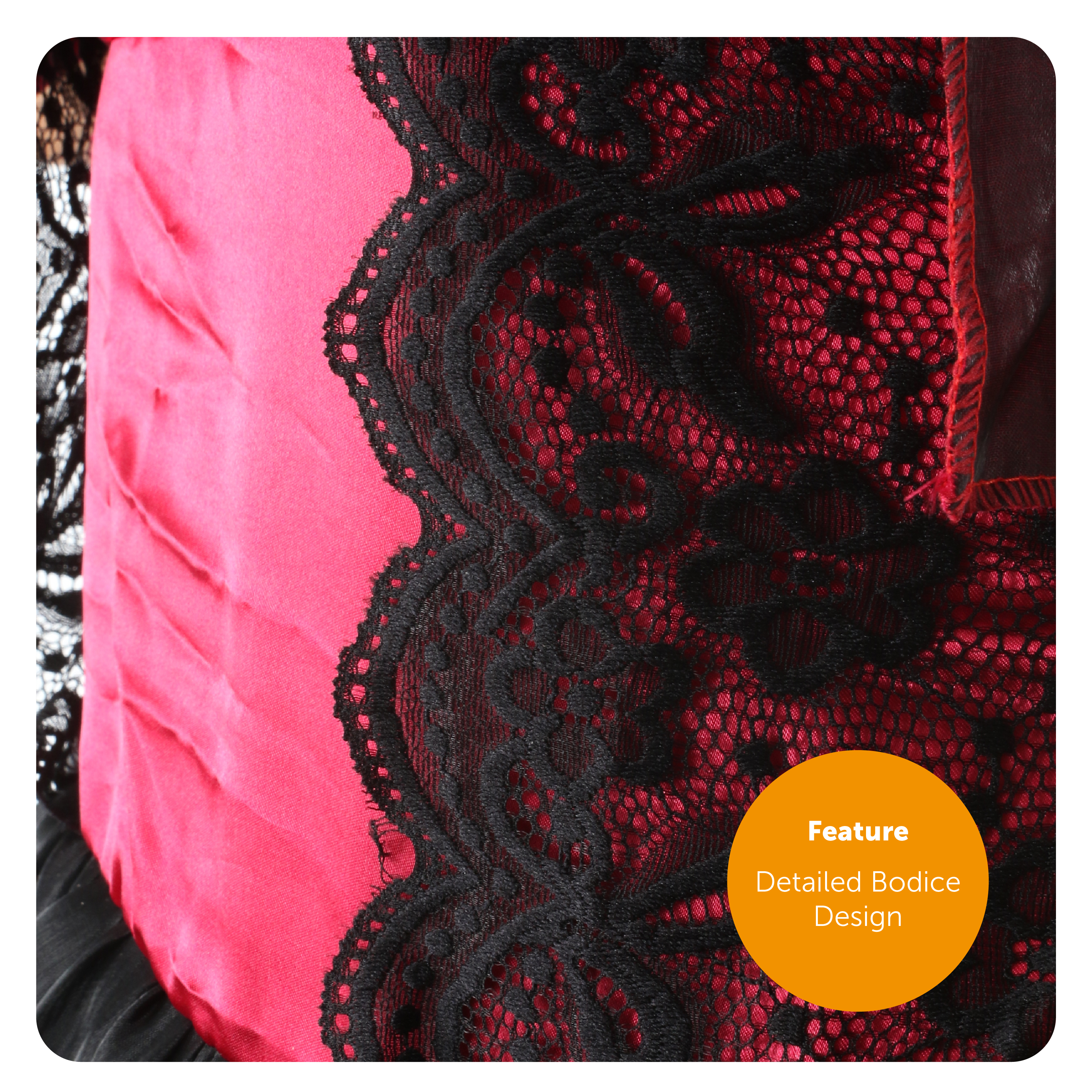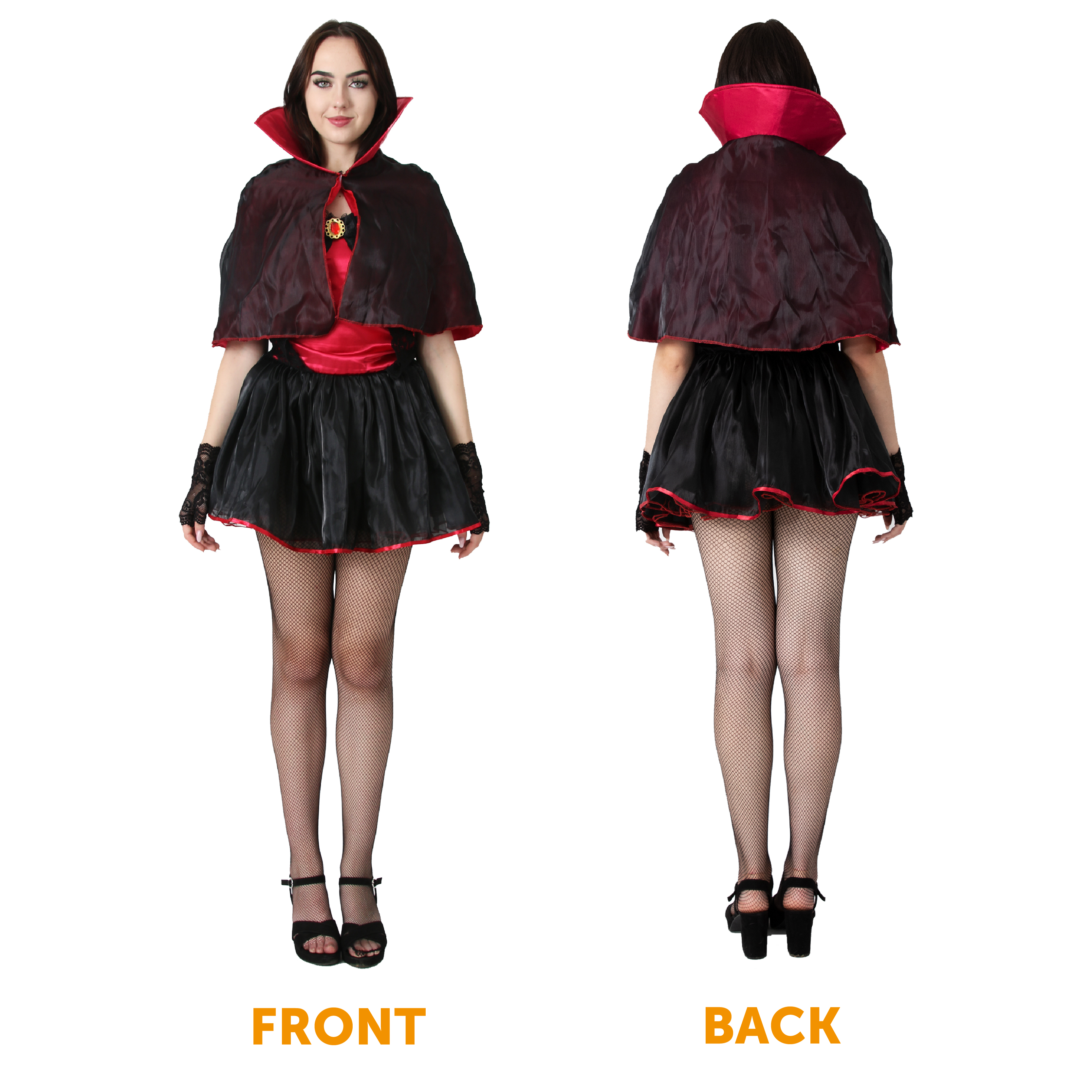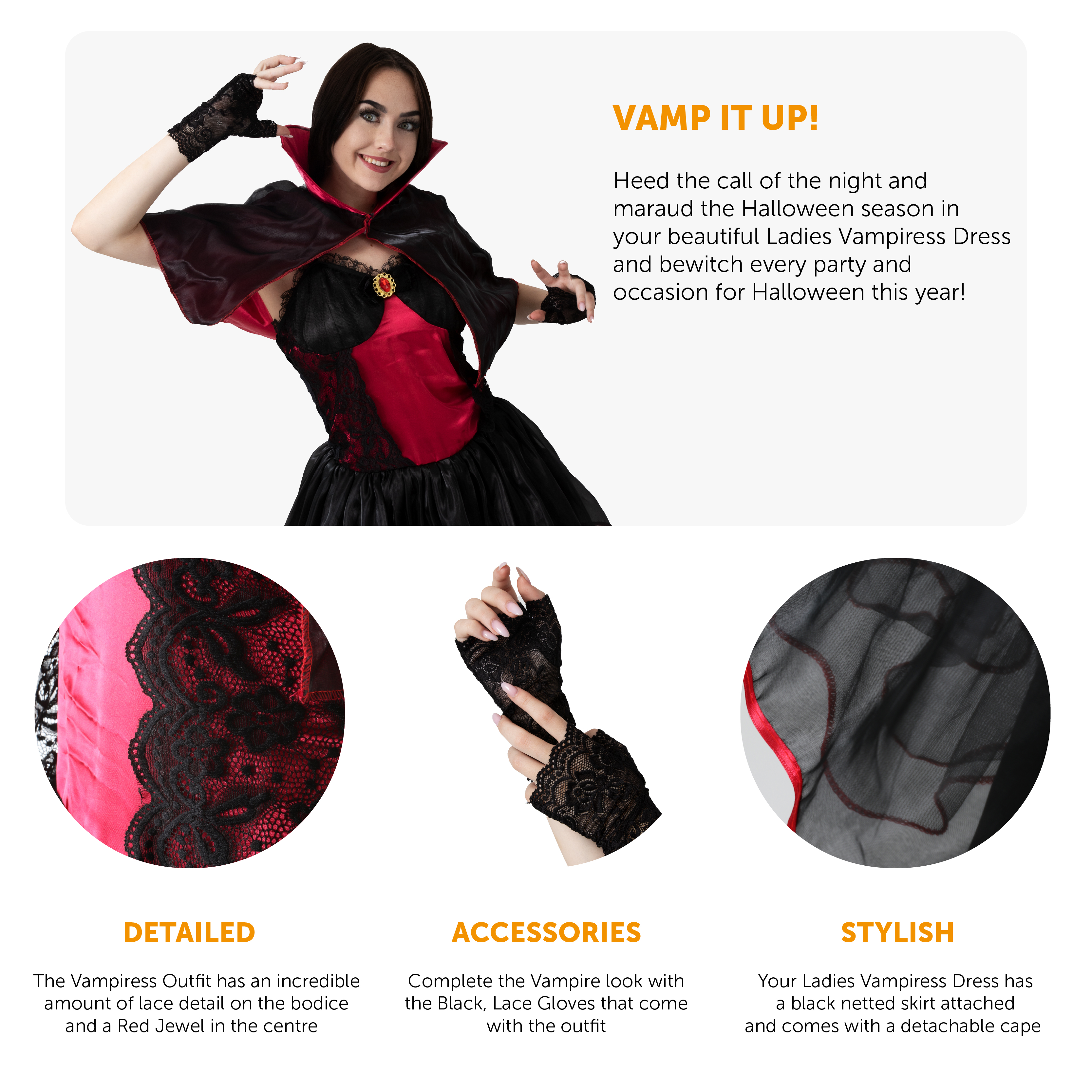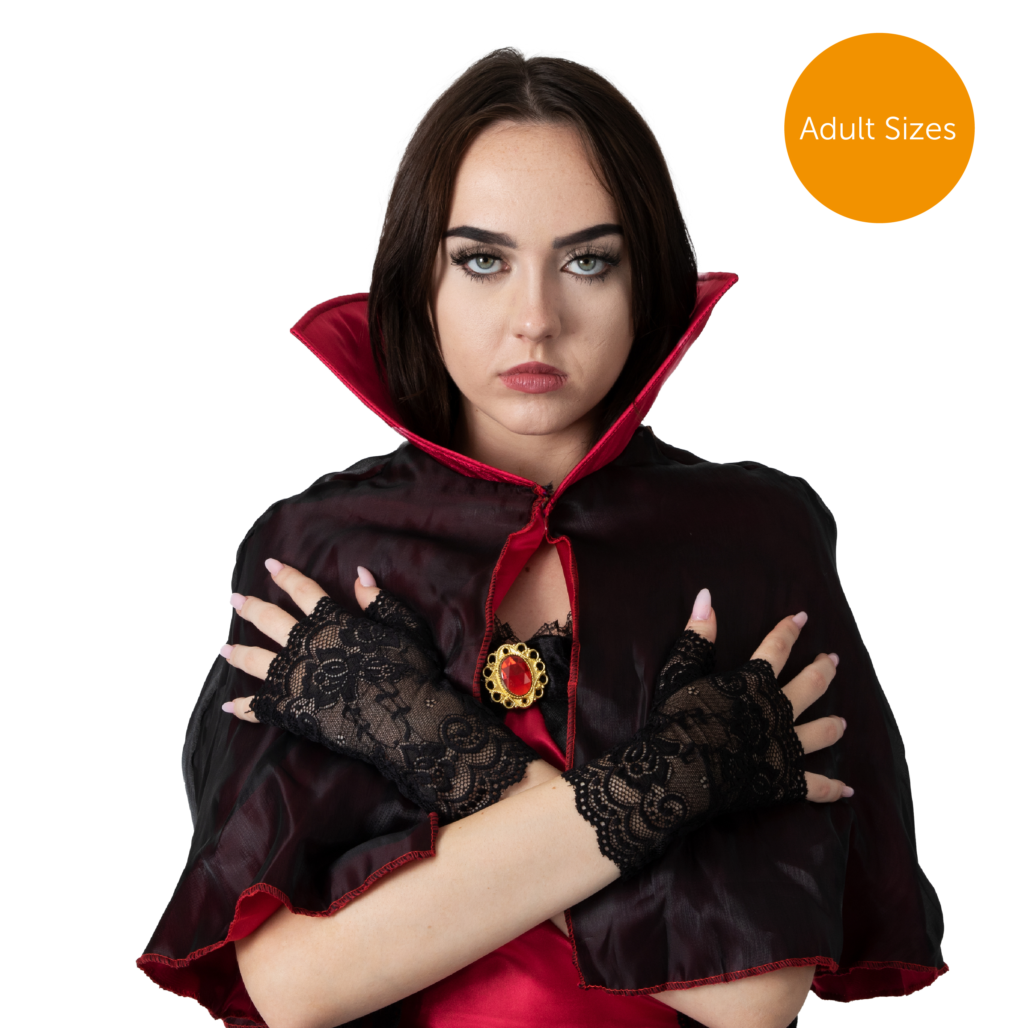 COSTUME INCLUDES: Your Ladies’ Vampiress Dress includes a Black & Red Bodice with Lace Detail, a Black Netted Skirt, a Detachable Black and Red Cape with a High Stand Collar, and a pair of Black Lace Gloves!