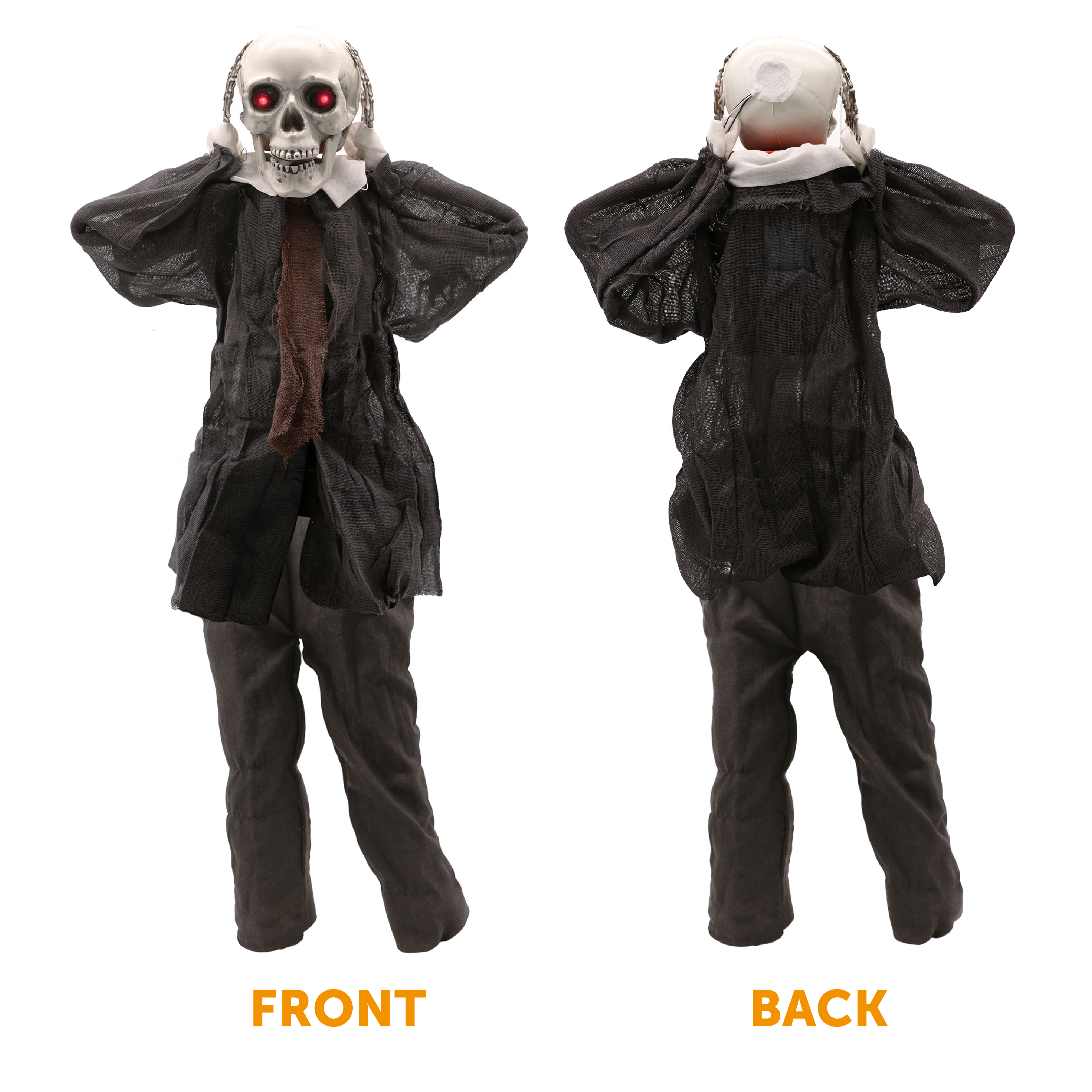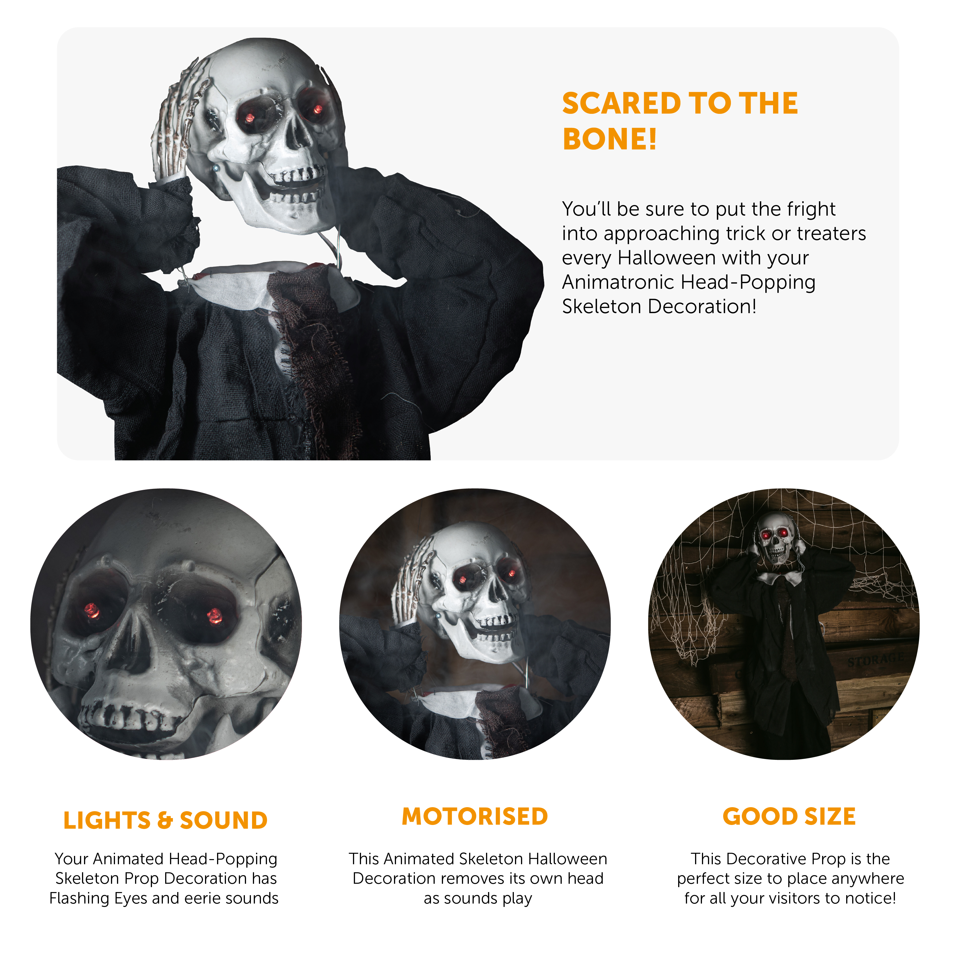 ANIMATRONIC HEAD-POPPING SKELETON PROP FEATURES: Your Animated Head-Popping Skeleton Prop Decoration has Flashing Eyes and eerie sounds to really spook your Halloween visitors! Comes with 3 AA batteries
