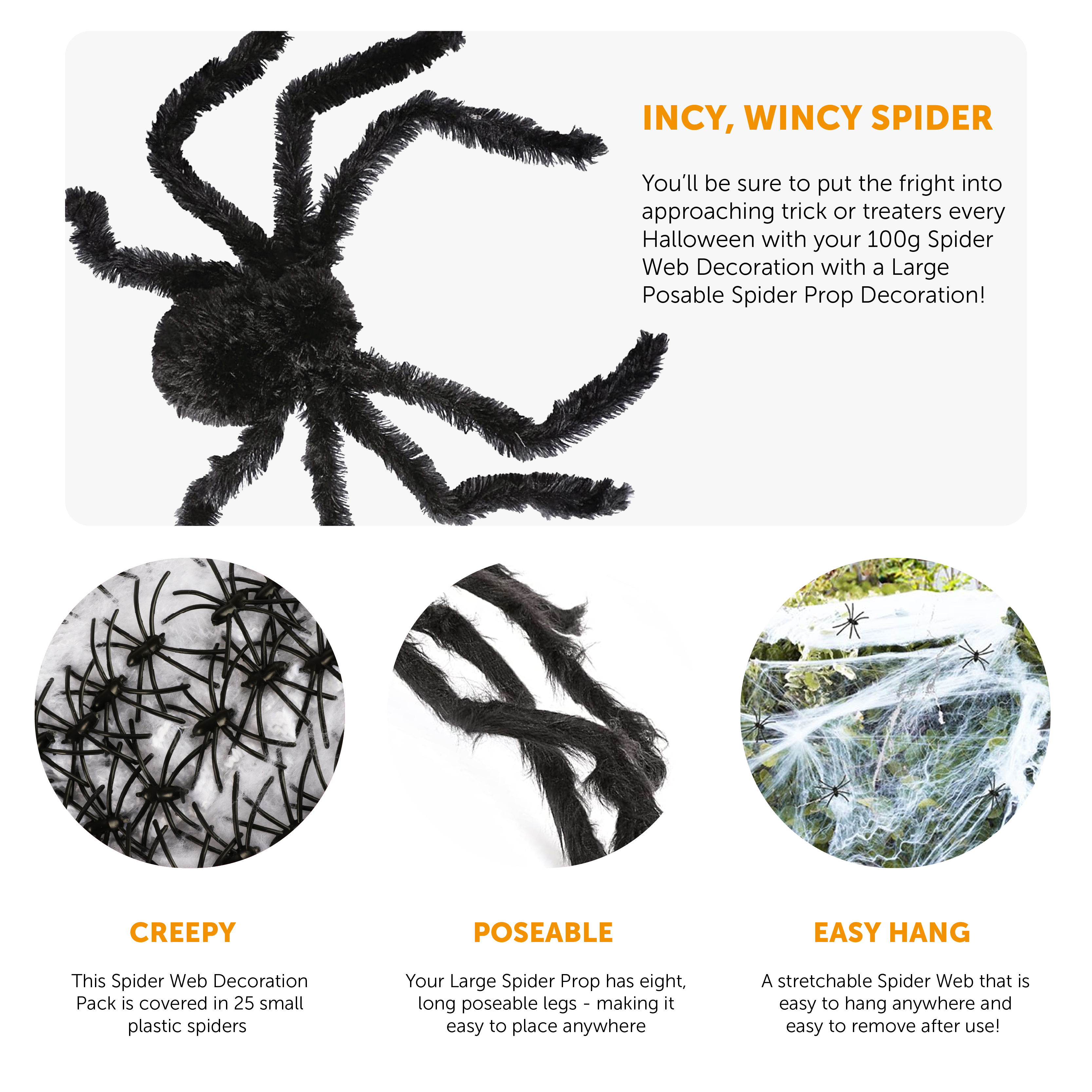 - SPIDER WEB DECORATION PACK 200G WITH 2 LARGE SPIDERS: Turn your warm cosy home into a haunted house of frights and delights with your 200g Spider Web and 50 Spiders Decoration Pack with 2 Large Poseable Spiders and bring home the Halloween feel!