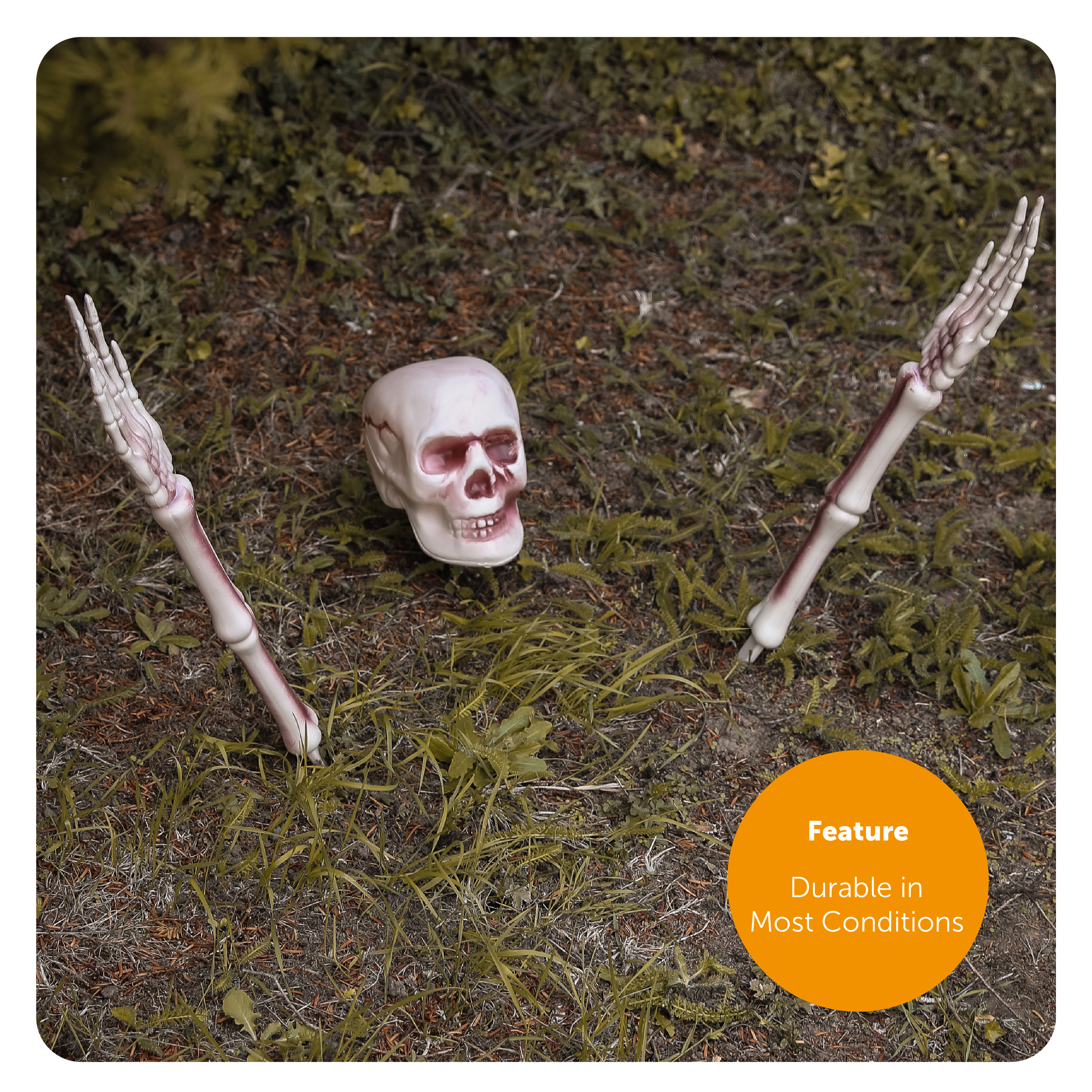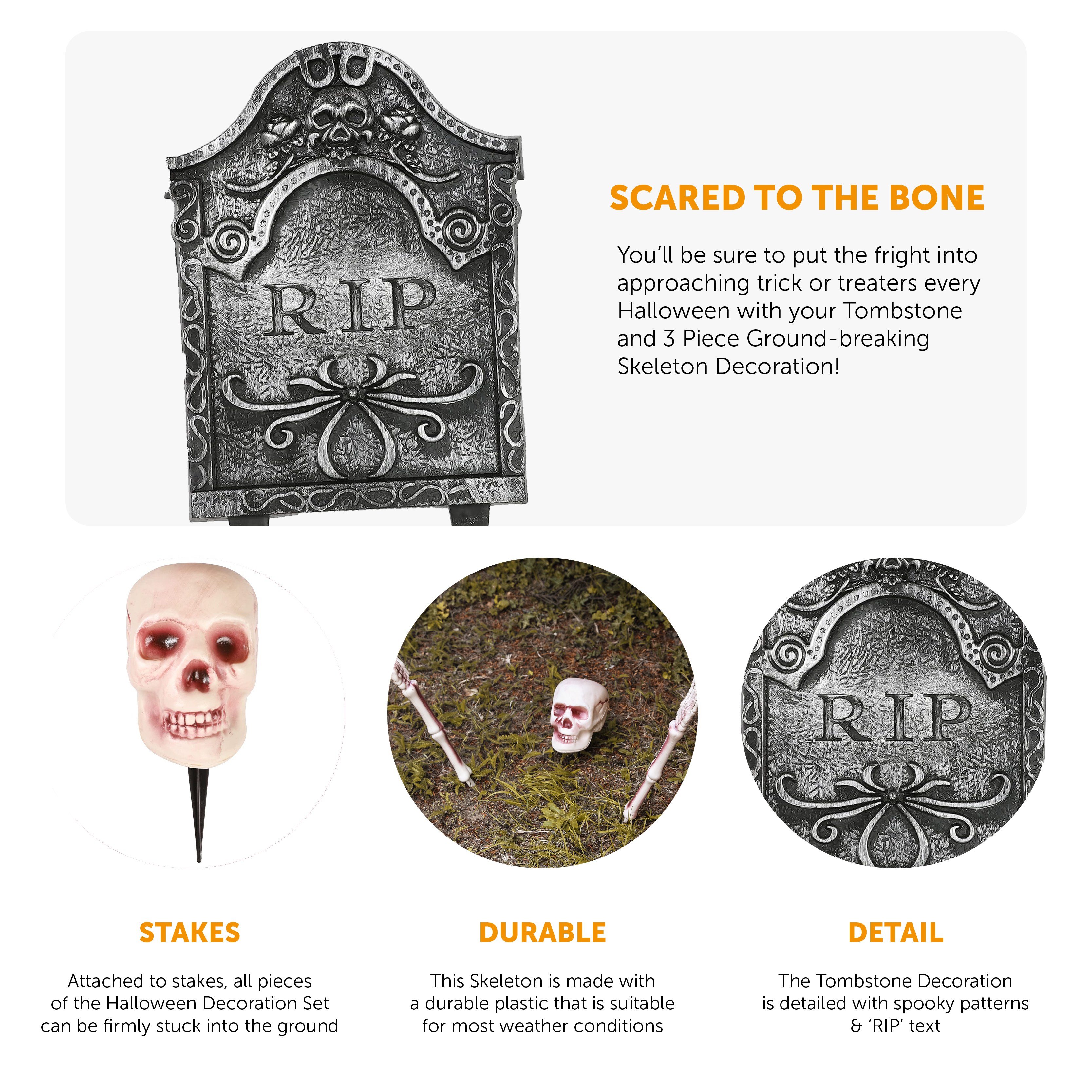 DECORATION SET INCLUDES: Your Halloween Decoration Set includes a Plastic Grey Tombstone with 'RIP' text, and a Life-Sized 3 Piece Ground-breaking Skeleton Decoration with 2 Skeleton arms, and a Skull to create a spooky Halloween environment for your House to display!