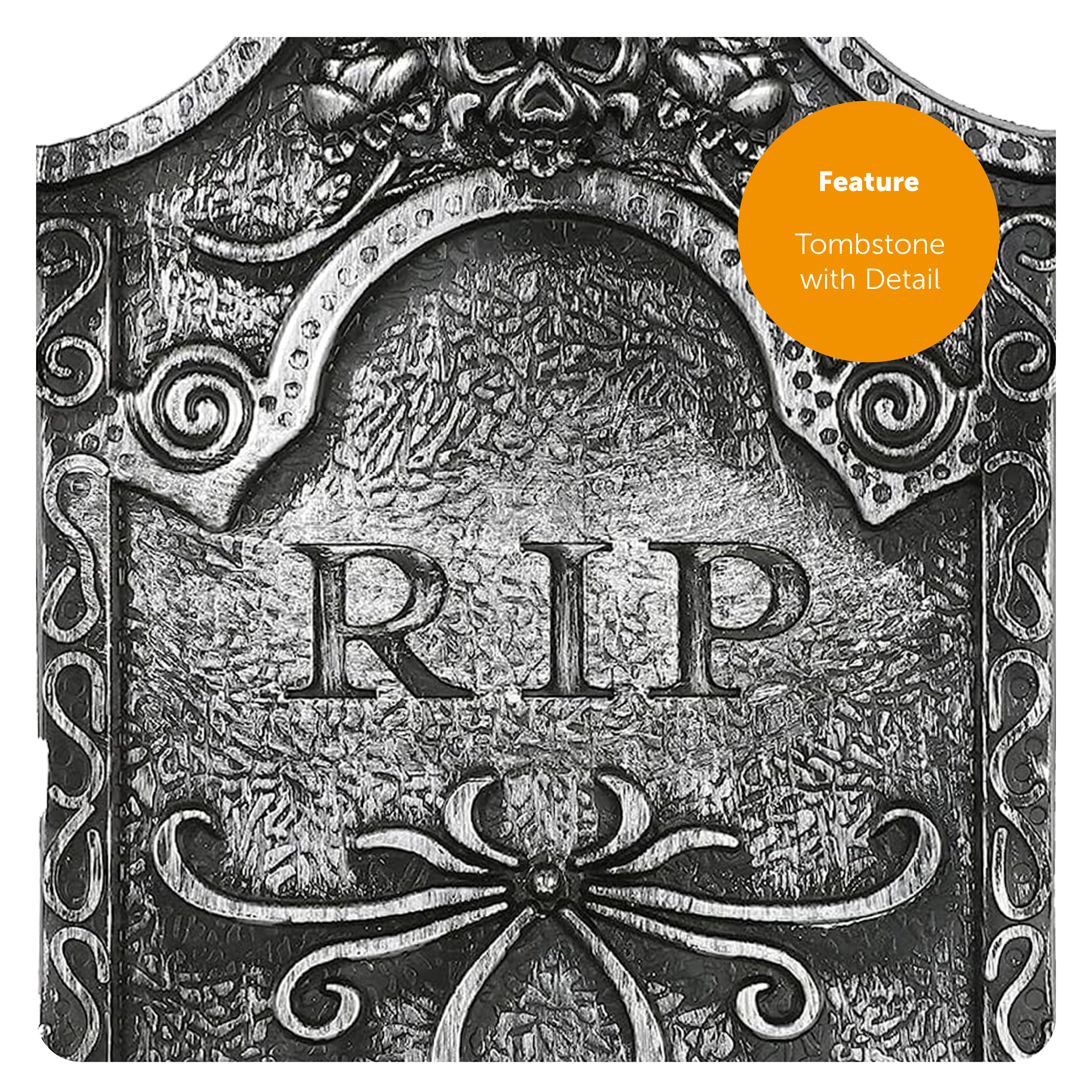 TOMBSTONE WITH 3 PIECE GROUNDBREAKING SKELETON DECORATION: You’ll be sure to put the fright into approaching trick or treaters every Halloween with your Tombstone and 3 Piece Ground-breaking Skeleton Decoration!