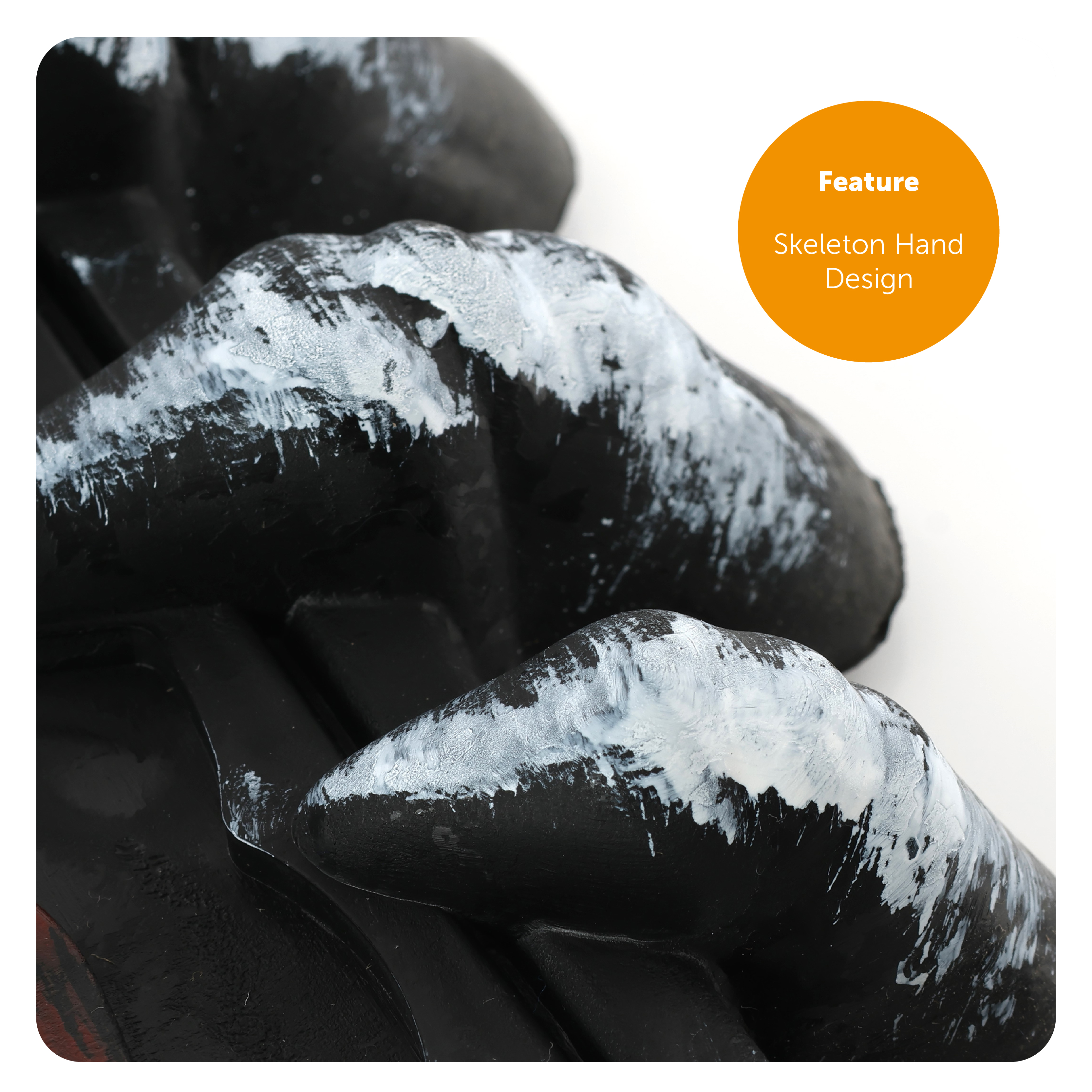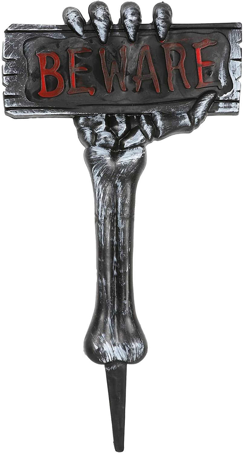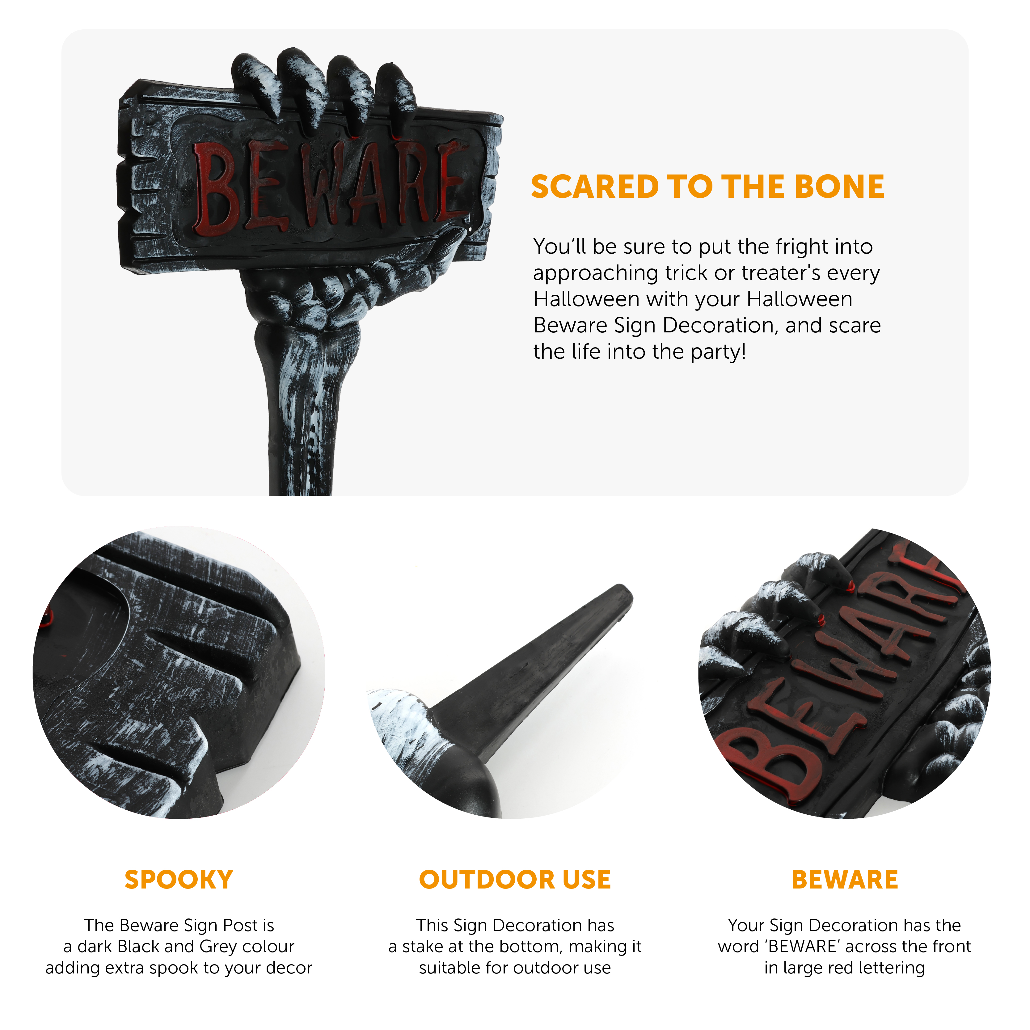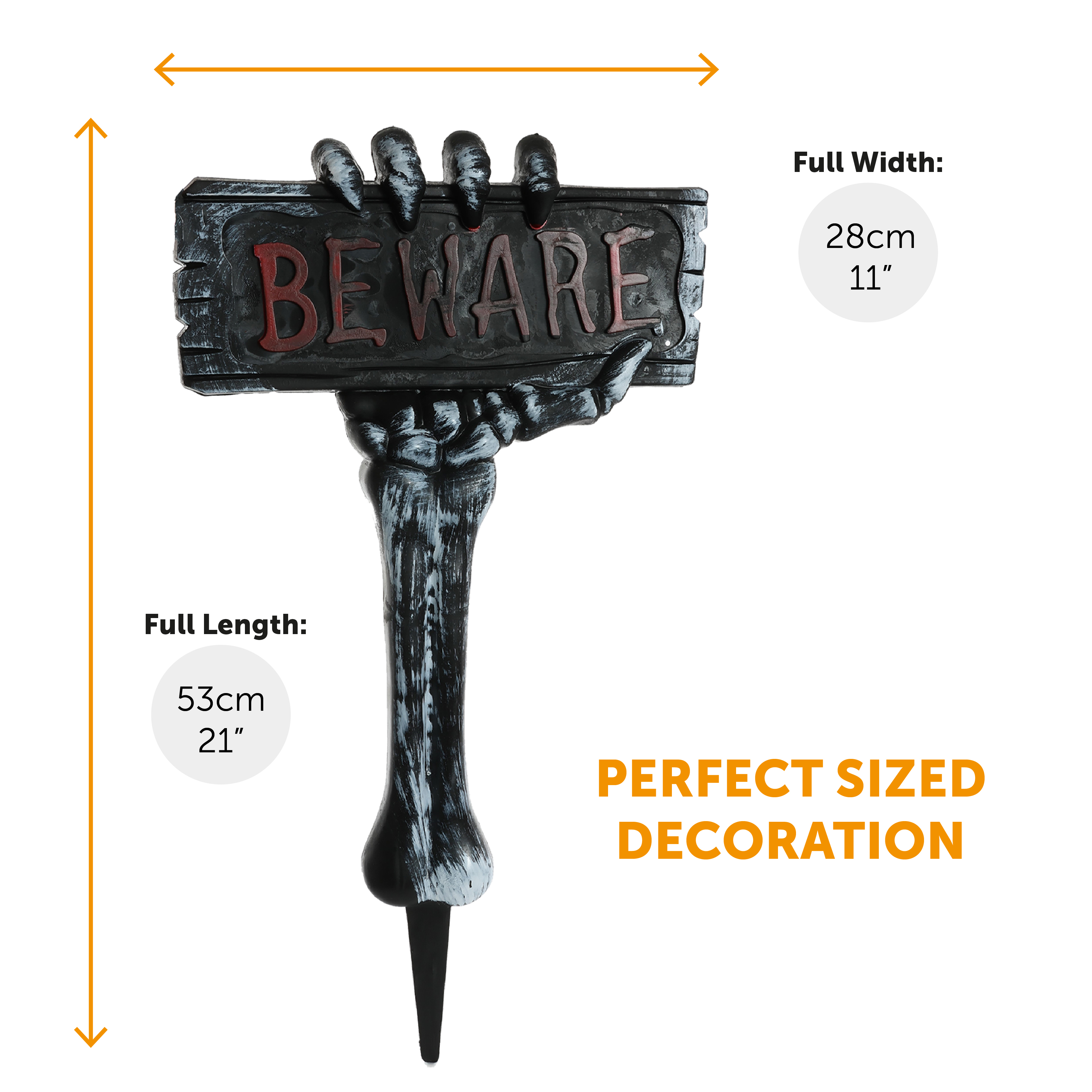 DECORATION DETAILS: Your Halloween Beware Sign is a Silver and Black Skeleton Arm, holding a Sign with 'BEWARE' printed across the front in Red text, and a plastic stake attached to the bottom to stick into the ground!